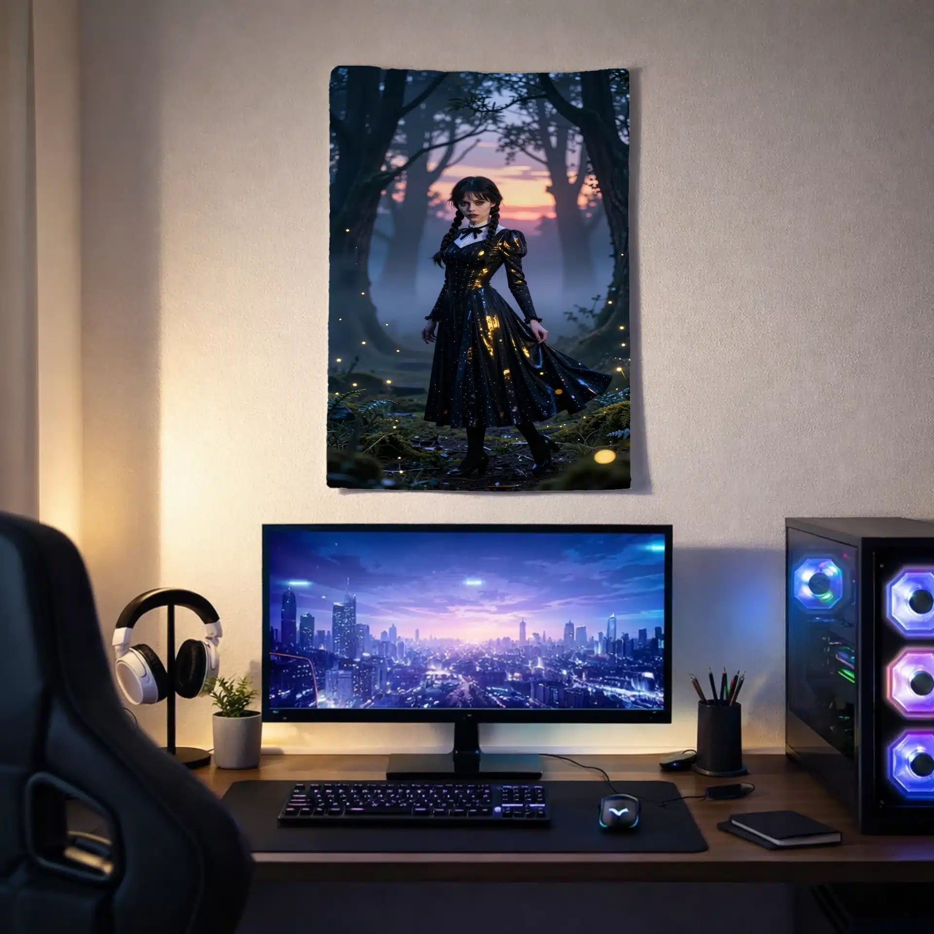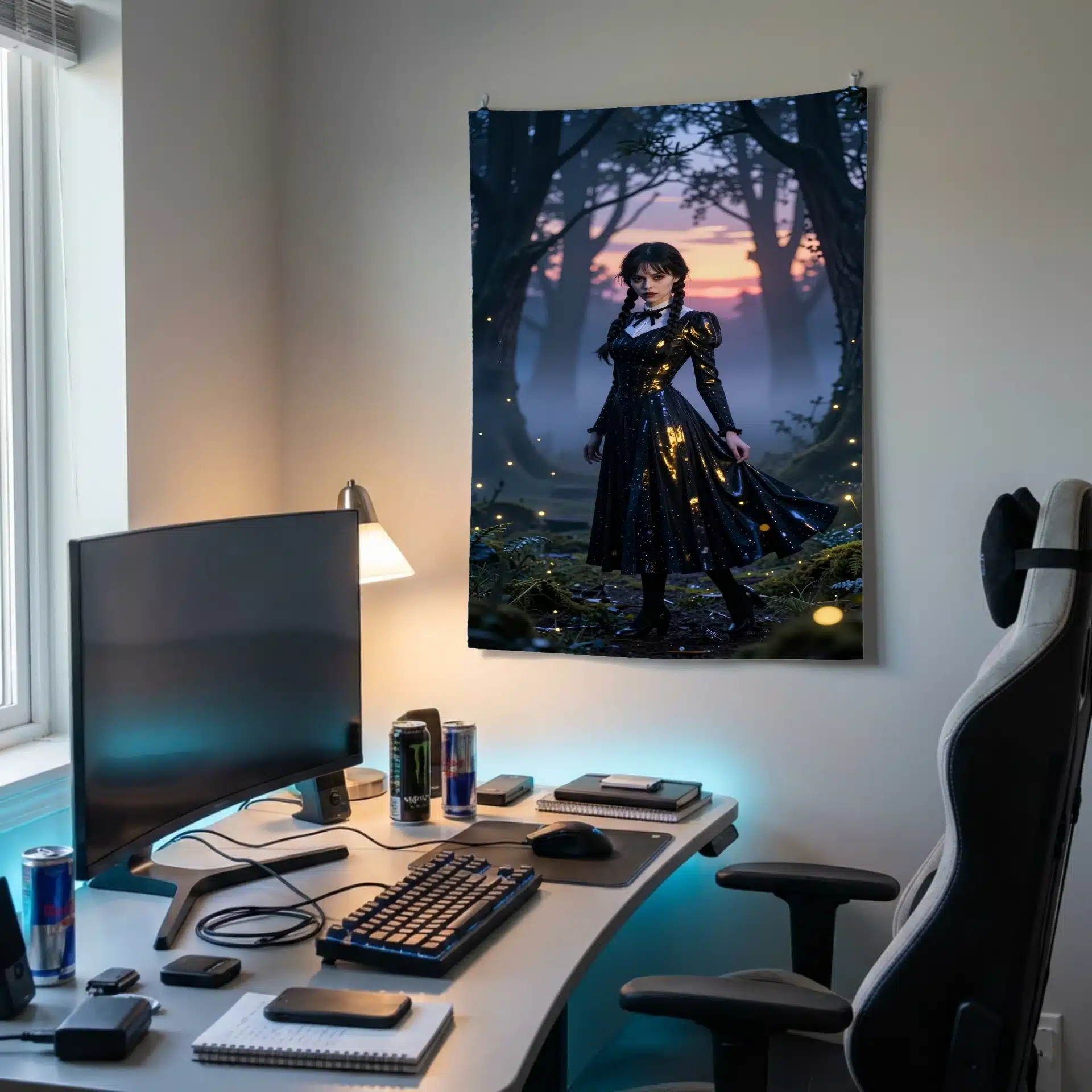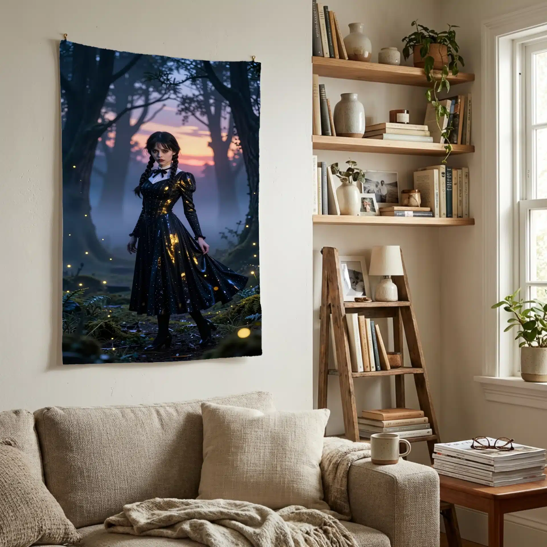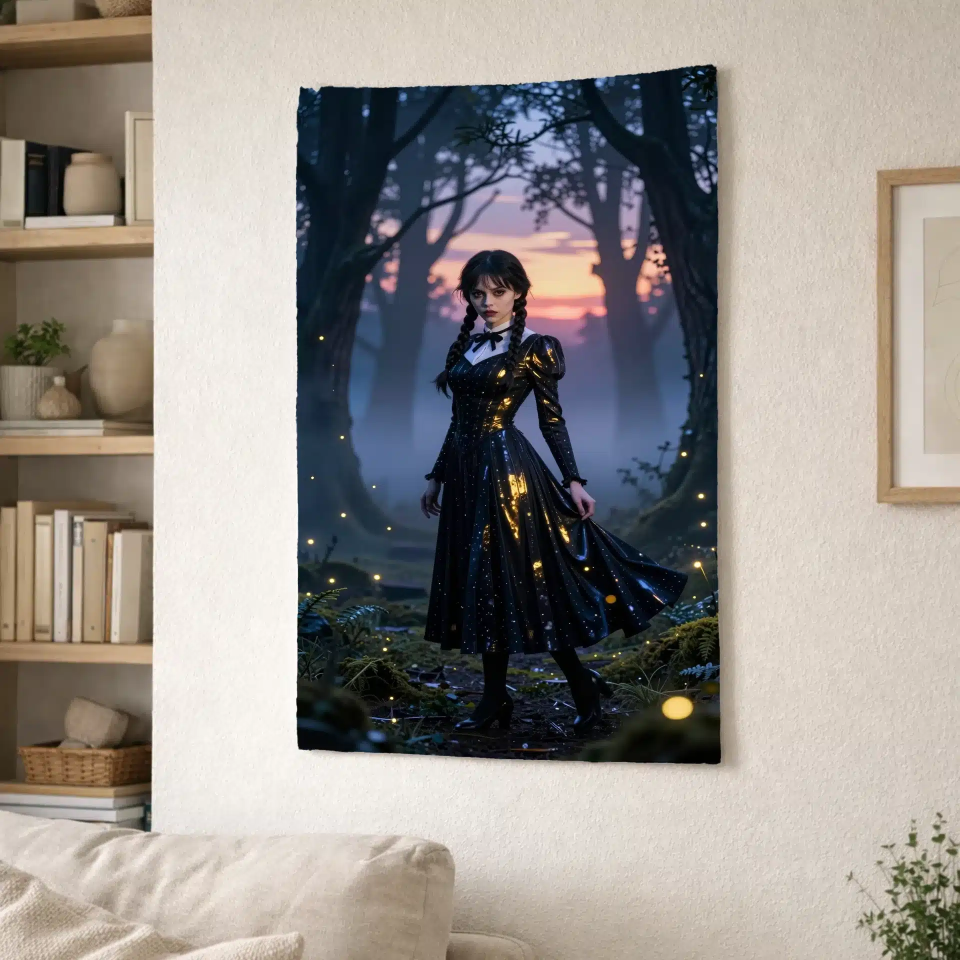 ونزدی آدامز در یک جنگل افسونشده و مهآلود در گرگومیش غروب، زیر نور سورئال غروب خورشید با هایلایتهای فلورسنت خنک ایستاده است. لباس سیاه نمادین او با ظرافت در حال حرکت است و انعکاس طلایی نور خورشید را به نمایش میگذارد، در حالی که نگاه نافذش با سایههای آبی عمیق درختان بلند تضاد زیبایی ایجاد میکند.