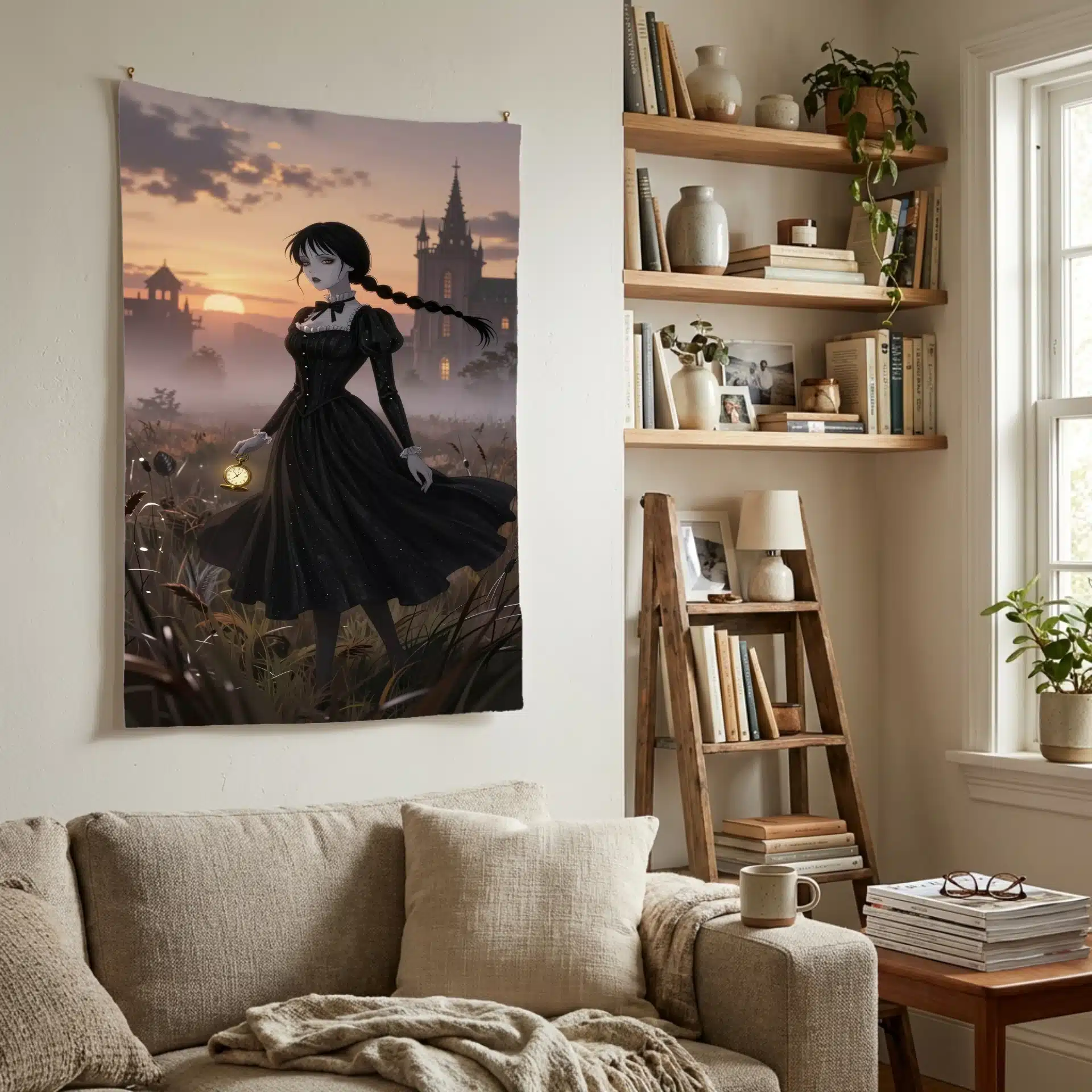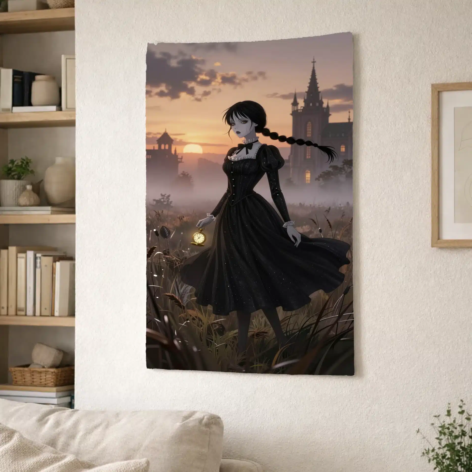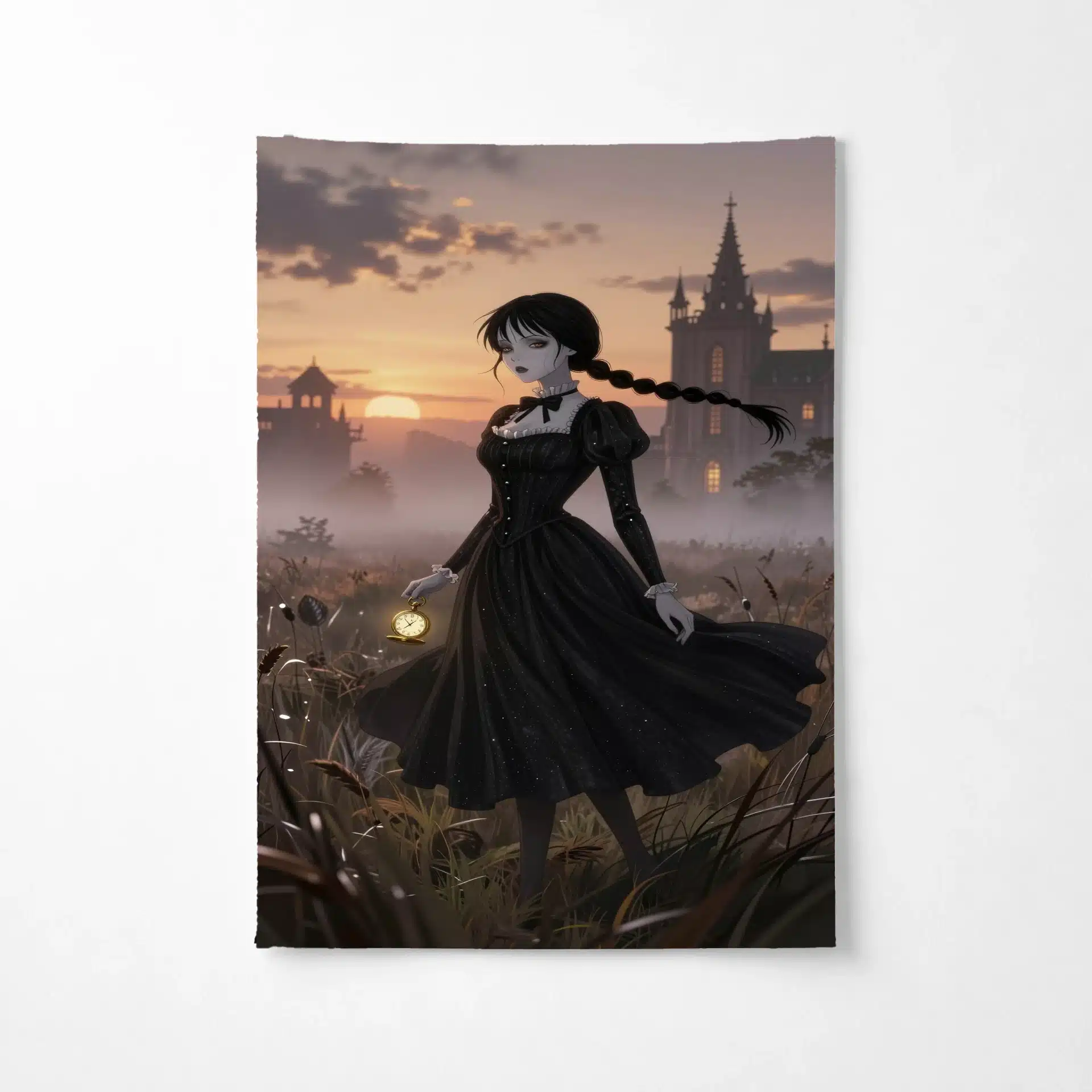 ونزدی آدامز در یک دشت مهآلود در گرگومیش ایستاده است، با لباس سیاه نمادینش که در باد بهصورتی نمایشی در حرکت است. یک ساعت جیبی طلایی در دست رنگپریدهاش میدرخشد و صحنه با ترکیبی از زیبایی ترسناک و ملانکولی گرم به تصویر کشیده شده است.