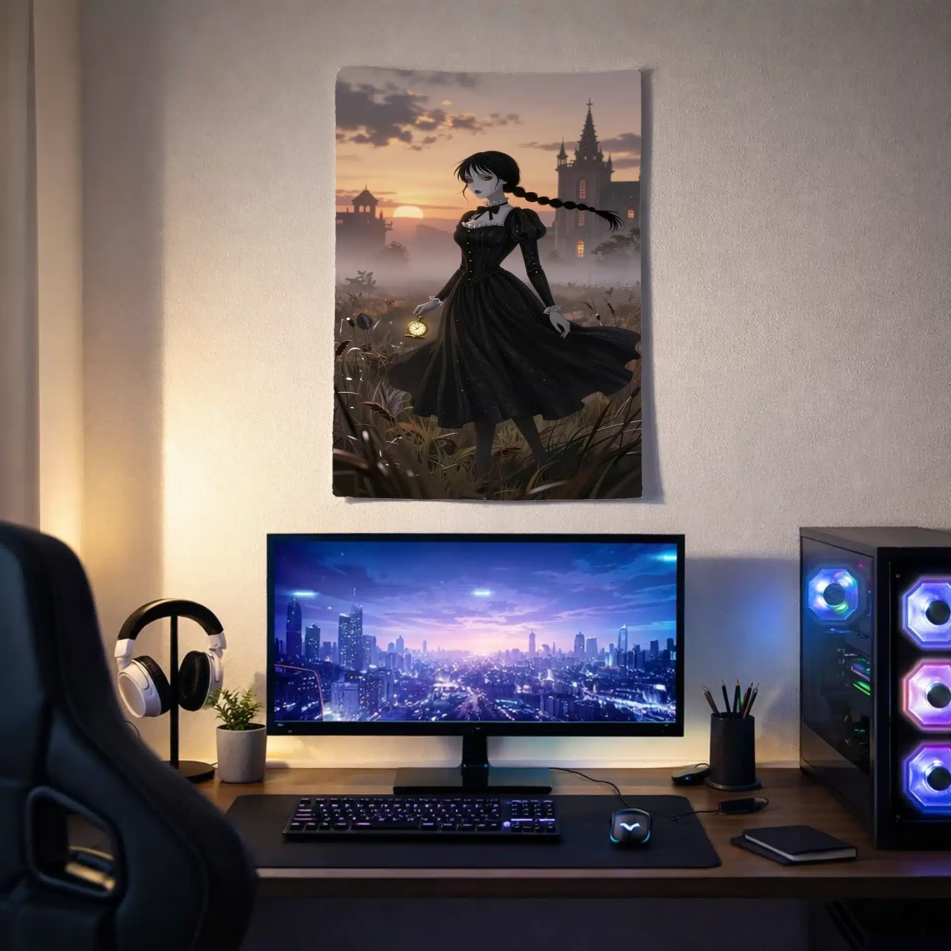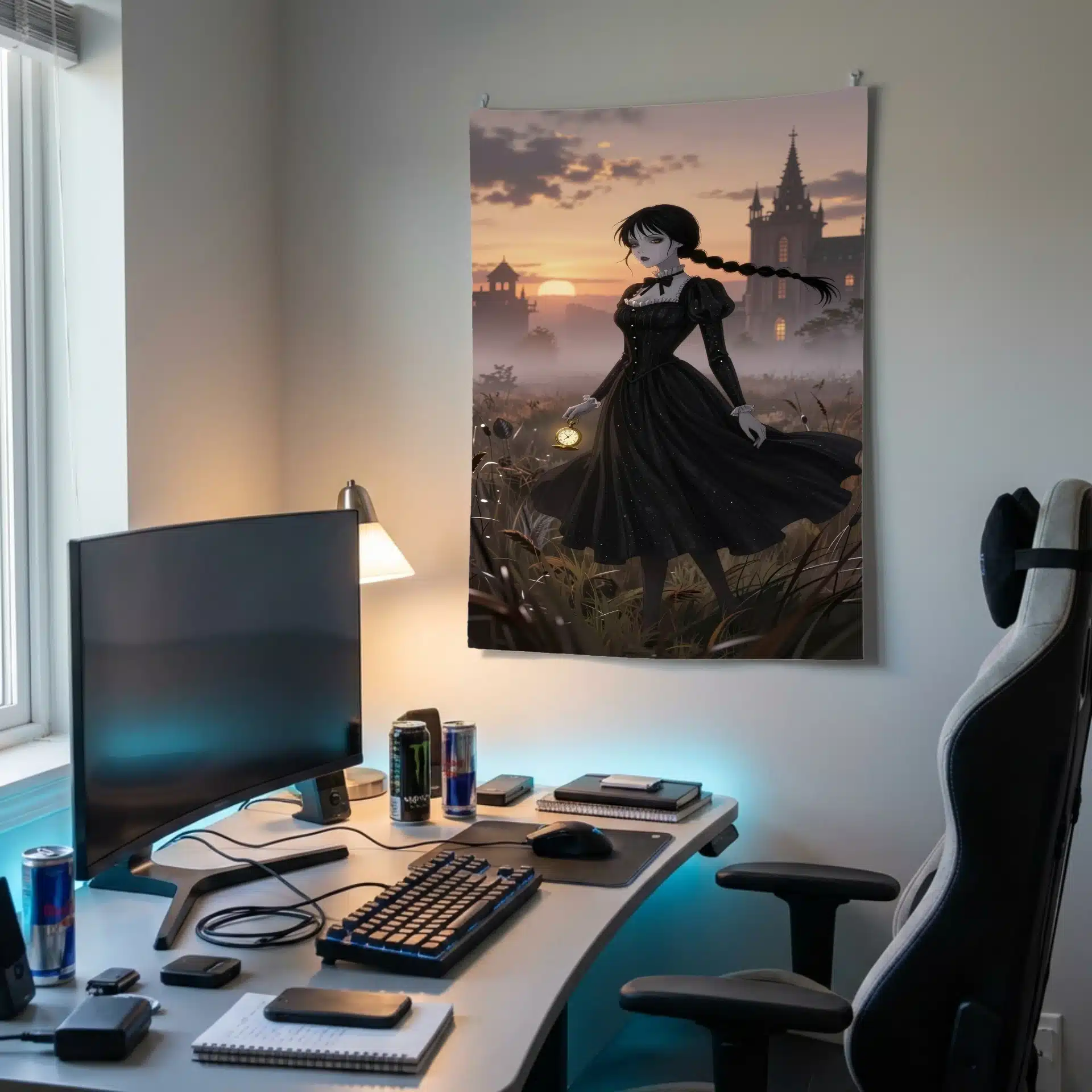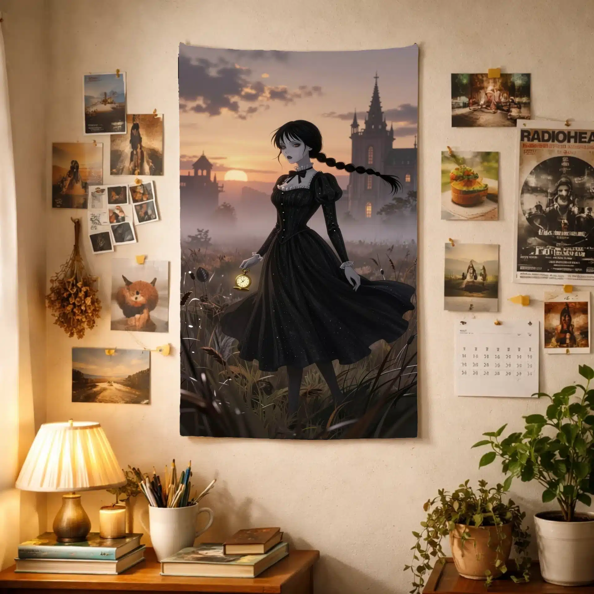 ونزدی آدامز در یک دشت مهآلود در گرگومیش ایستاده است، با لباس سیاه نمادینش که در باد بهصورتی نمایشی در حرکت است. یک ساعت جیبی طلایی در دست رنگپریدهاش میدرخشد و صحنه با ترکیبی از زیبایی ترسناک و ملانکولی گرم به تصویر کشیده شده است.