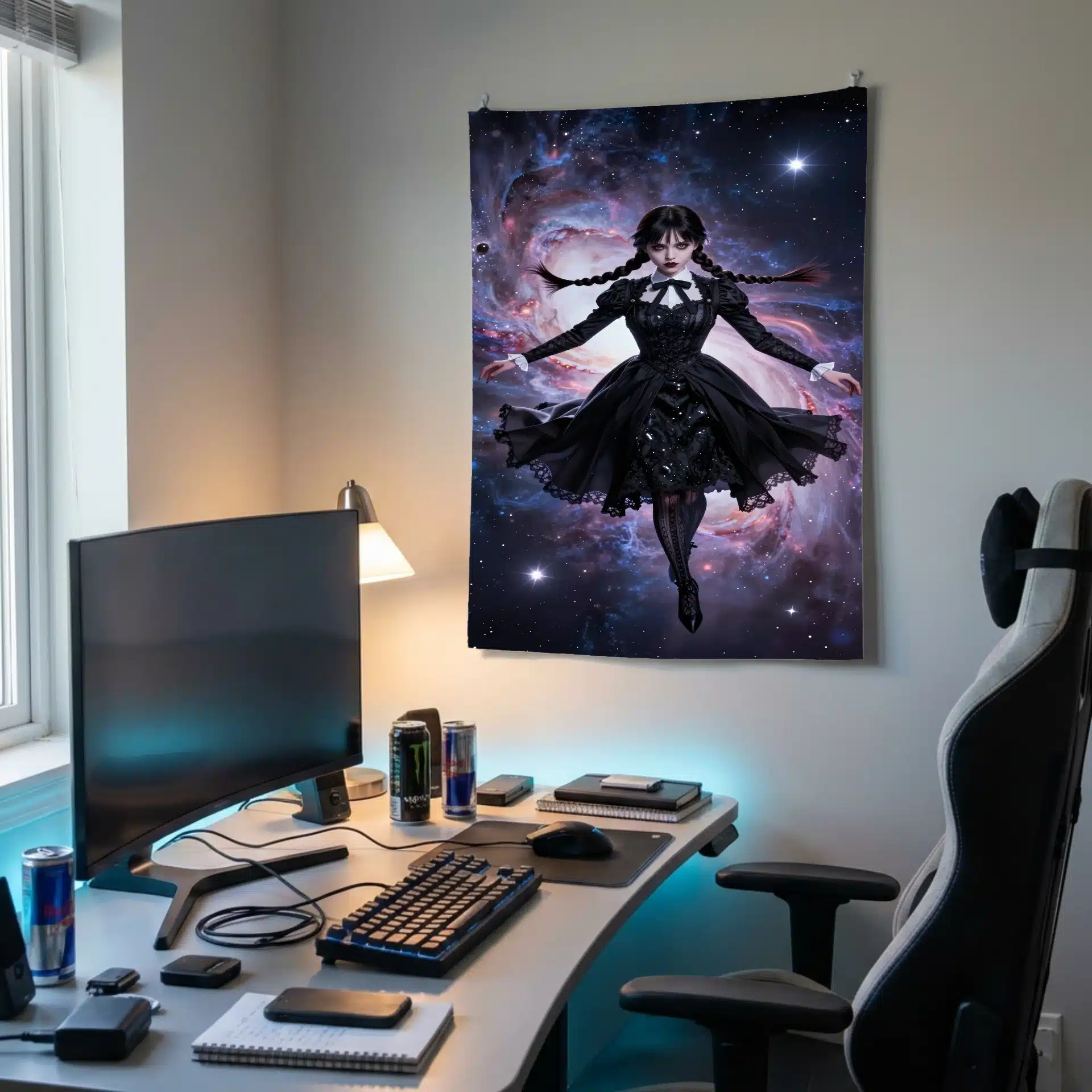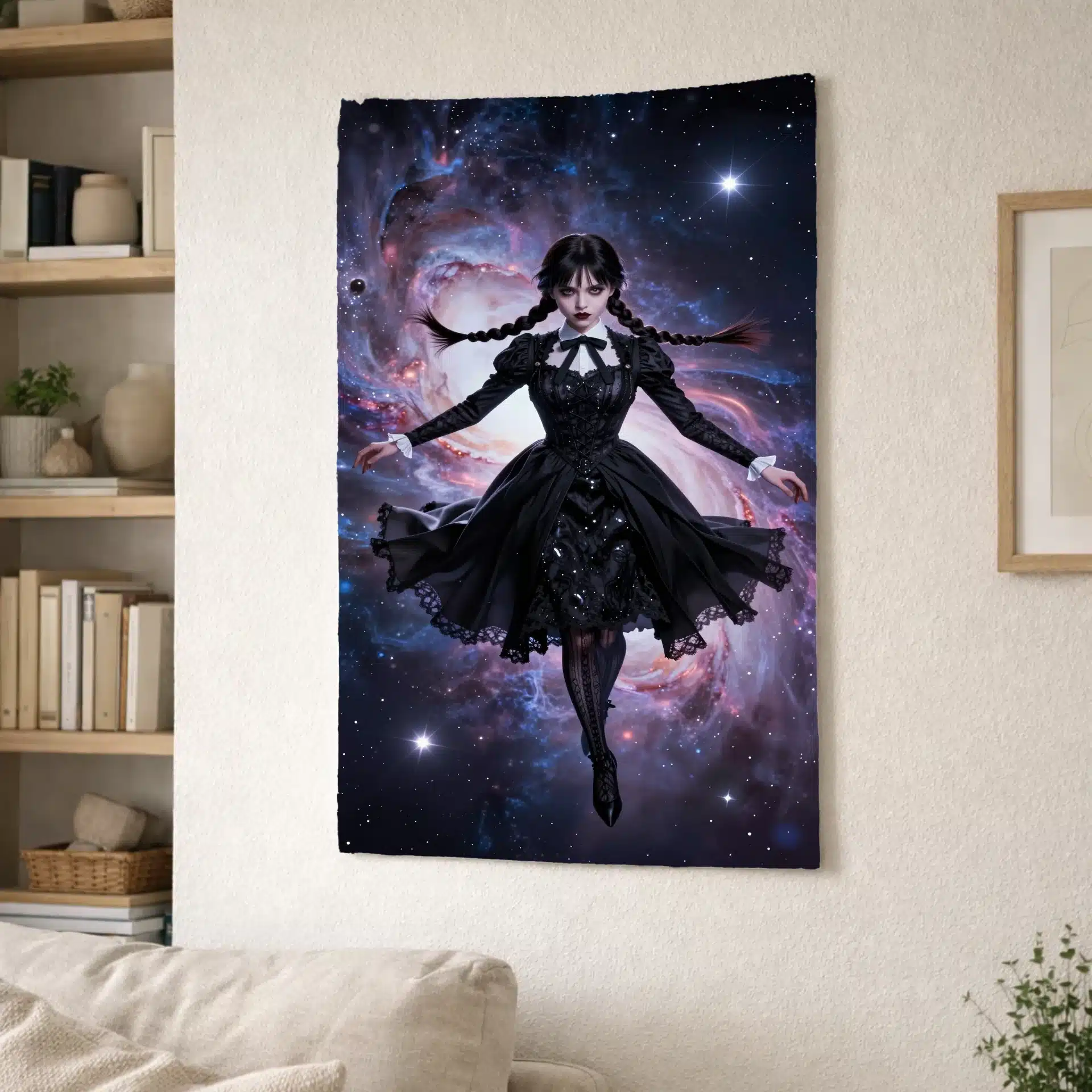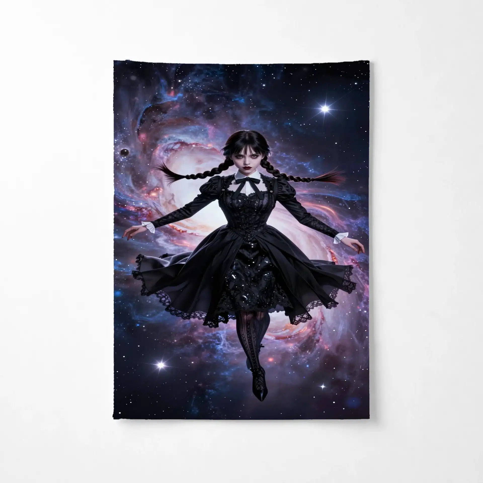 این پرچم با الهام از شخصیت ونزدی آدامز طراحی شده است که در فضای بیانتها شناور است. ترکیب زیبای سبک گوتیک و عناصر کیهانی، تصویری خیرهکننده و رویایی خلق کرده که برای علاقهمندان به این شخصیت ایدهآل است.