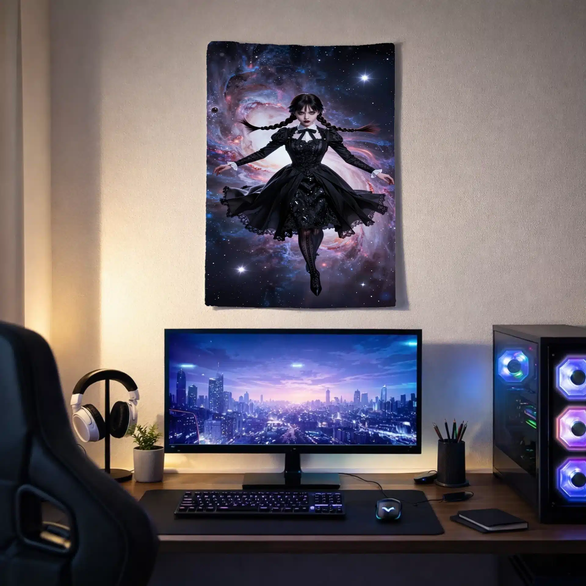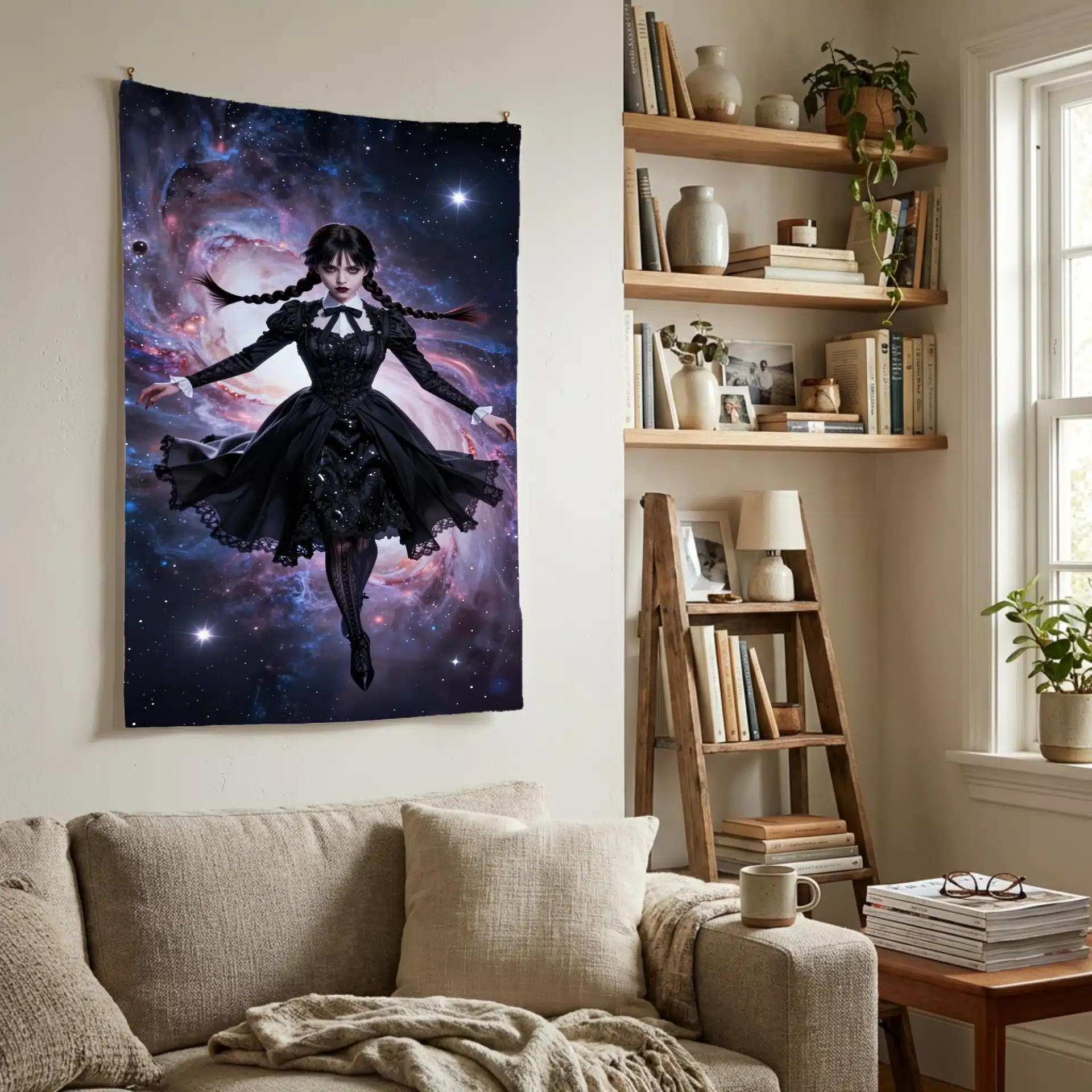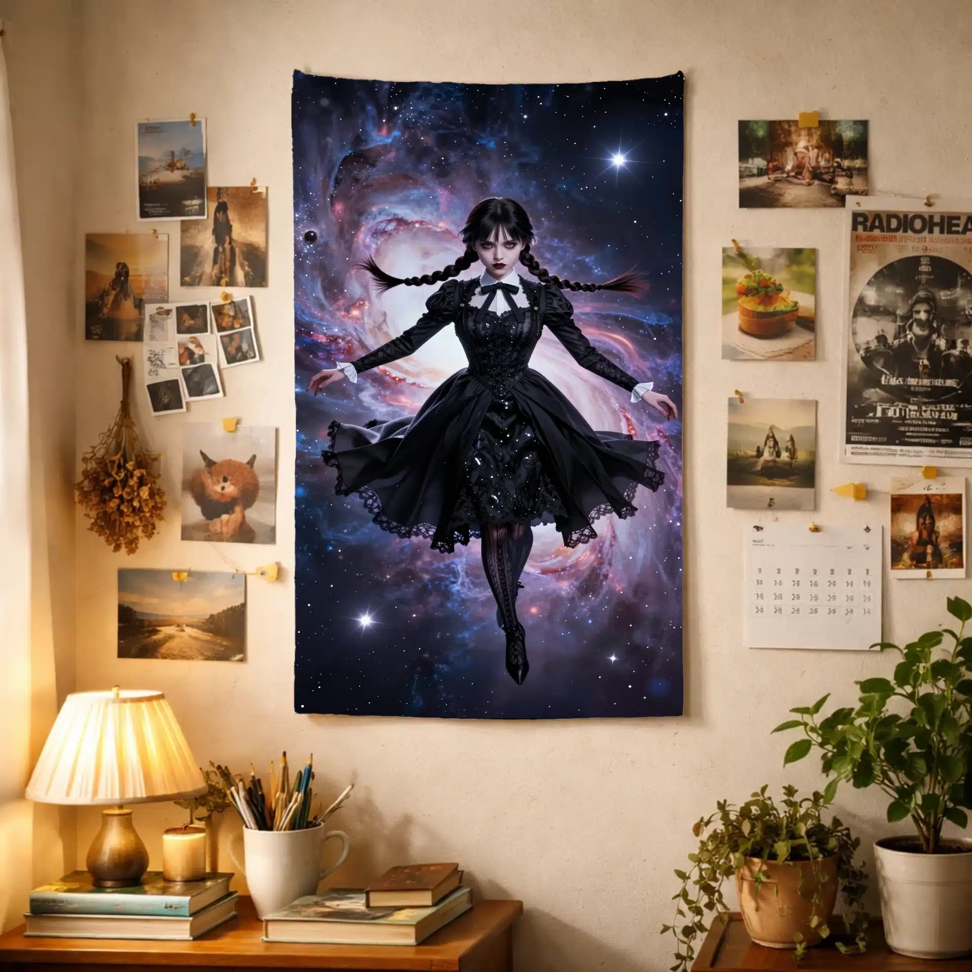 این پرچم با الهام از شخصیت ونزدی آدامز طراحی شده است که در فضای بیانتها شناور است. ترکیب زیبای سبک گوتیک و عناصر کیهانی، تصویری خیرهکننده و رویایی خلق کرده که برای علاقهمندان به این شخصیت ایدهآل است.