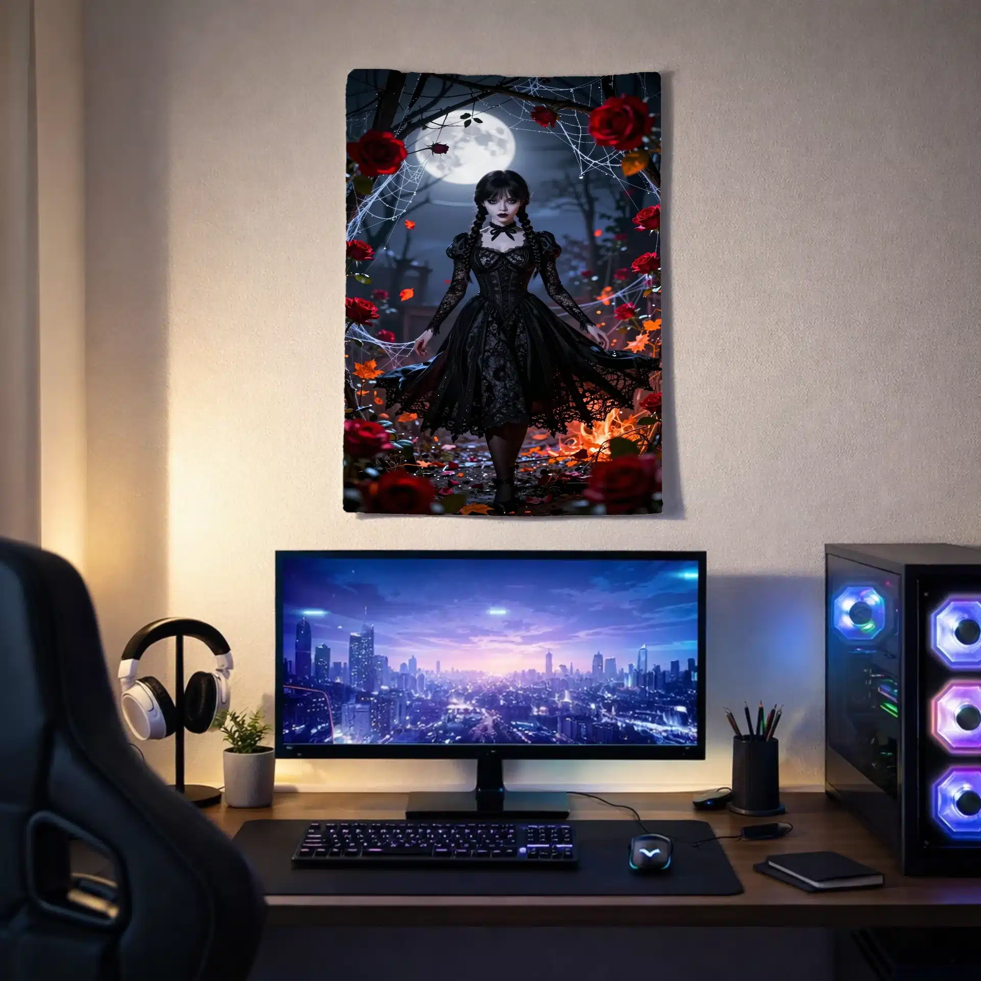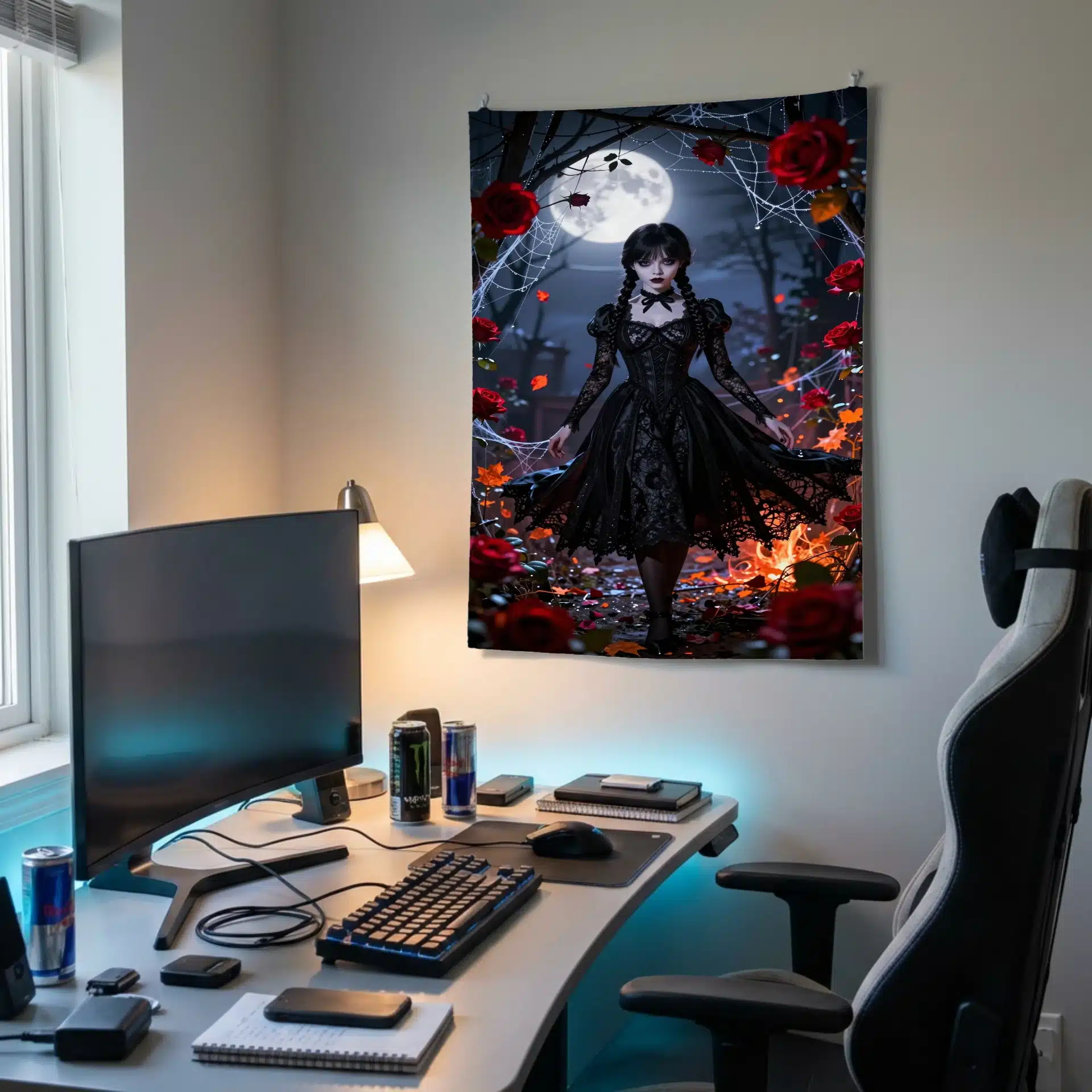 این بکدراپ خیرهکننده از ونزدی آدامز، شخصیت محبوب سریال ‘ونزدی’، صحنهای رویایی را در یک باغ اسرارآمیز به تصویر میکشد. او با لباس سیاه تزئینشده با تورهای ظریف، زیر نور مهتاب فلوئورسنت ایستاده و نگاهی نافذ و مرموز به بیننده دارد.