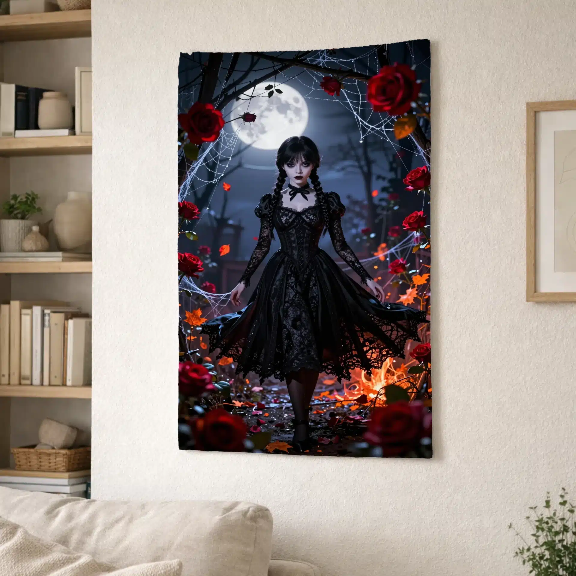 طرح با جزئیات فوقالعاده و بافتهای واقعگرایانه، شامل گلهای رز قرمز و برگهای پاییزی است که بهحالت گردابی از رنگهای سیاه و نارنجی درآمدهاند. تارهای عنکبوت با شبنم درخشان و نورپردازی سینمایی، فضایی تاریک و جذاب خلق کردهاند.