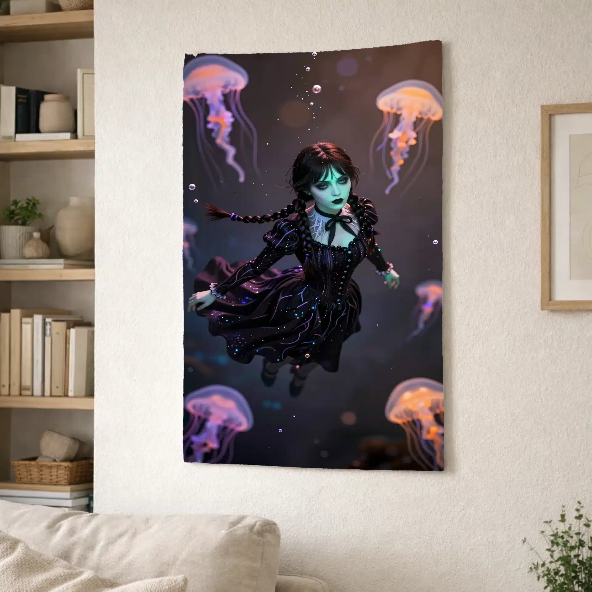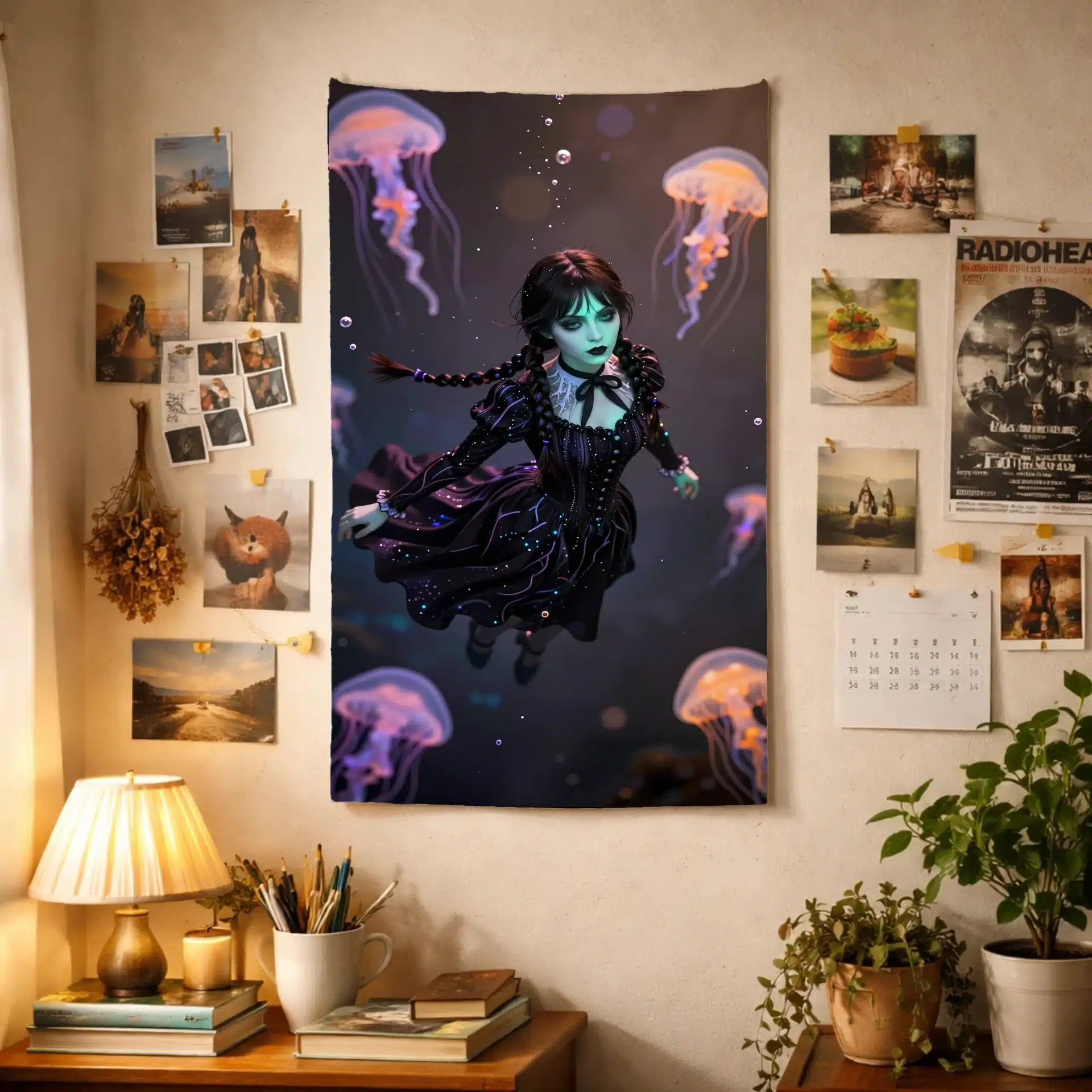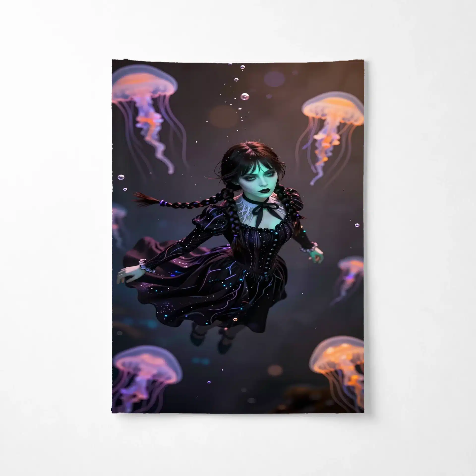 این بکدراپ خیرهکننده از ونزدی آدامز در یک صحنه زیرآبی رویایی طراحی شده است. با الهام از سبک انیمه، این تصویر ترکیبی جذاب از زیبایی گوتیک و عناصر سورئال را ارائه میدهد که برای والپیپر موبایل ایدهآل است.