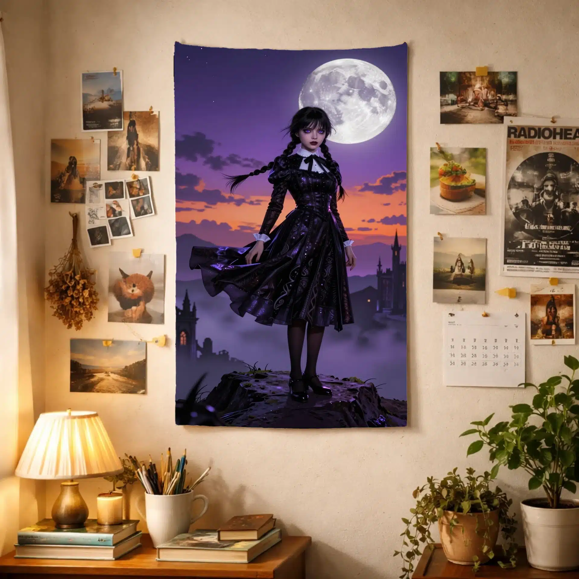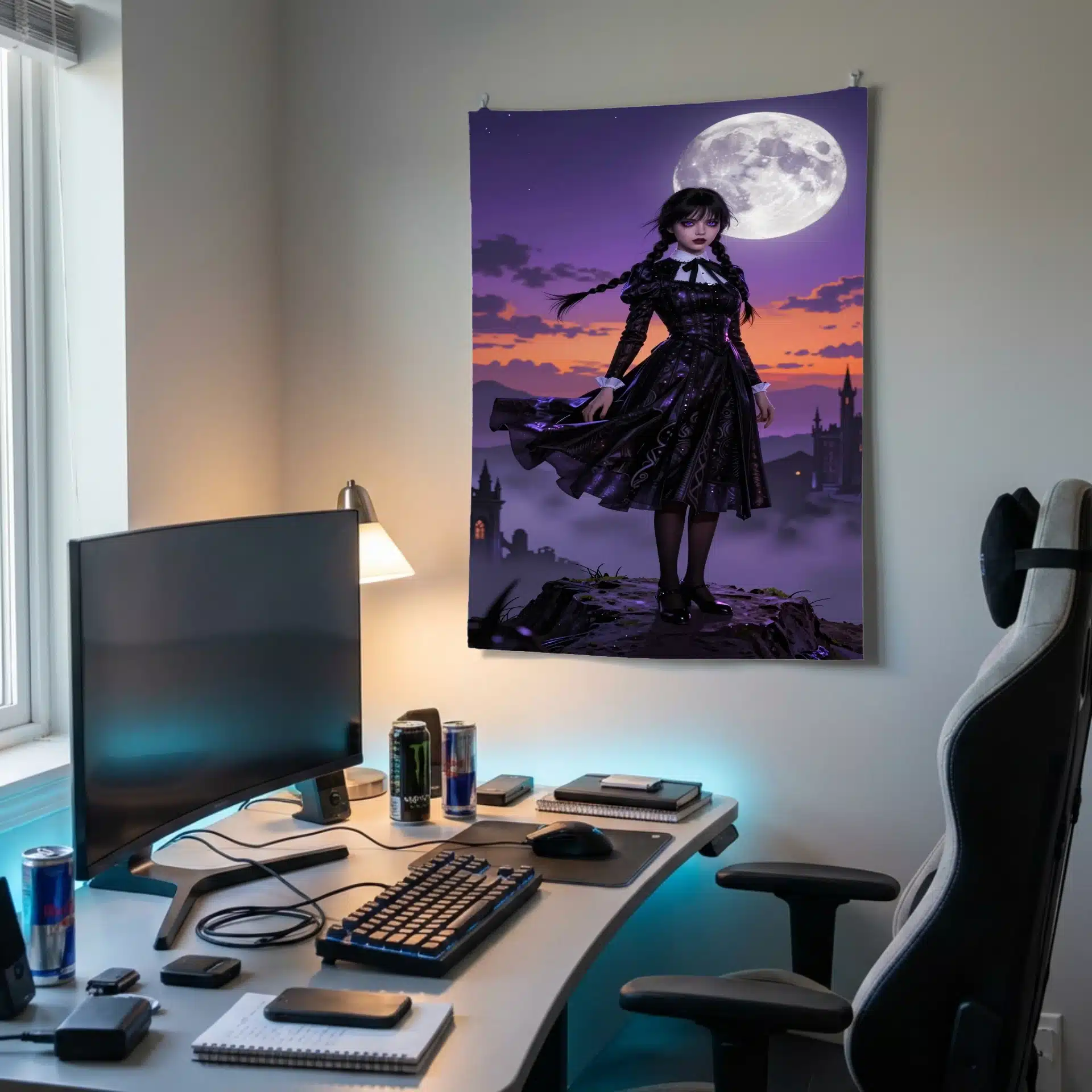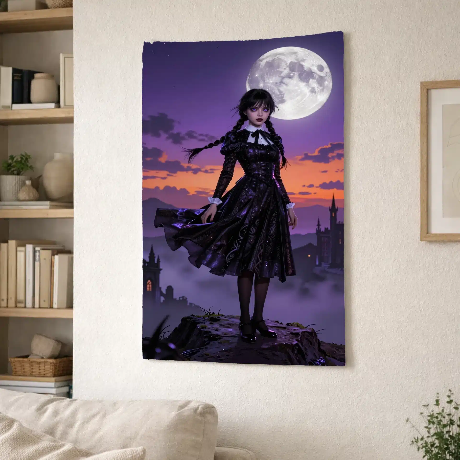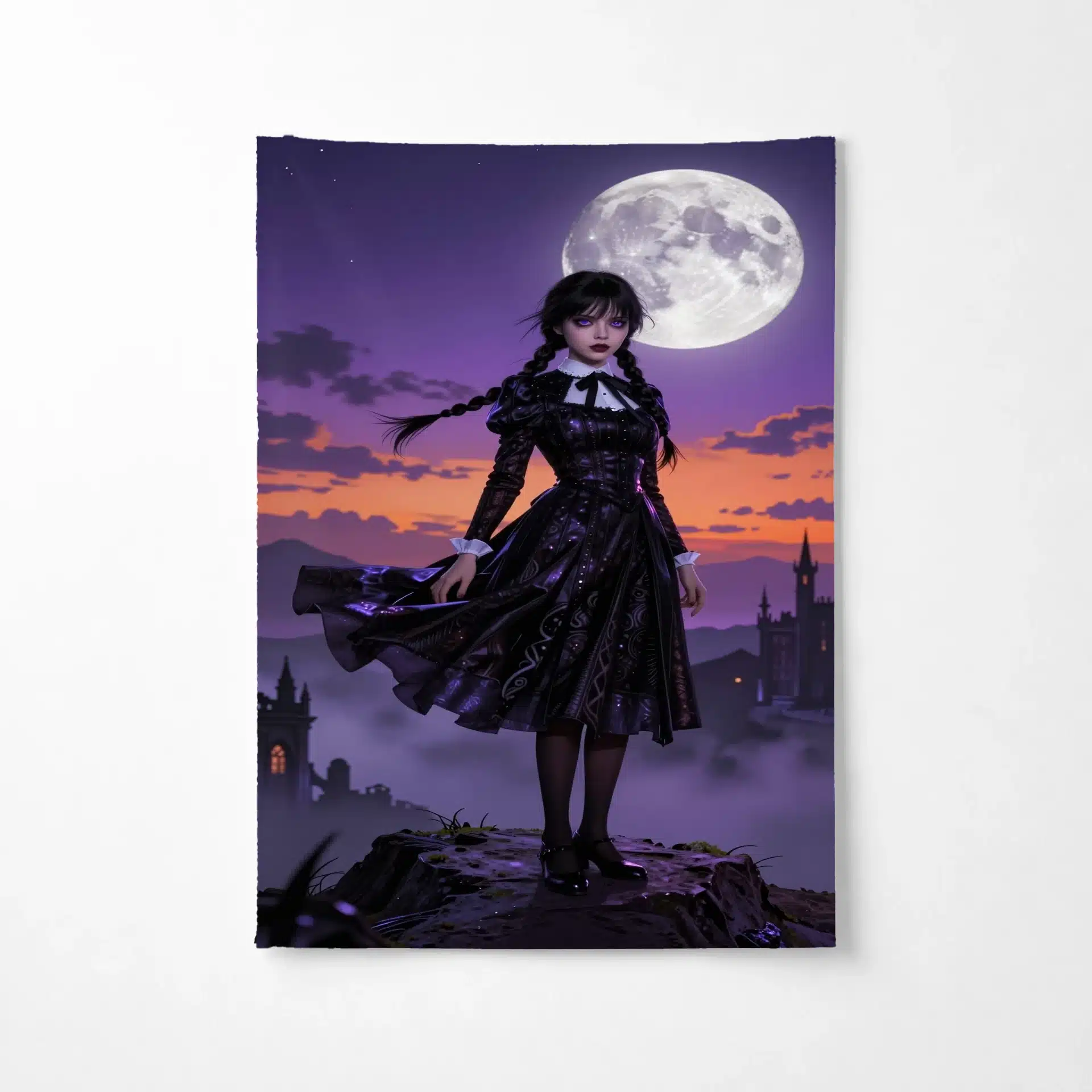 این بکدراپ خیرهکننده از ونزدی آدامز، شخصیت محبوب سریال معروف، در یک صحنه حماسی و پررمزوراز به تصویر کشیده شده است. او بر فراز قلهای ماهتابان ایستاده، با لباس سیاه نمادینش که در باد به نمایش درآمده و نور نئونی مرموزی او را احاطه کرده است.