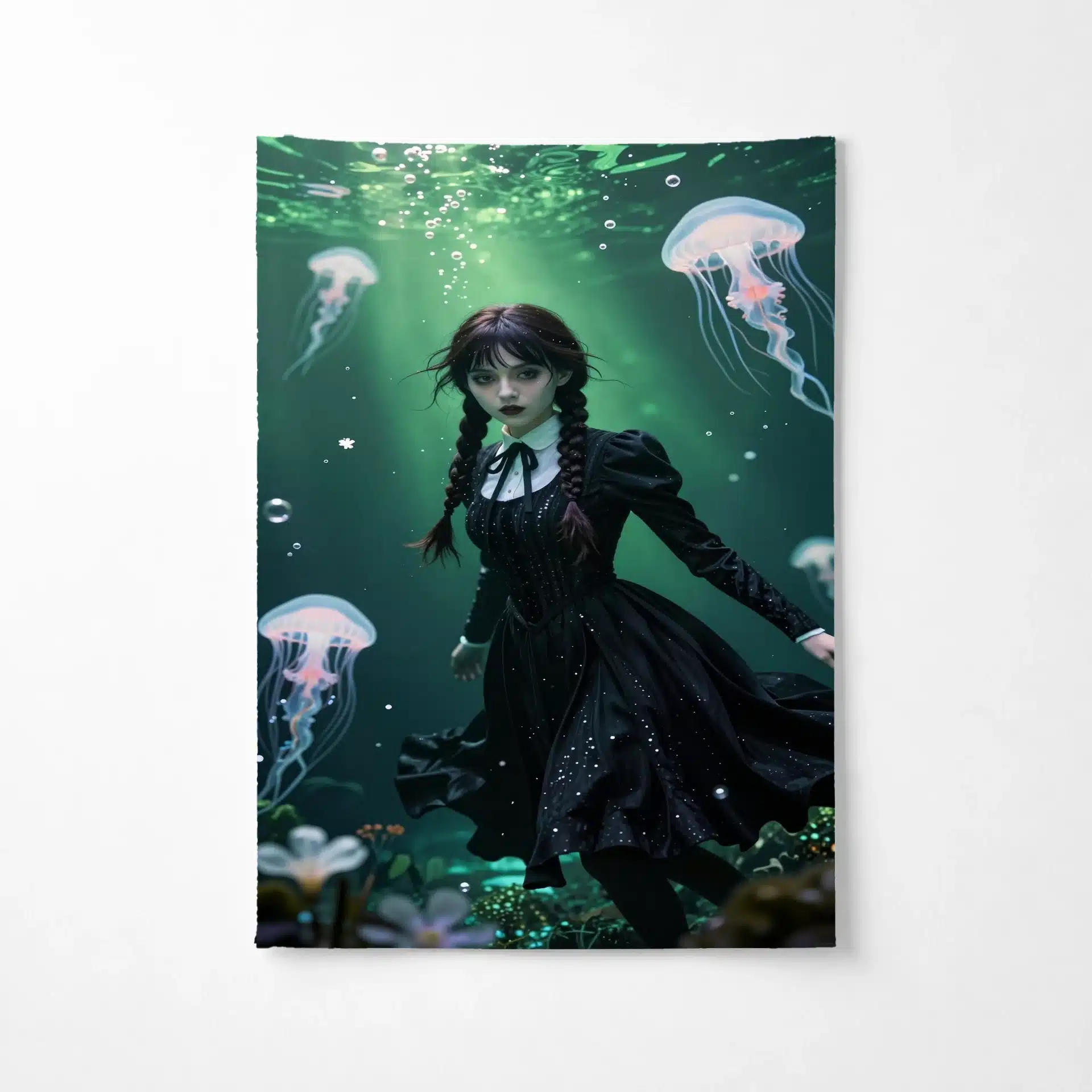این بکدراپ خیرهکننده از ونزدی آدامز، شخصیت محبوب سریال «ونزدی»، صحنهای رویایی و زیرآبی را به تصویر میکشد. با ترکیبی از زیبایی گوتیک و شگفتیهای آبزی، این اثر هنری انیمهای شما را به دنیایی جادویی و پر از نورهای بیولومینسانس میبرد.