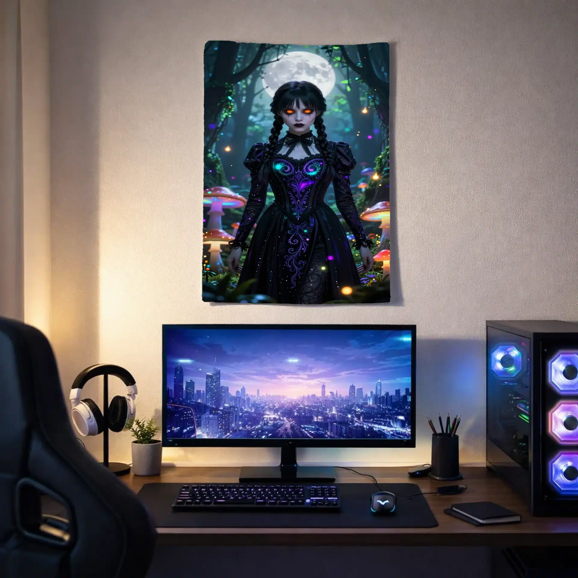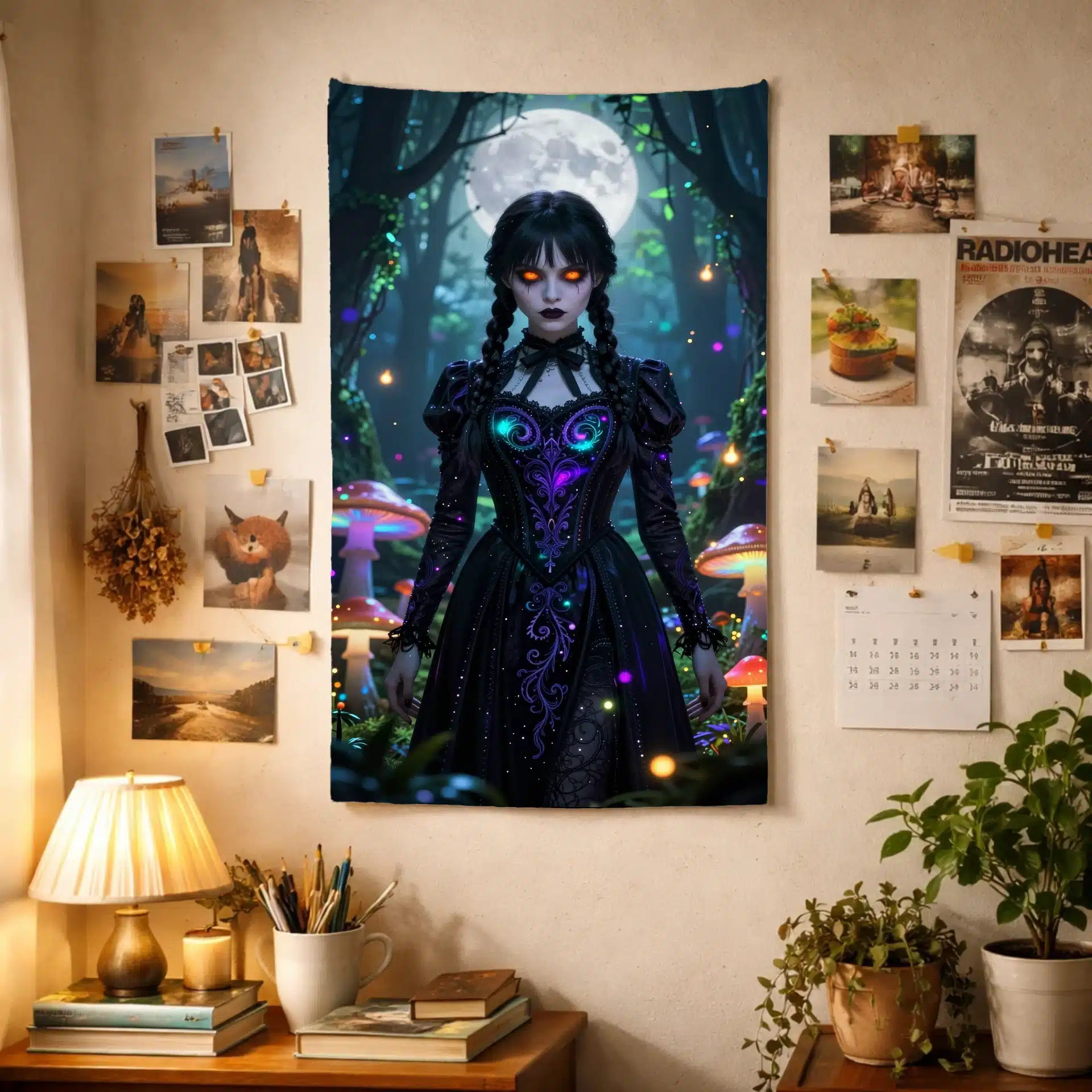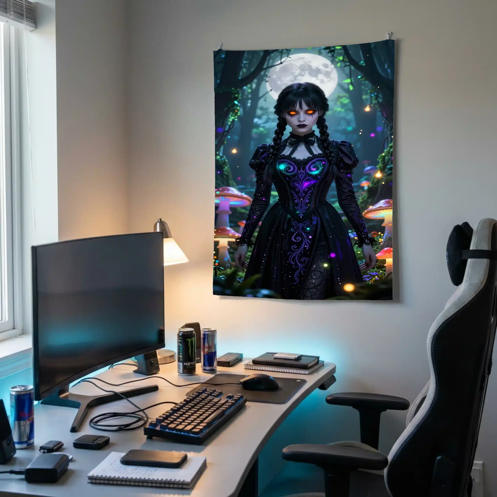 این بکدراپ خیرهکننده از ونزدی آدامز را در یک جنگل جادویی و نورانی به تصویر میکشد. با ترکیبی از فضای گوتیک و رویایی، این اثر با جزئیات فوقالعاده و نورپردازی خیرهکننده، حال و هوایی فراطبیعی و جذاب ایجاد میکند.