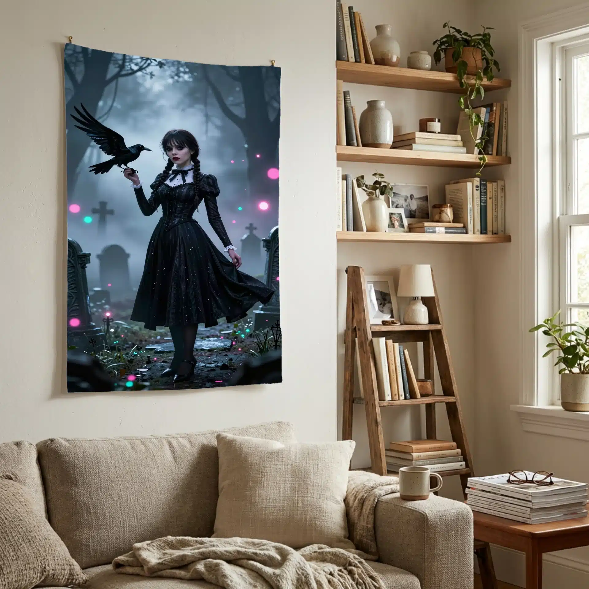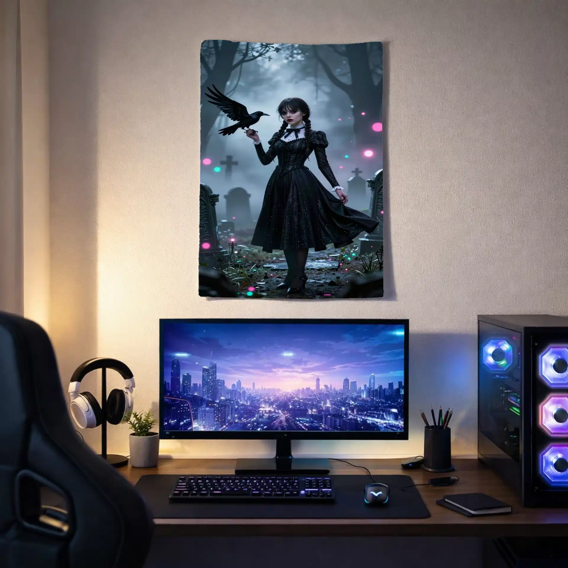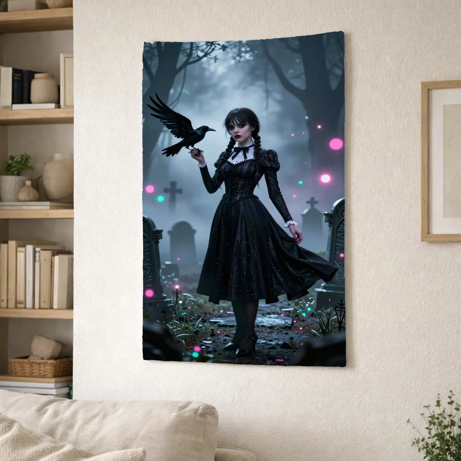 ونزدی با لباس سیاه نمادین خود در حالی که یک کلاغ در دست دارد، در میان مه و نورهای قبرستان گوتیک ایستاده است. حلقههای بوکه درخشان و عمق سینمایی ناشی از فشردهسازی تلهفوتو، این تصویر را به یک والپیپر بینظیر تبدیل کردهاند.