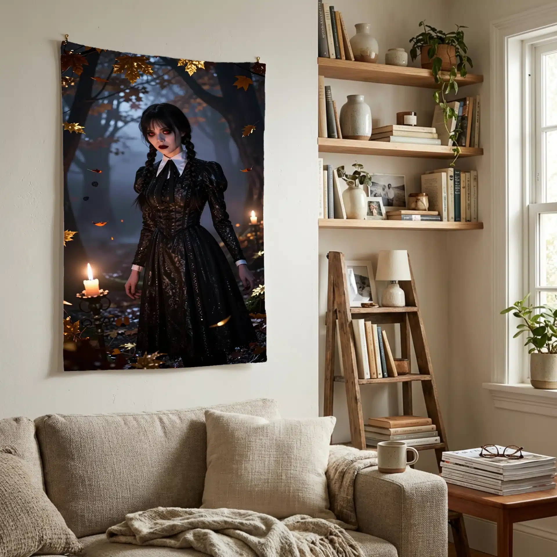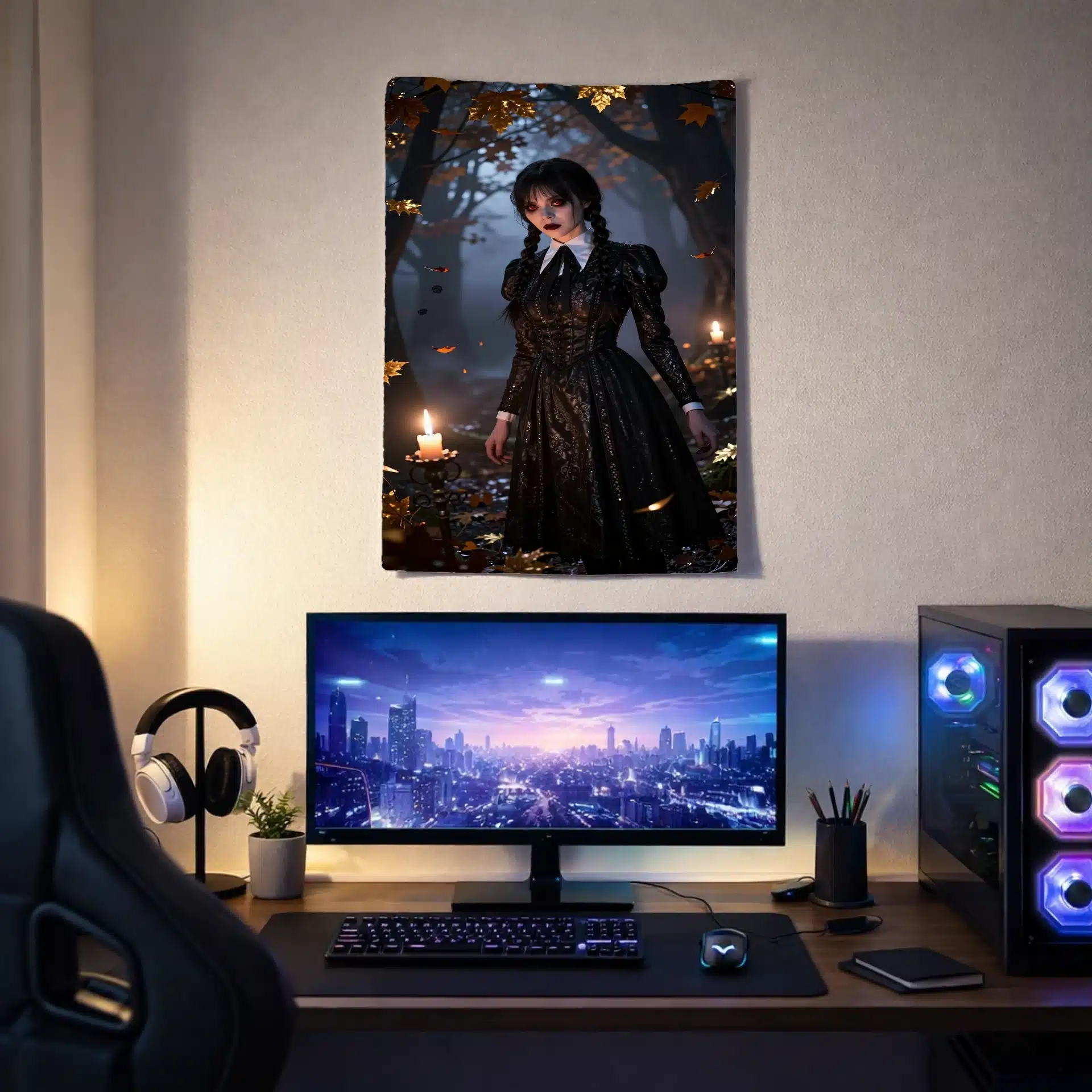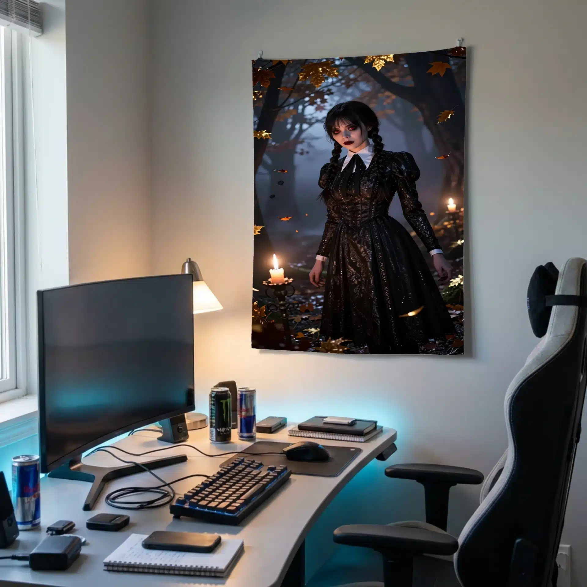 والپیپر انیمهای خیرهکننده از ونزدی آدامز که در یک جنگل افسونشده و مهآلود در غروب ایستاده است. نور شمعهای در حال لرزش، سایههای نمایشی روی چهره رنگپریده او میاندازد و چشمانش به رنگ قرمز کمرنگ میدرخشند. این تصویر با ترکیب رنگهای زمینی غنی و سیاهیهای عمیق، جذابیت مرموز او را به تصویر میکشد.