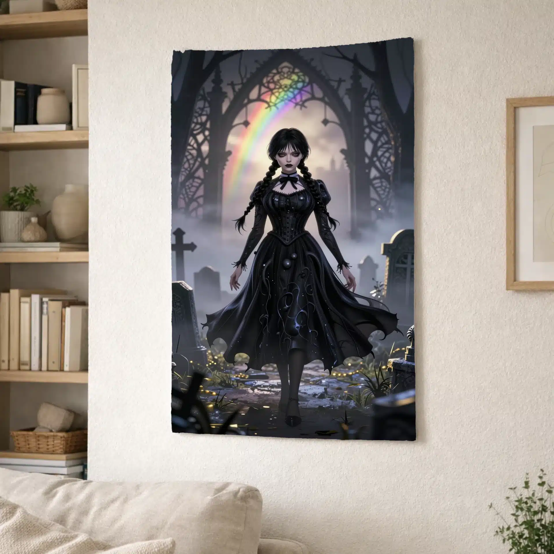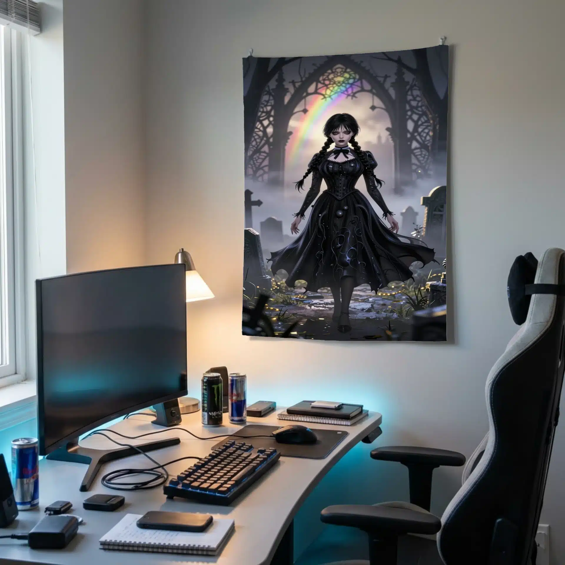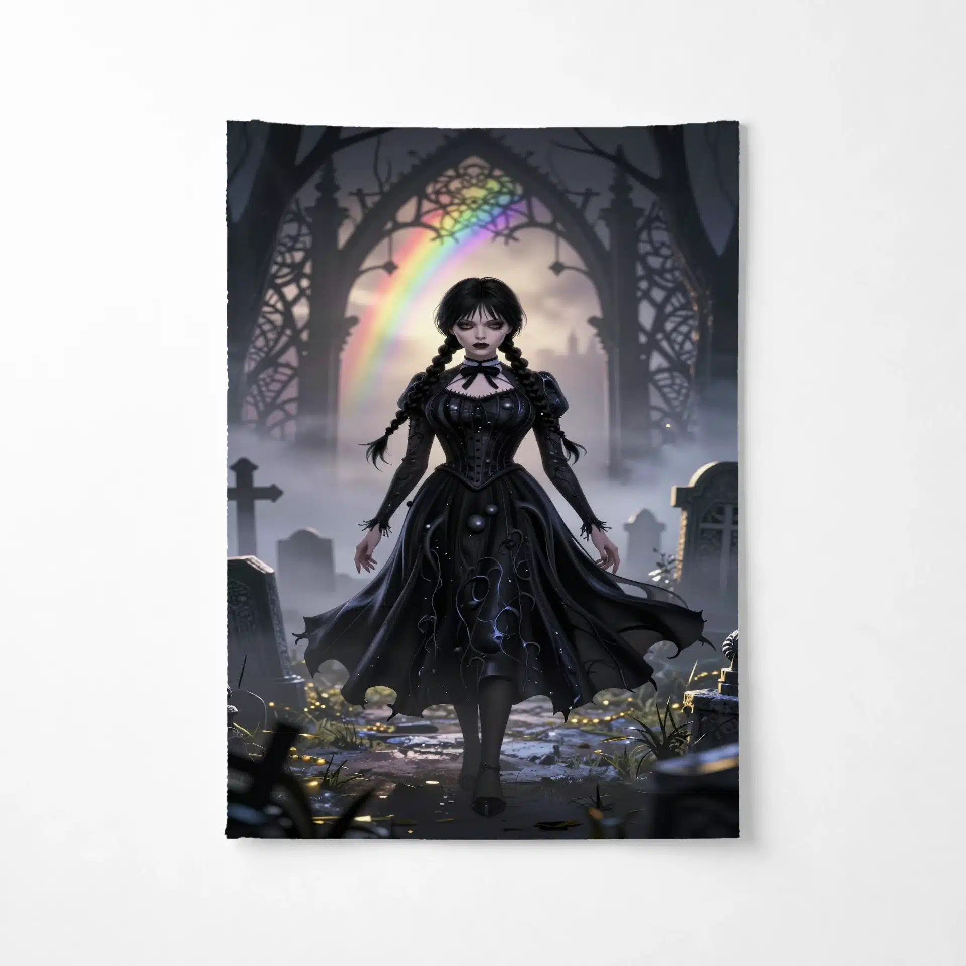 طراحی با جزئیات بالا شامل لباس سیاه روان ونزدی است که با اشکال ارگانیک در مه ادغام میشود. پسزمینه با الگوهای گوتیک پیچیده و سایهروشنهای آبی تیره و طلایی، همراه با جلوههای رنگینکمانی ظریف، کامل شده است.