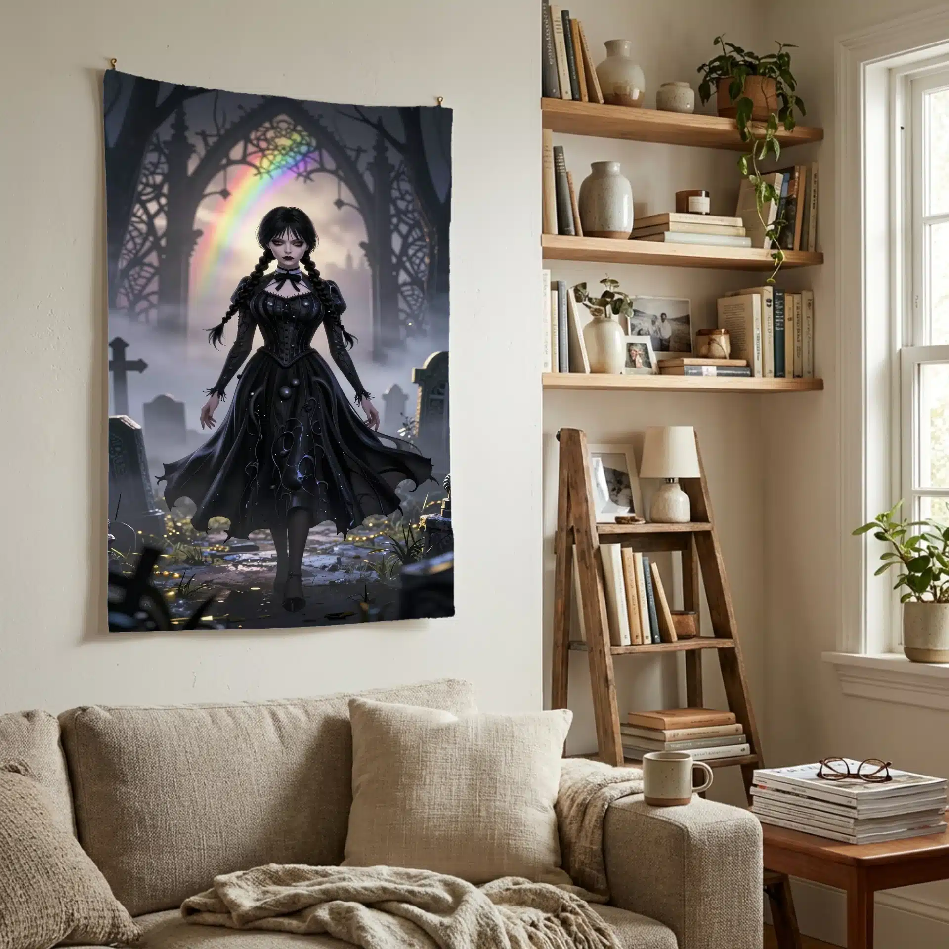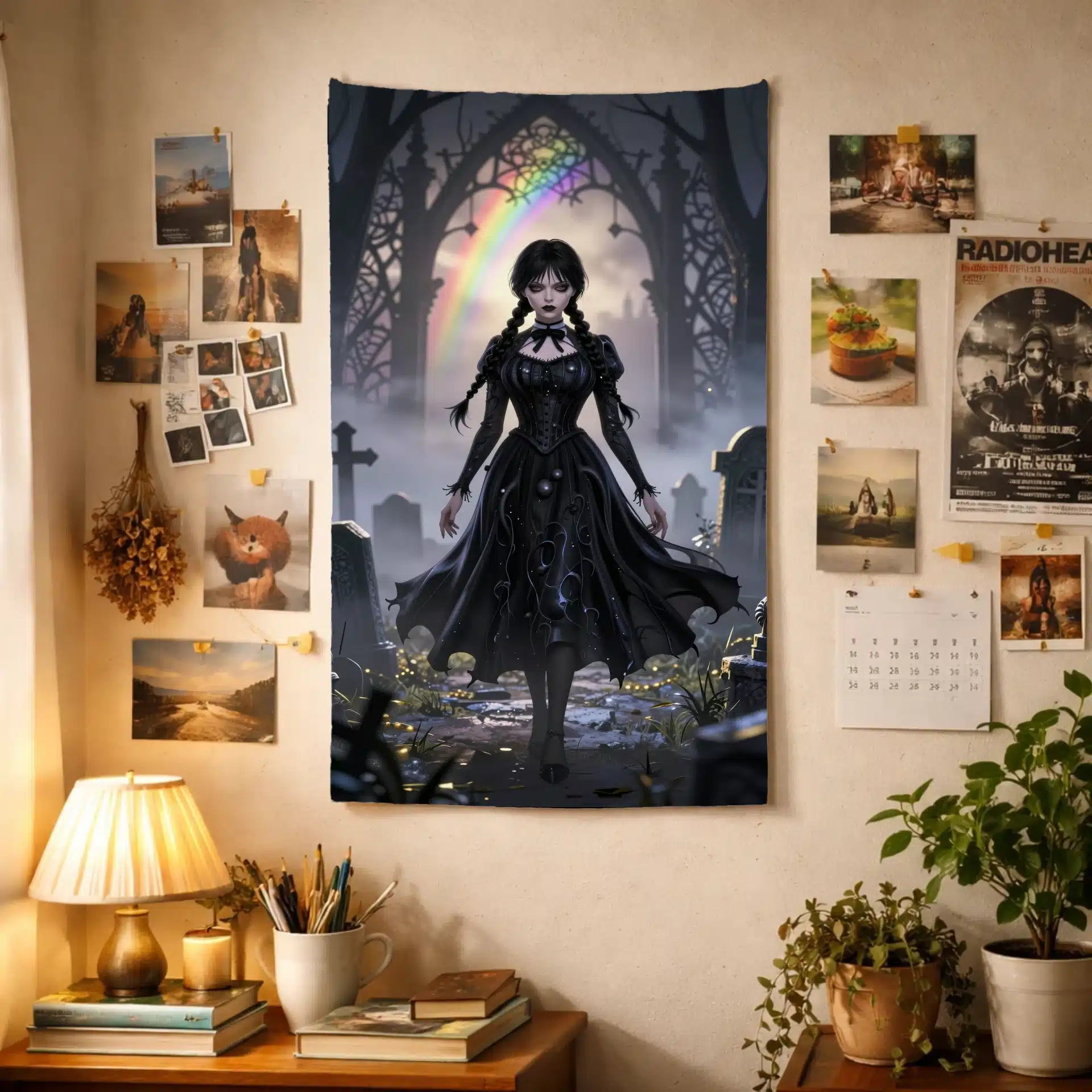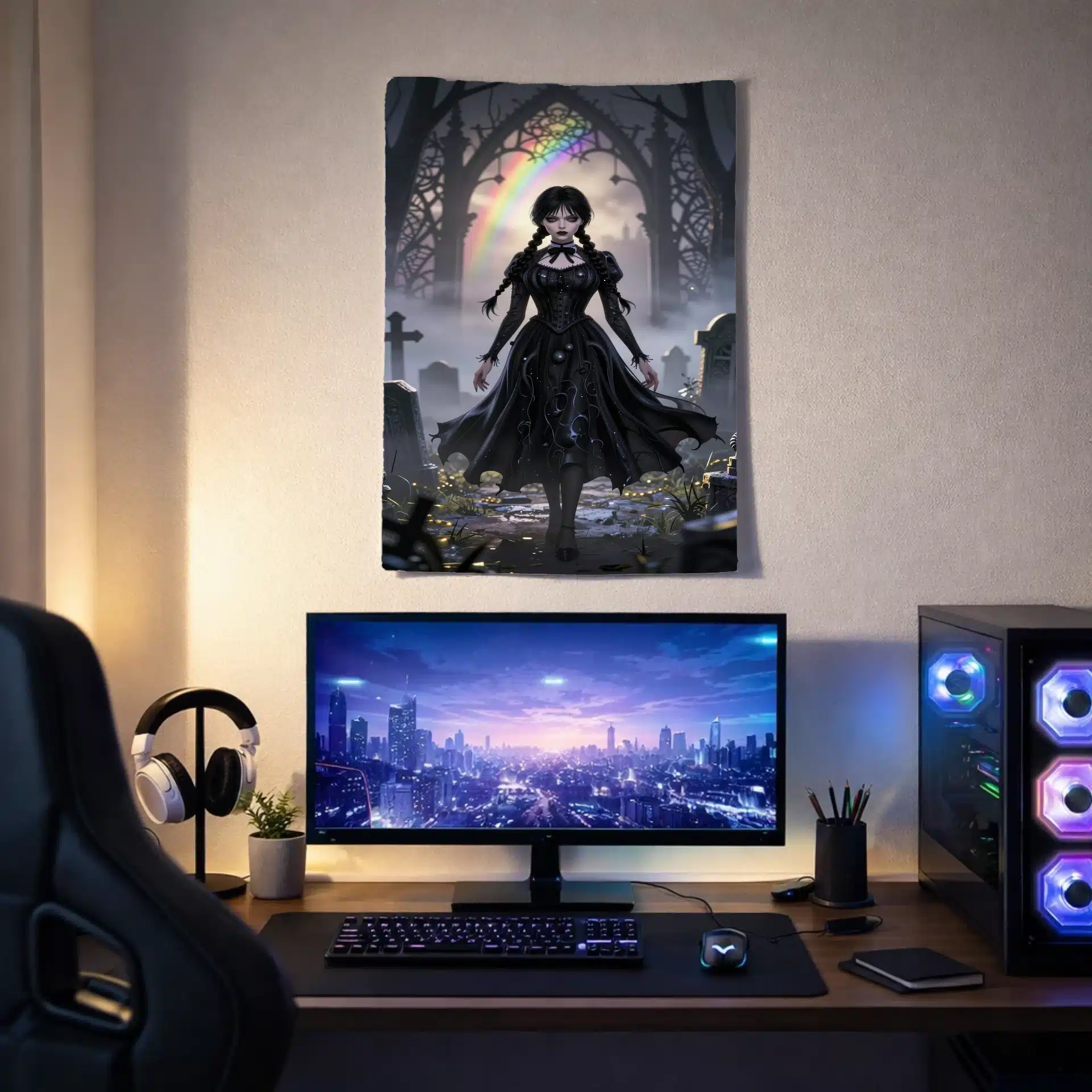 طراحی با جزئیات بالا شامل لباس سیاه روان ونزدی است که با اشکال ارگانیک در مه ادغام میشود. پسزمینه با الگوهای گوتیک پیچیده و سایهروشنهای آبی تیره و طلایی، همراه با جلوههای رنگینکمانی ظریف، کامل شده است.