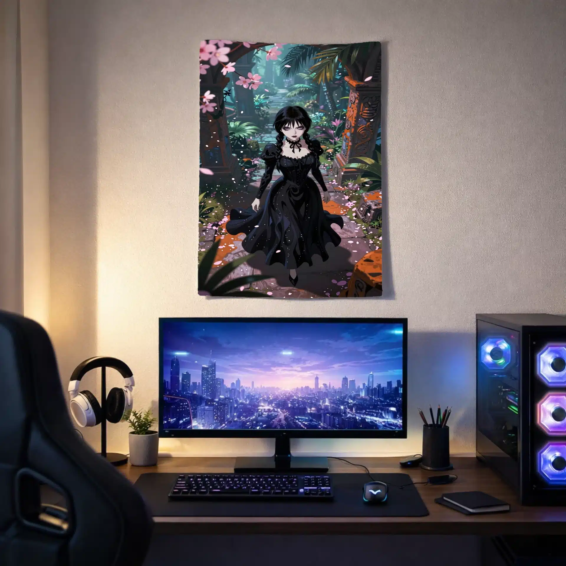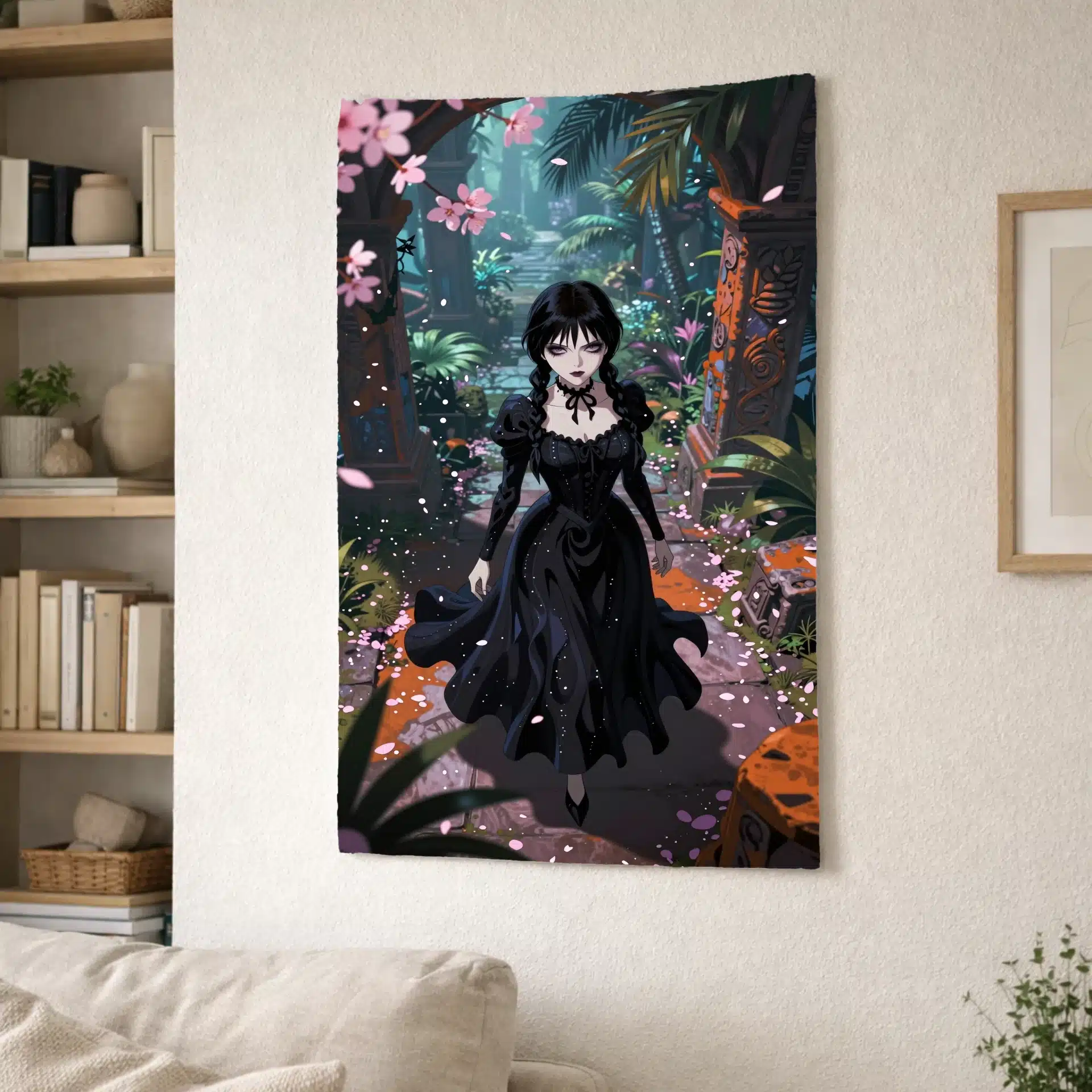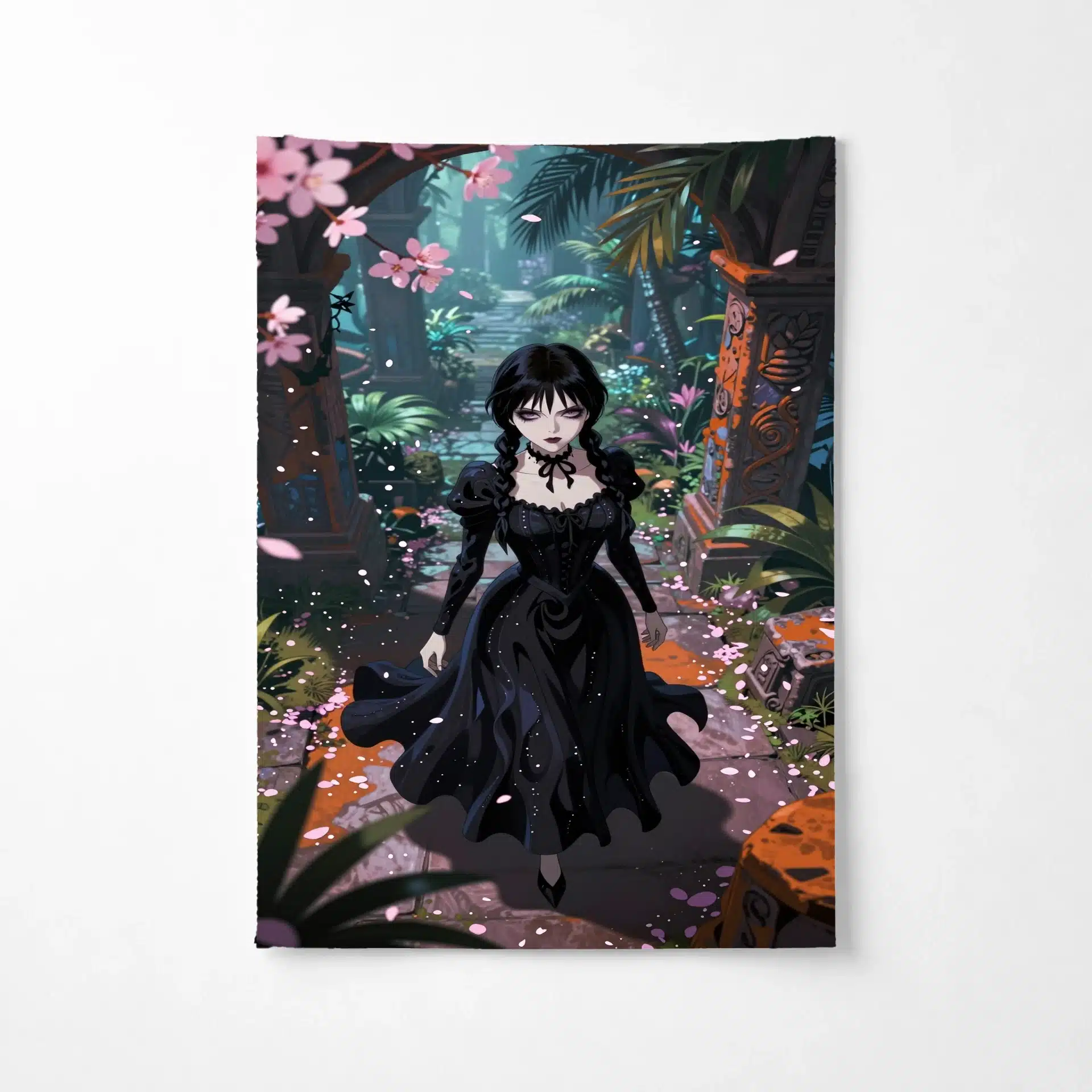 تصویری خیرهکننده از ونزدی آدامز در سبک انیمه، در میان ویرانههای باستانی و گرمسیری، با لباس سیاه نمادینش که با خطوط ارگانیک و موجدار در نور فلوئورسنت به زیبایی به تصویر کشیده شده است. این اثر با نما از بالا، او را در میان گلبرگهای صورتی ساکورا نشان میدهد که در تضاد جذابی با حکاکیهای سنگی نارنجی و قهوهای قرار گرفتهاند.