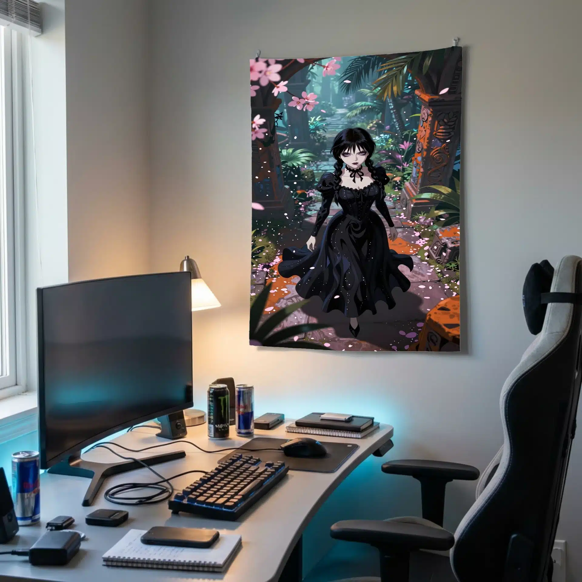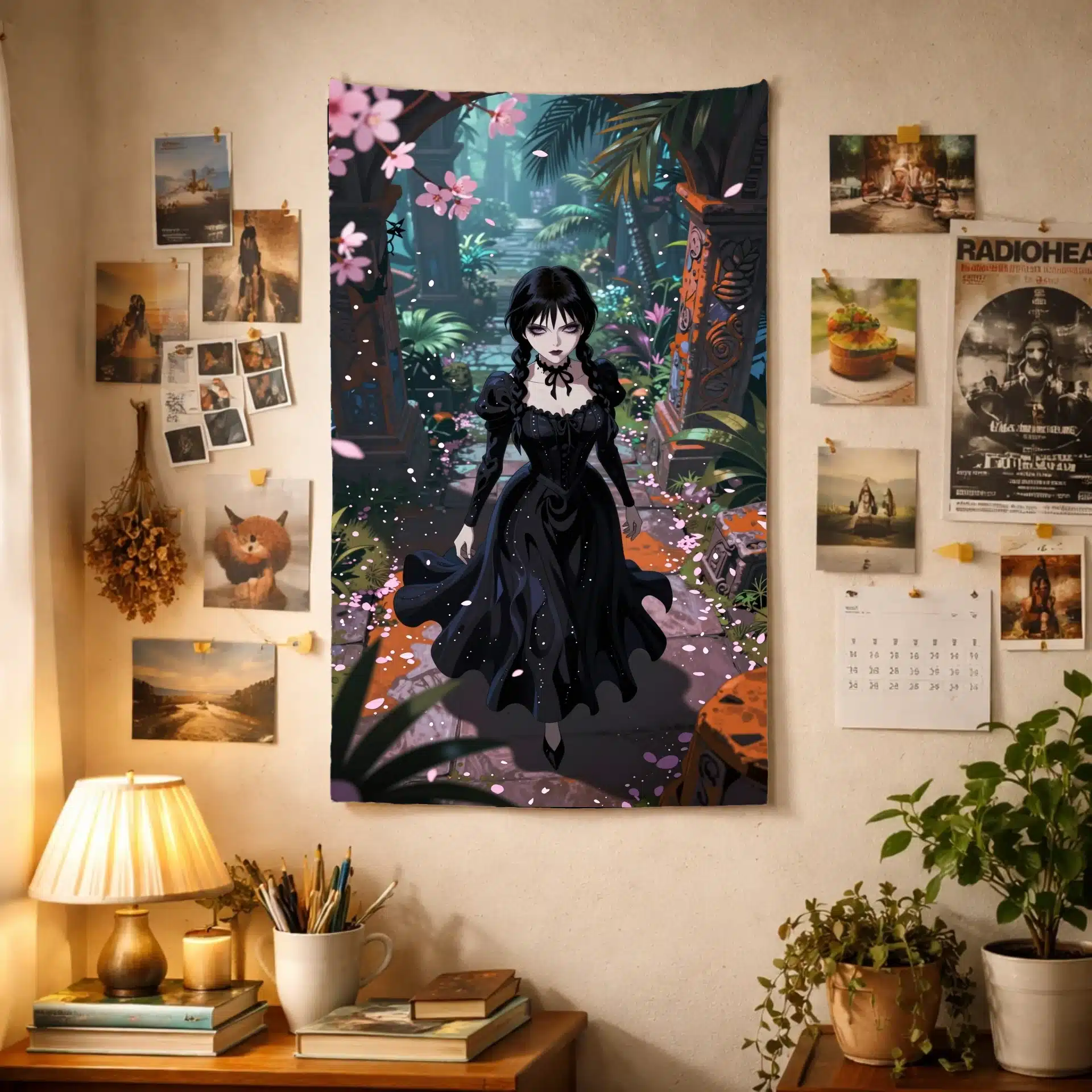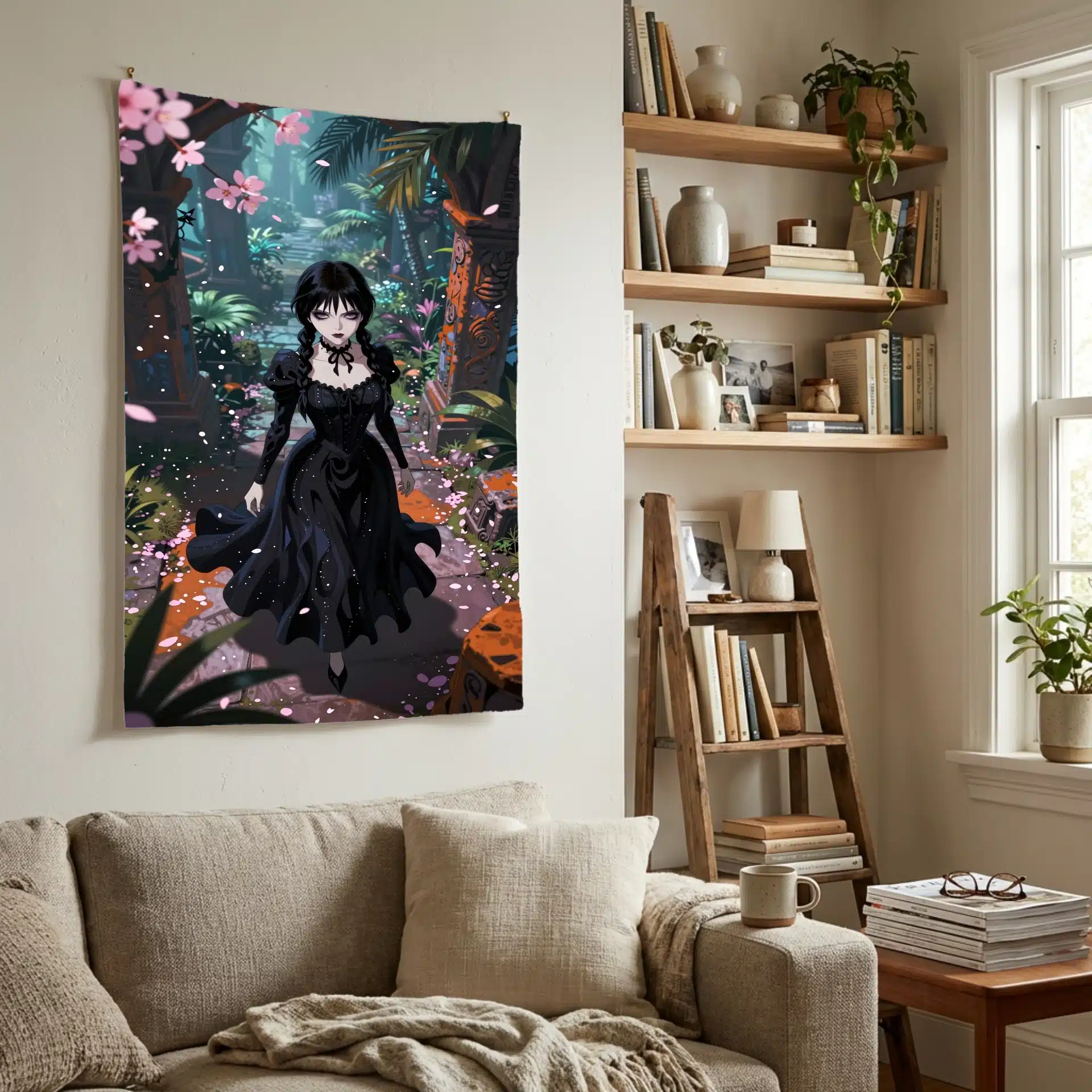 تصویری خیرهکننده از ونزدی آدامز در سبک انیمه، در میان ویرانههای باستانی و گرمسیری، با لباس سیاه نمادینش که با خطوط ارگانیک و موجدار در نور فلوئورسنت به زیبایی به تصویر کشیده شده است. این اثر با نما از بالا، او را در میان گلبرگهای صورتی ساکورا نشان میدهد که در تضاد جذابی با حکاکیهای سنگی نارنجی و قهوهای قرار گرفتهاند.