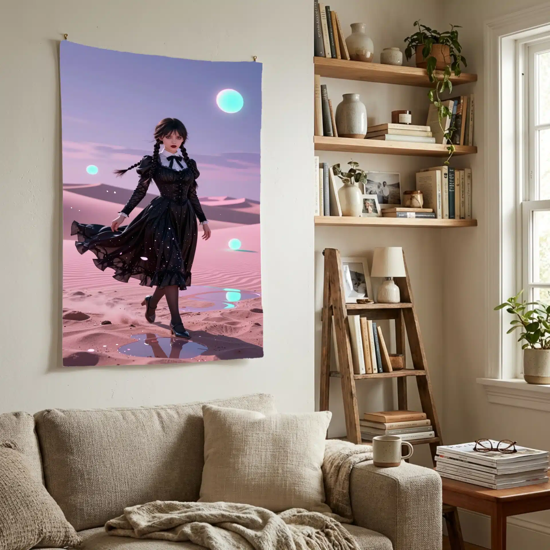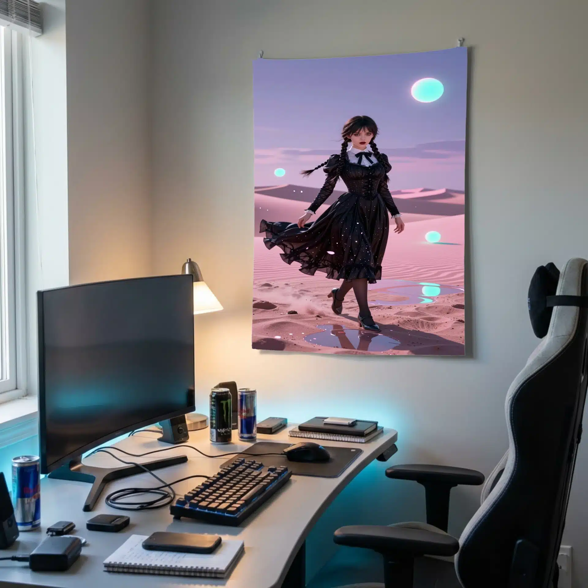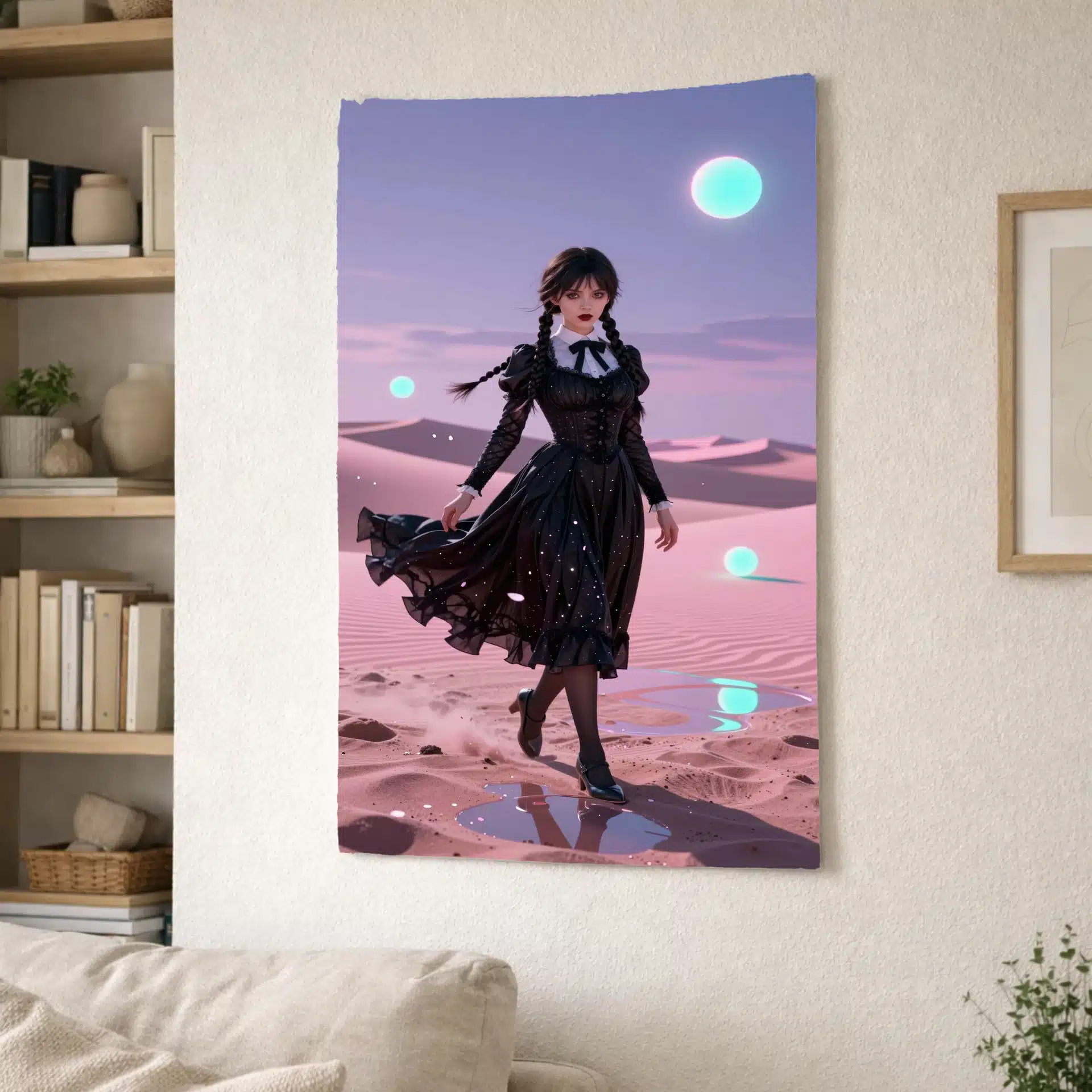 این پرچم با الهام از شخصیت ونزدی آدامز طراحی شده است و صحنهای خیالی از او را در یک بیابان سورئال به تصویر میکشد. ترکیب لباس سیاه نمادین او با مناظر بیابانی نورانی و گلهای گیلاس در حال پرواز، فضایی رویایی و جذاب خلق کرده است.
