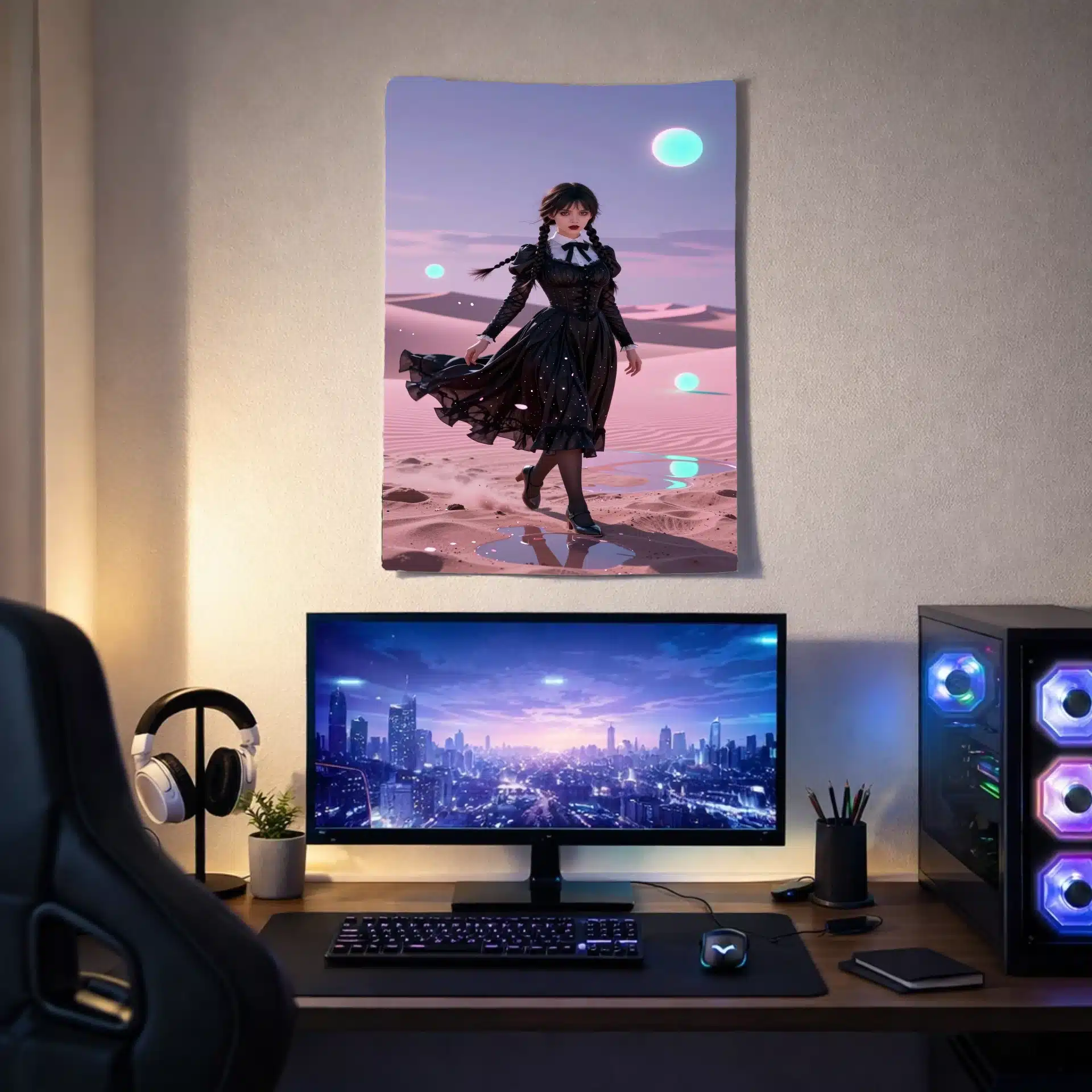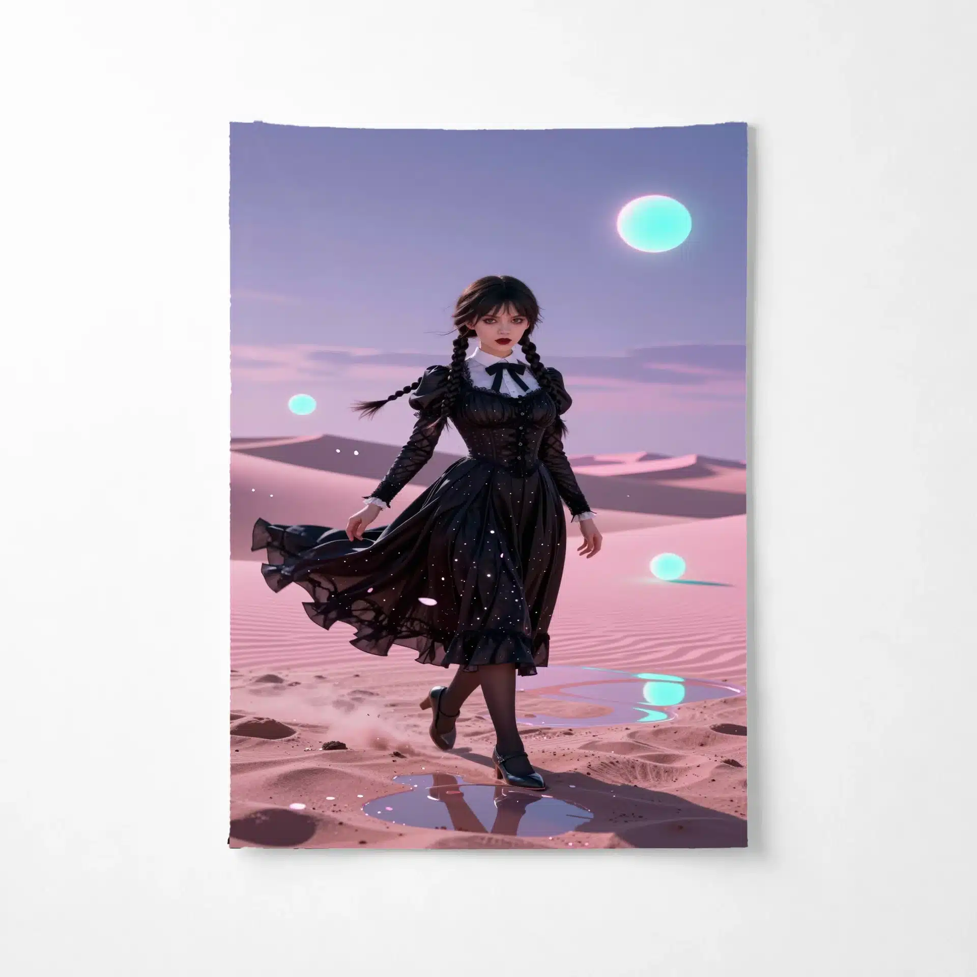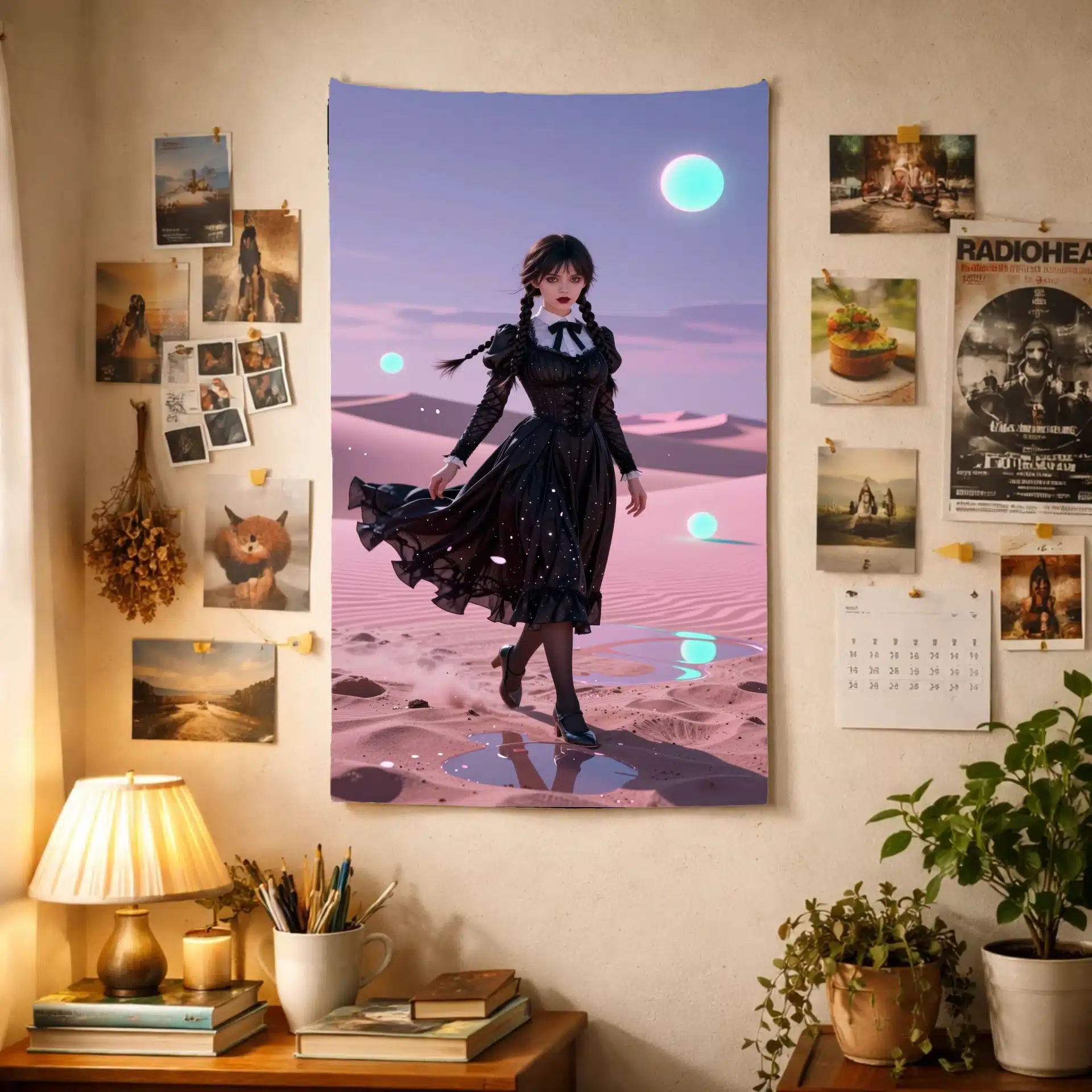 این پرچم با الهام از شخصیت ونزدی آدامز طراحی شده است و صحنهای خیالی از او را در یک بیابان سورئال به تصویر میکشد. ترکیب لباس سیاه نمادین او با مناظر بیابانی نورانی و گلهای گیلاس در حال پرواز، فضایی رویایی و جذاب خلق کرده است.