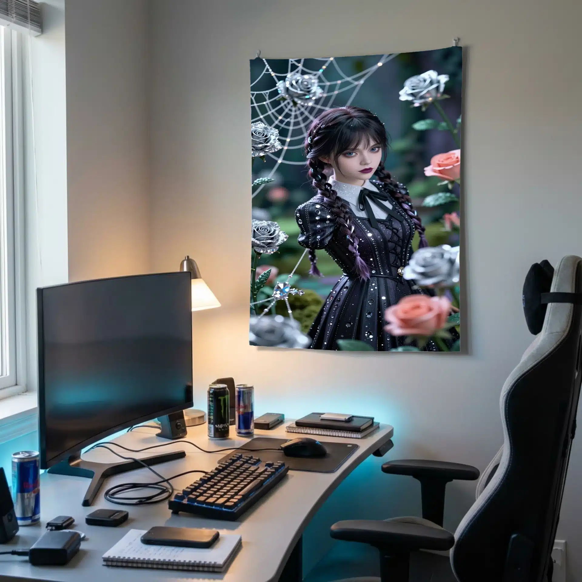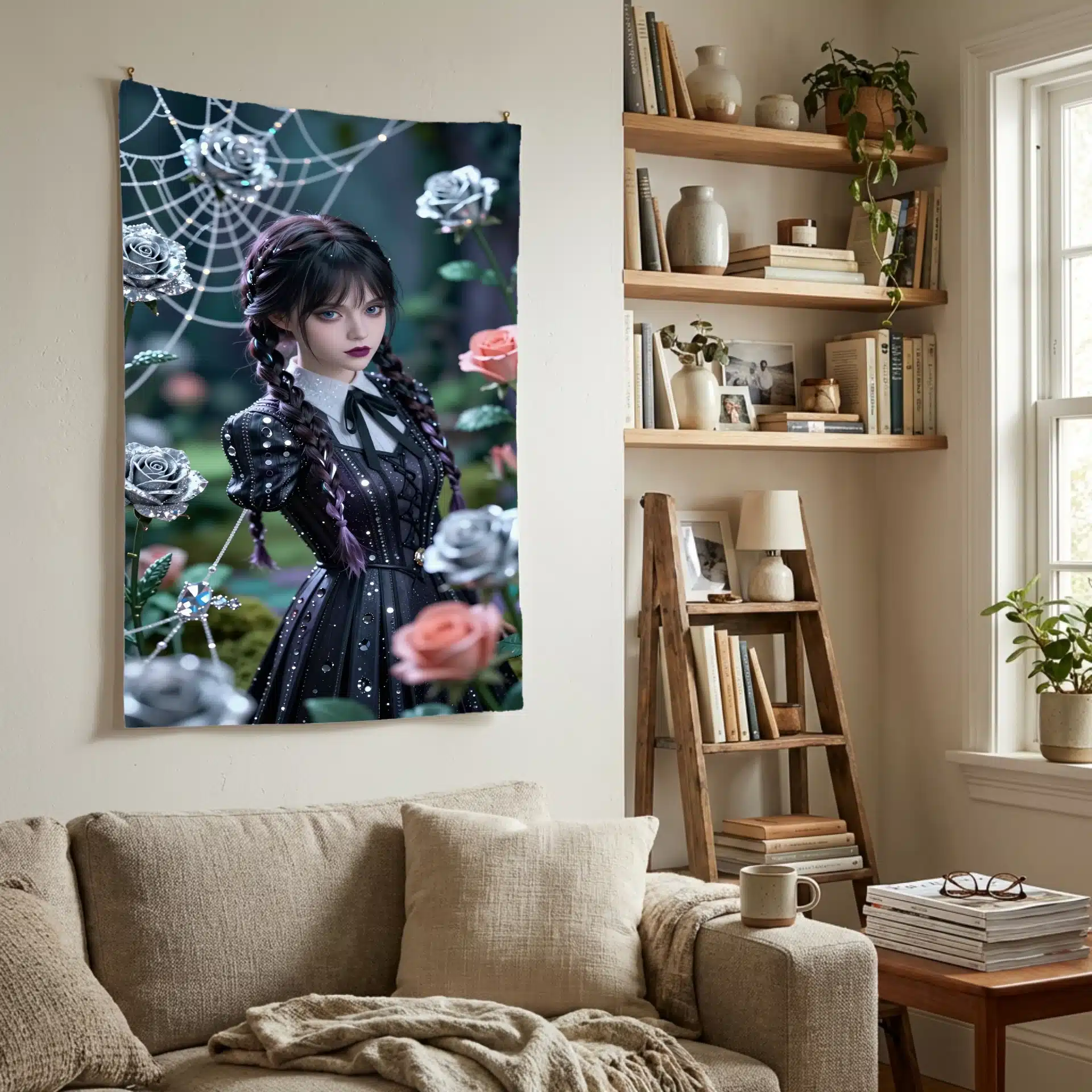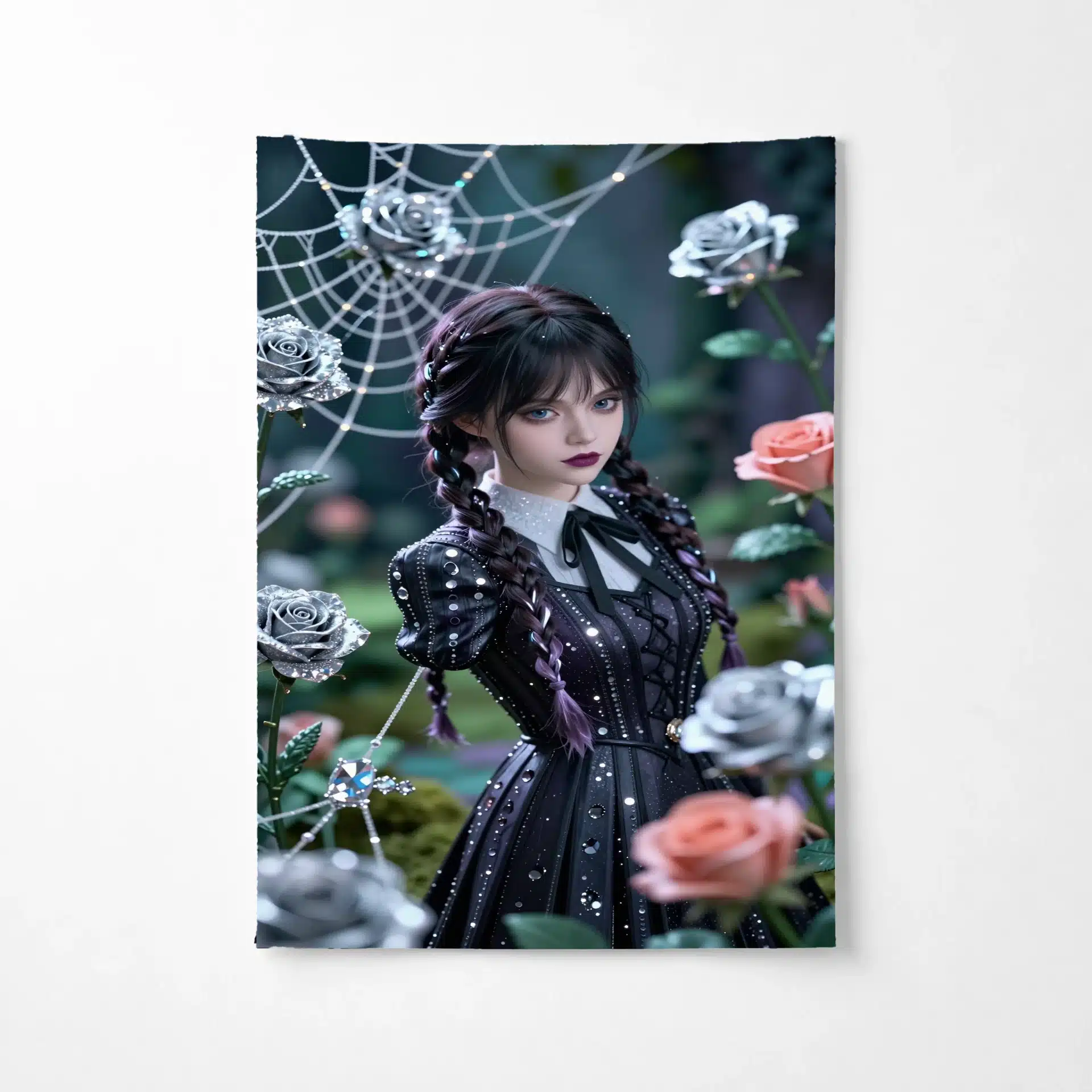 موهای بافتهی نمادین ونزدی و چهرهی جدی او زیر نور نرم و پخششده میدرخشند، در حالی که رزهای نقرهای و تارهای عنکبوت ظریف مانند الماس برق میزنند. این اثر با ترکیب رنگهای فیروزهای و مرجانی در پسزمینهی سبز زمردی، یک ترکیببندی ویرال و خیرهکننده خلق کرده است.