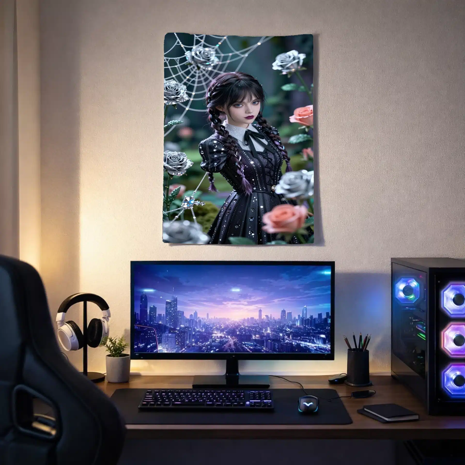 در این بکدراپ خیرهکننده، ونزدی در یک باغ گوتیک افسونشده زیر نور ماه به تصویر کشیده شده است. این اثر با سبک انیمهای و جزئیات کریستالی، زیبایی مرموز و غمگین او را در فضایی رویایی و فراواقعی به نمایش میگذارد.