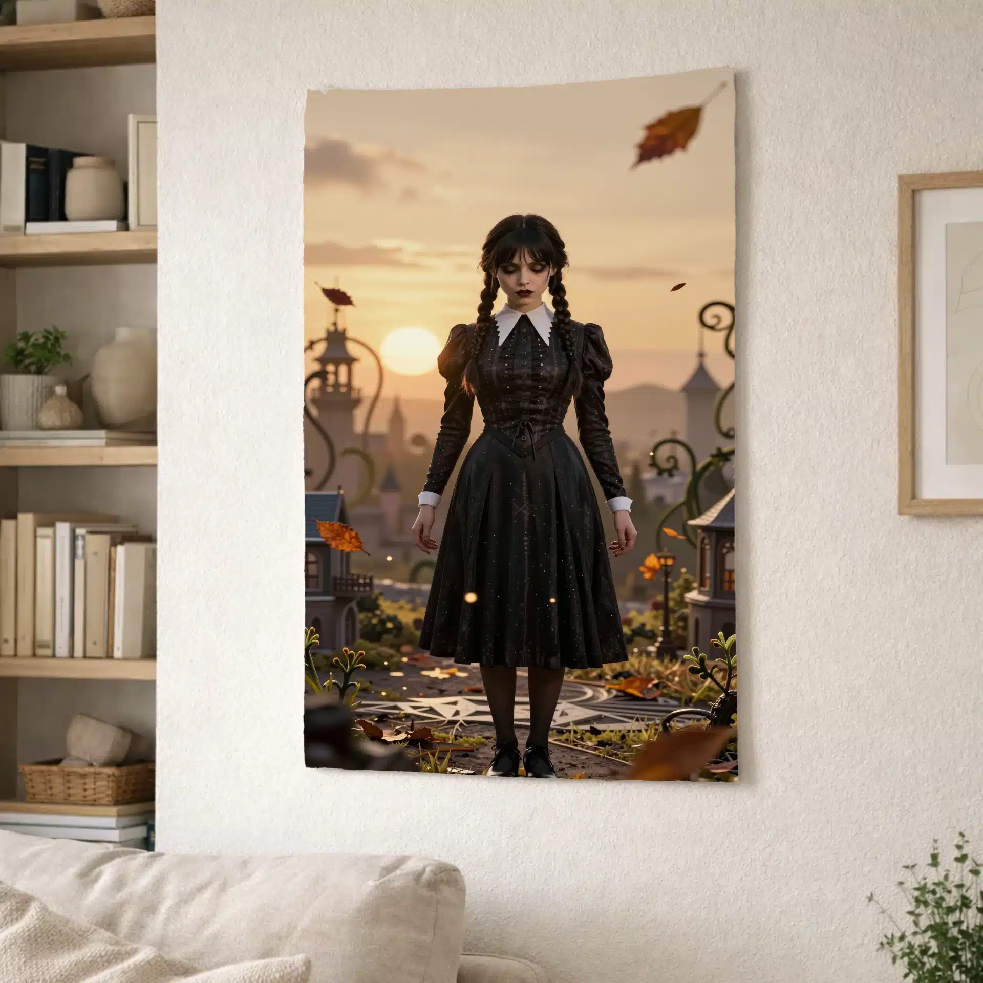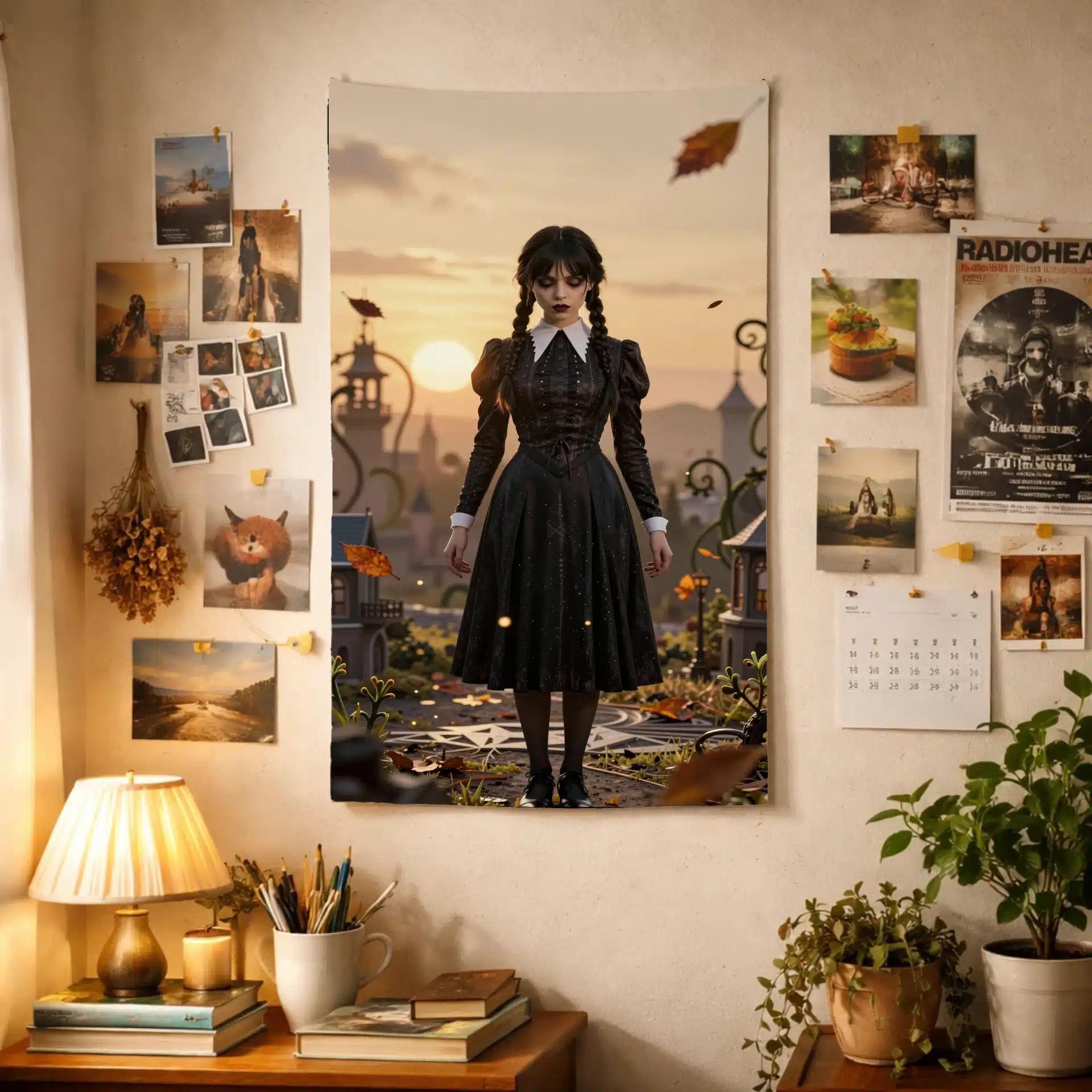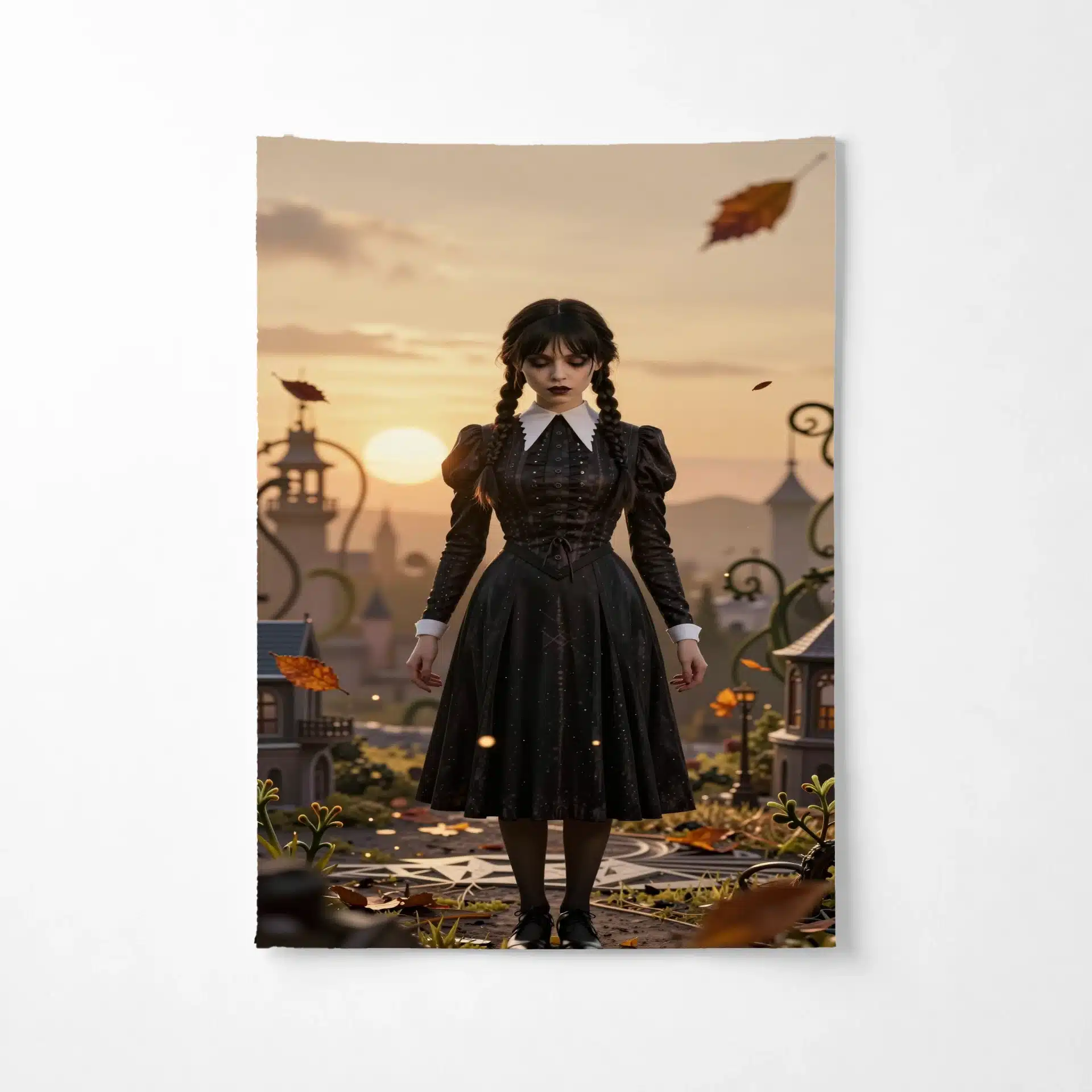 والپیپر انیمهای خیرهکننده از ونزدی آدامز در یک منظره طلایی و مهود، که لباس سیاه و یقه سفید نمادین او در برابر یک صحنه مینیاتوری تیلت-شیفت جلوهگری میکند. این اثر با ترکیب زیبایی از الگوهای هندسی و نورپردازی سینمایی، حس مرموز و جذاب شخصیت را به تصویر میکشد.