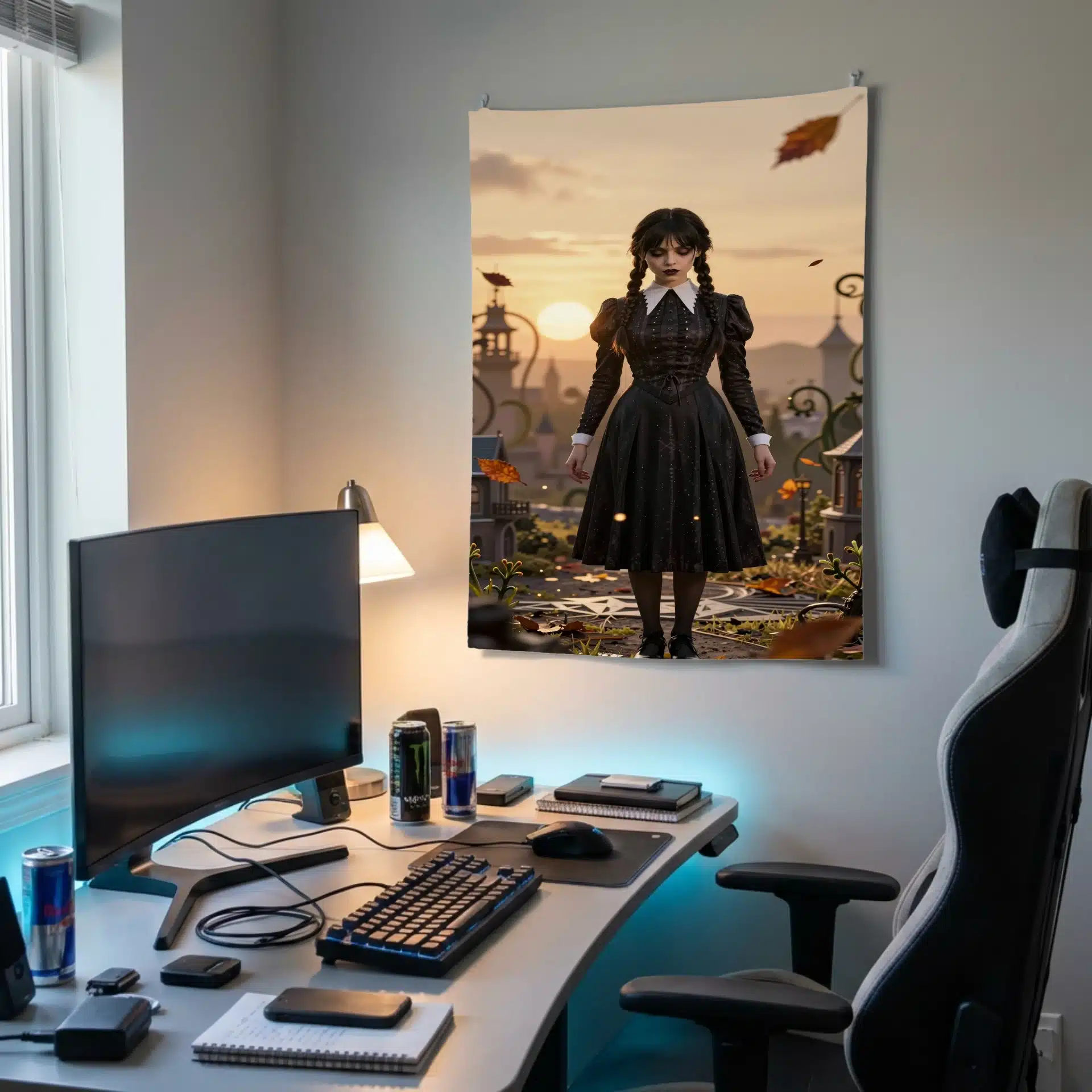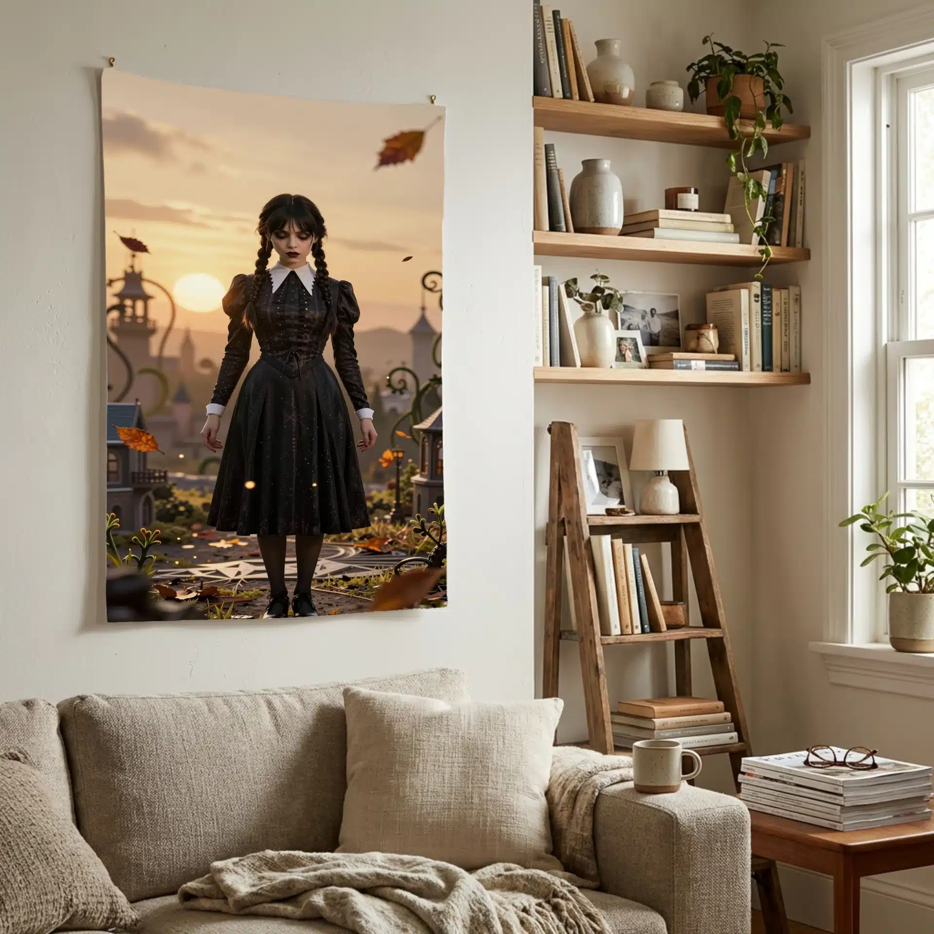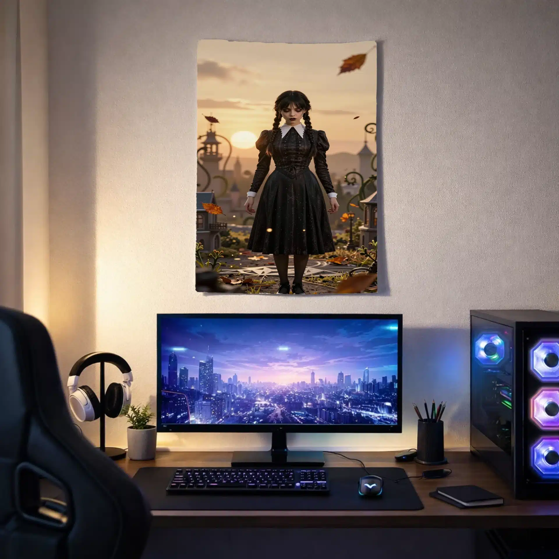 والپیپر انیمهای خیرهکننده از ونزدی آدامز در یک منظره طلایی و مهود، که لباس سیاه و یقه سفید نمادین او در برابر یک صحنه مینیاتوری تیلت-شیفت جلوهگری میکند. این اثر با ترکیب زیبایی از الگوهای هندسی و نورپردازی سینمایی، حس مرموز و جذاب شخصیت را به تصویر میکشد.