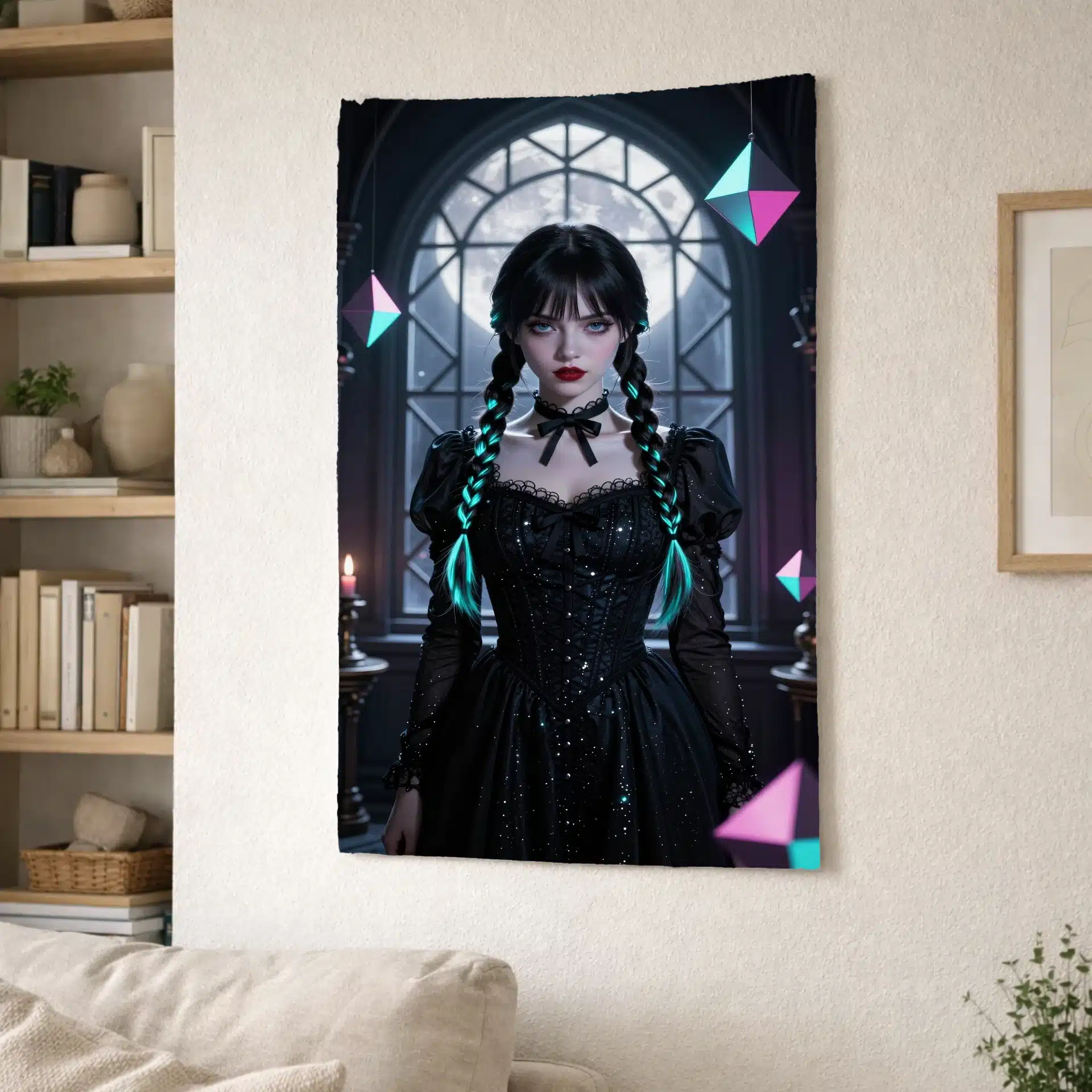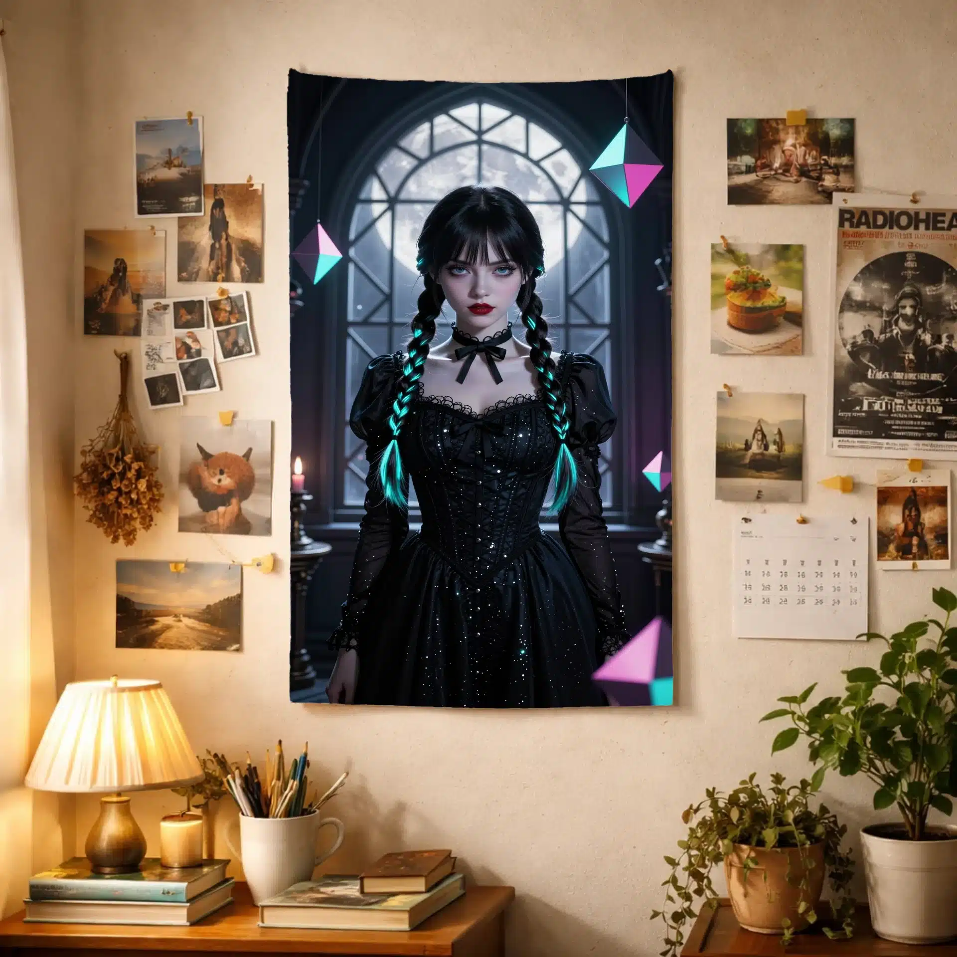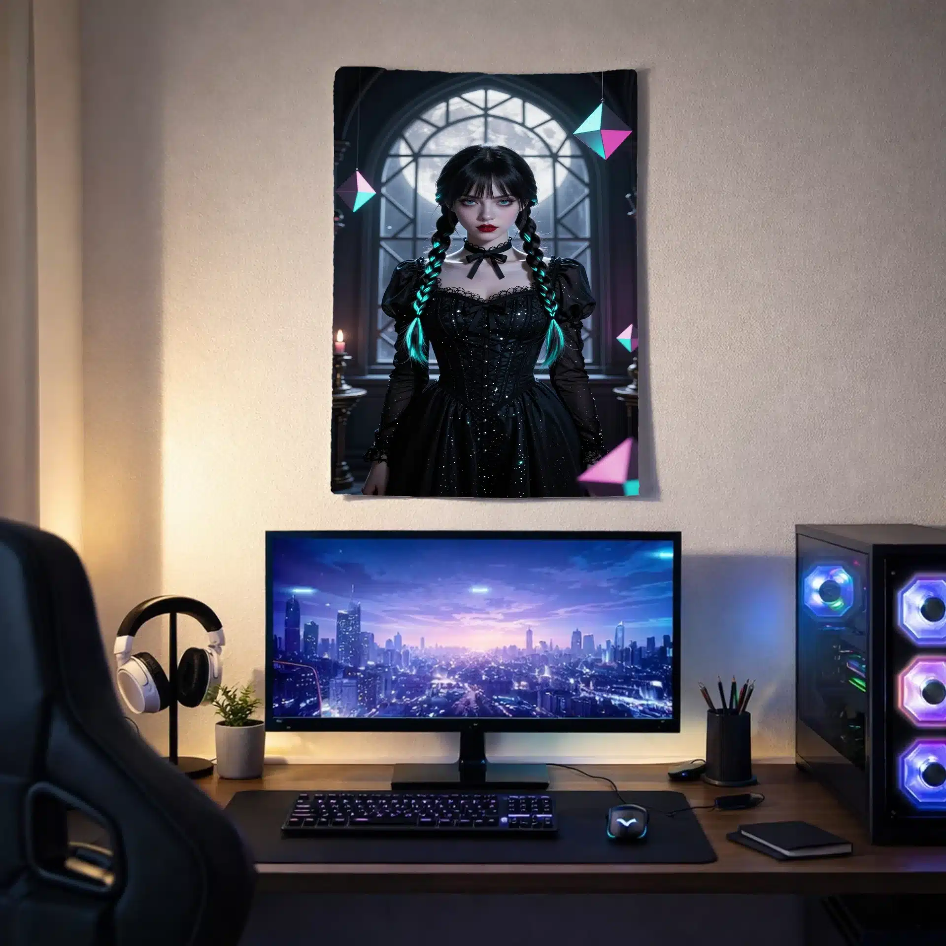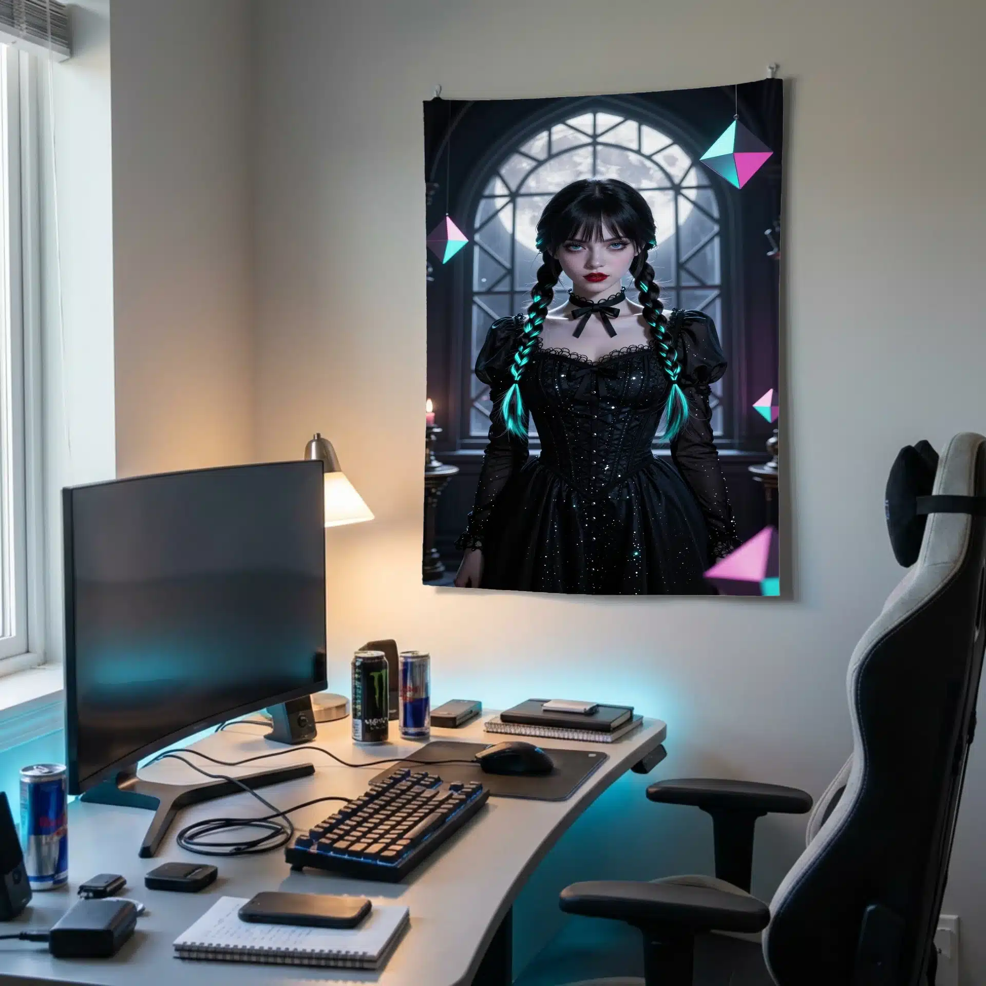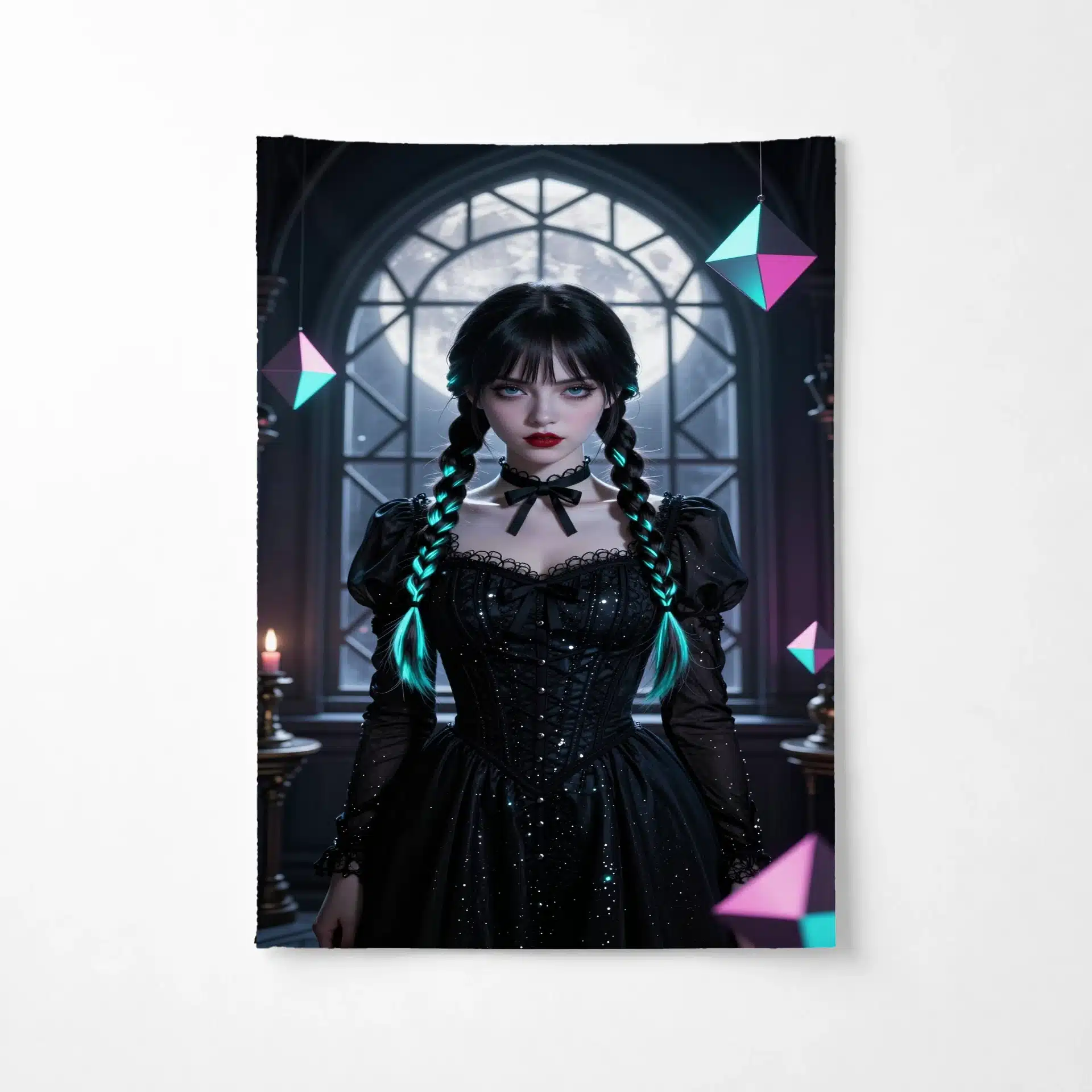 این بکدراپ از ونزدی آدامز در یک فضای گوتیک و دنج طراحی شده است. تصویر او با موهای بافته و هایلایتهای نئون آبی فیروزهای، در نور نقرهای ماه که از پنجرههای هندسی میتابد، به شکلی فوق واقعگرایانه و با جزئیات دقیق به تصویر کشیده شده است.