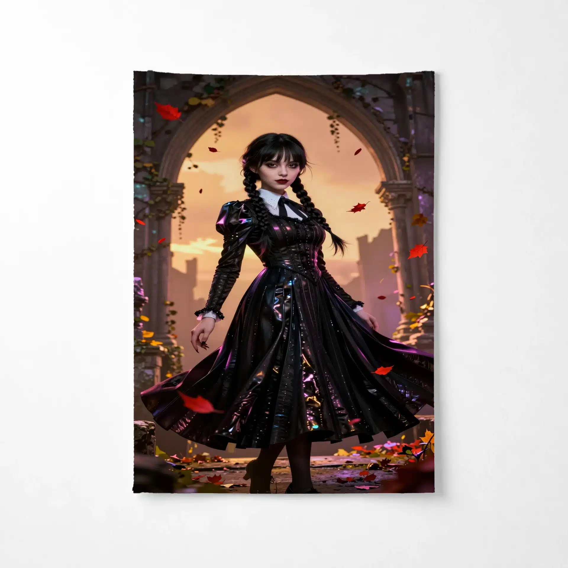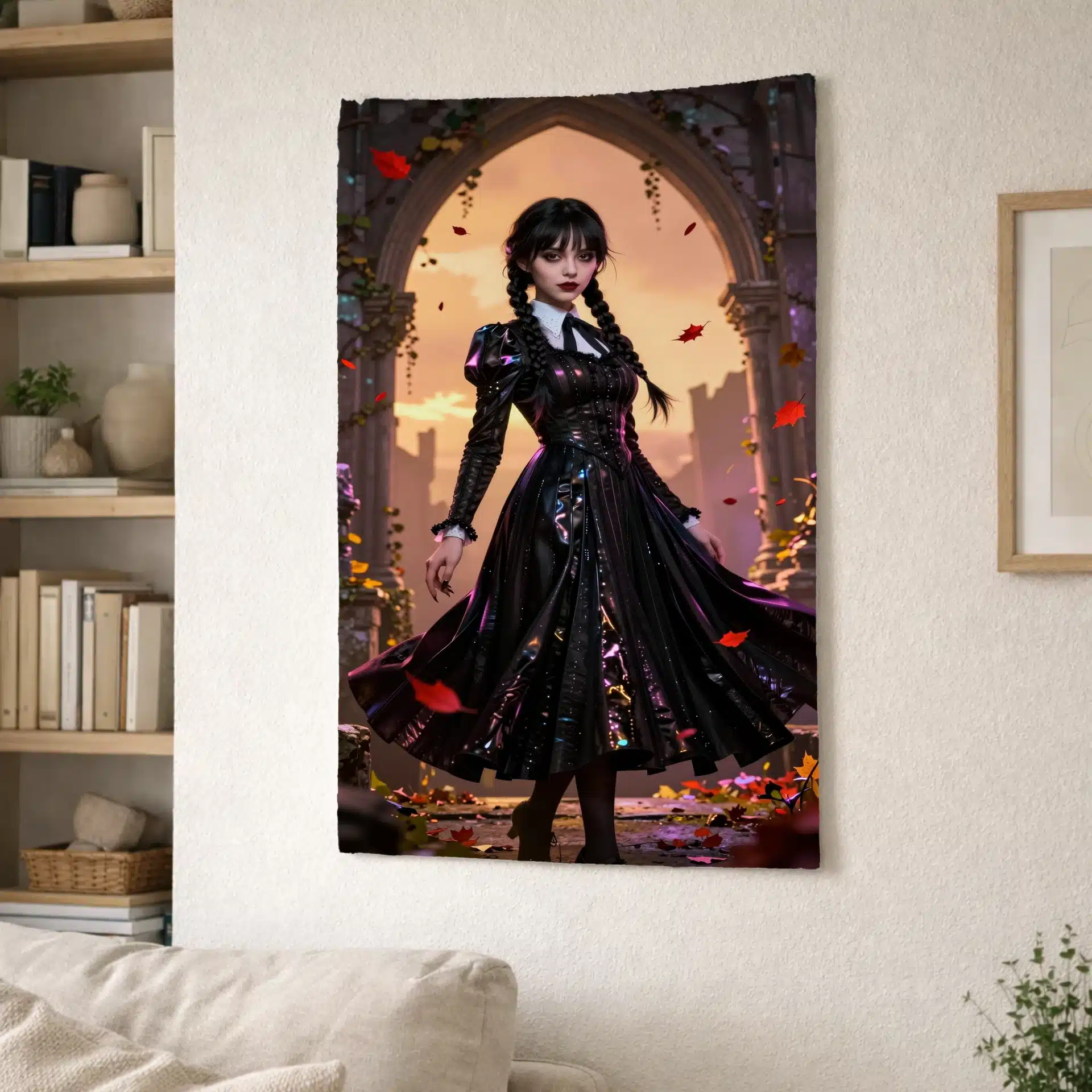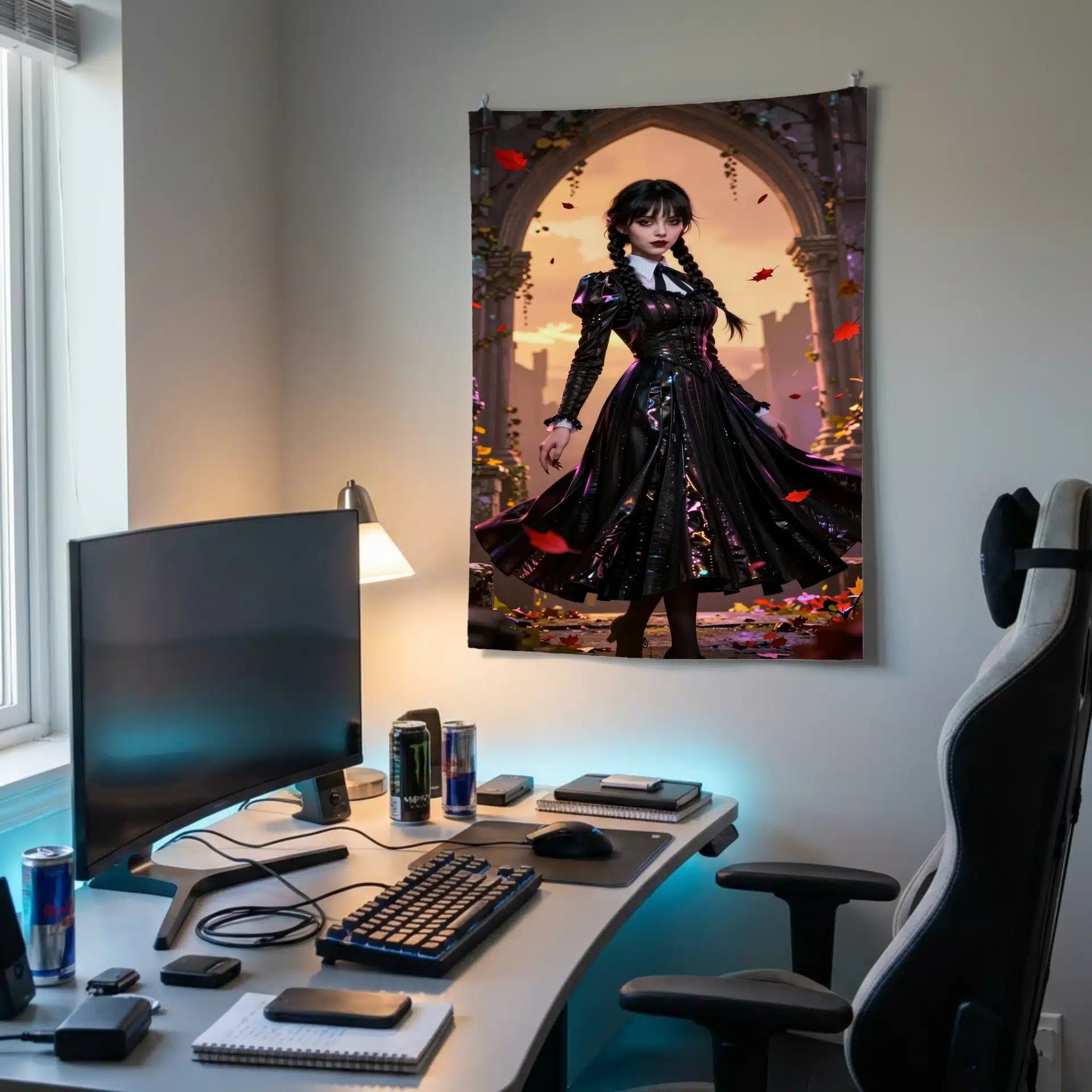 این بکدراپ پرچم با الهام از شخصیت ونزدی آدامز، ترکیبی خیرهکننده از زیبایی گوتیک و فضای رویایی انیمه را ارائه میدهد. صحنهای از ونزدی در میان ویرانههای باستانی با نور کهربایی پاییزی، حال و هوایی مرموز و جذاب خلق کرده است.