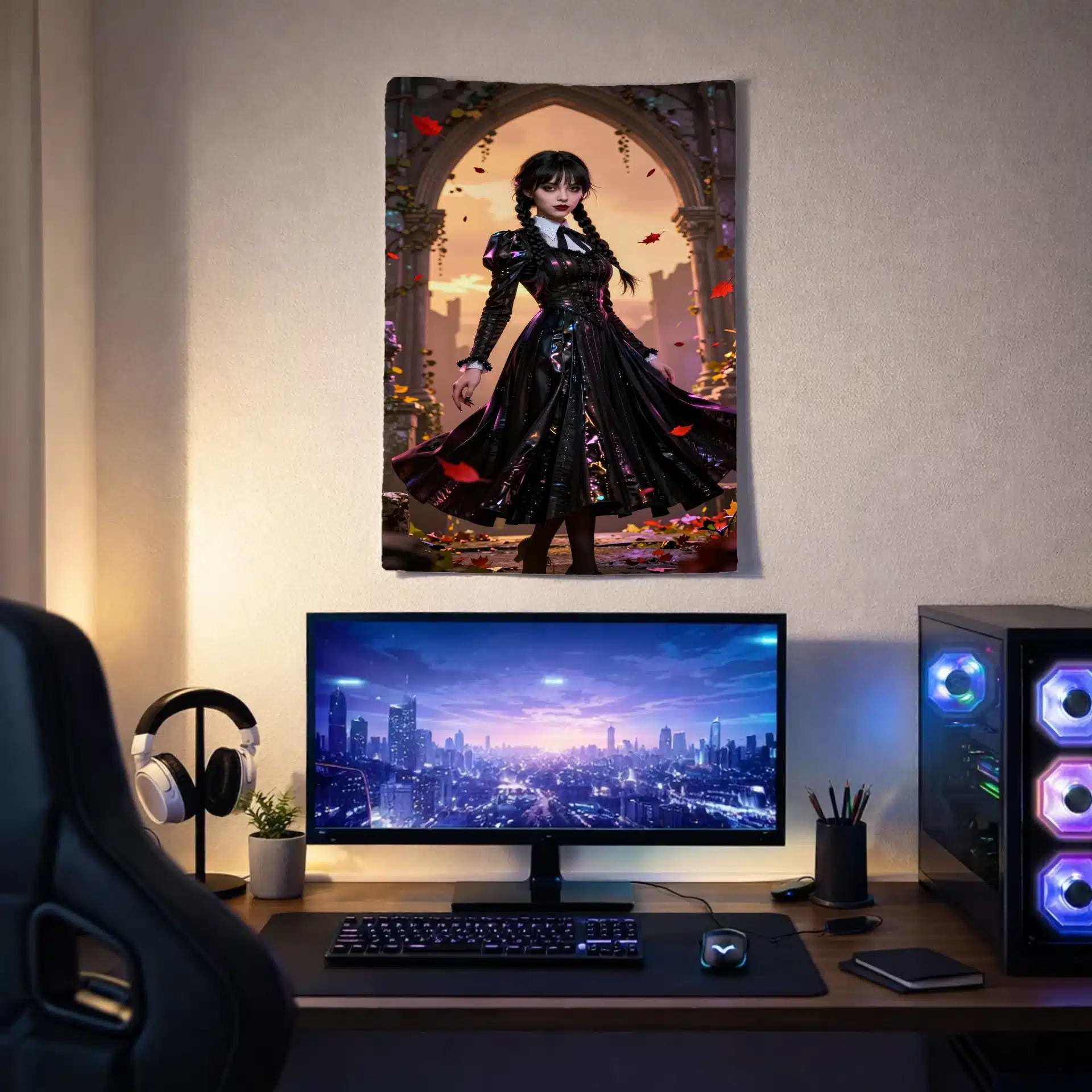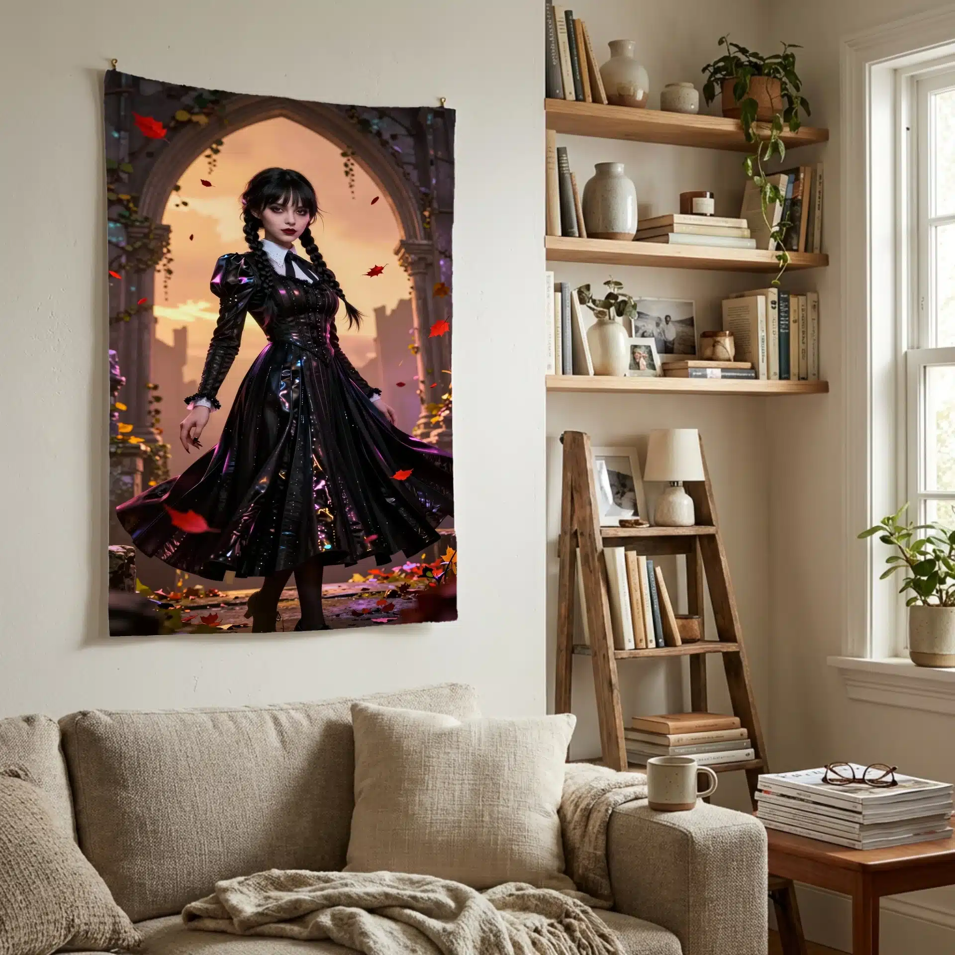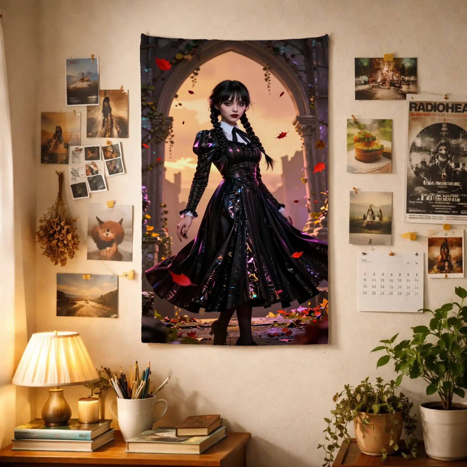 این بکدراپ پرچم با الهام از شخصیت ونزدی آدامز، ترکیبی خیرهکننده از زیبایی گوتیک و فضای رویایی انیمه را ارائه میدهد. صحنهای از ونزدی در میان ویرانههای باستانی با نور کهربایی پاییزی، حال و هوایی مرموز و جذاب خلق کرده است.