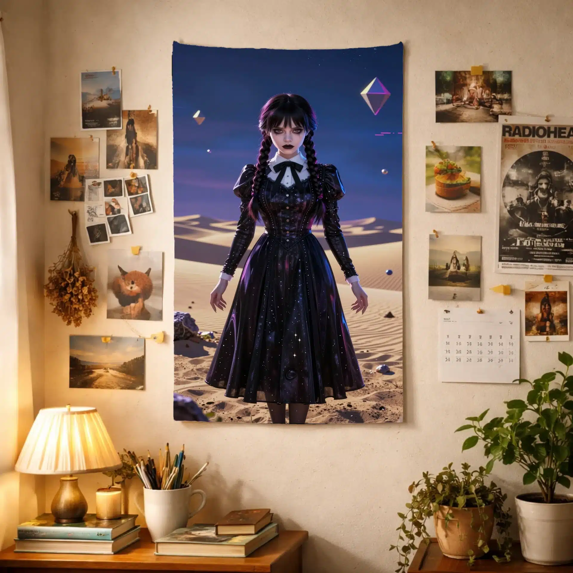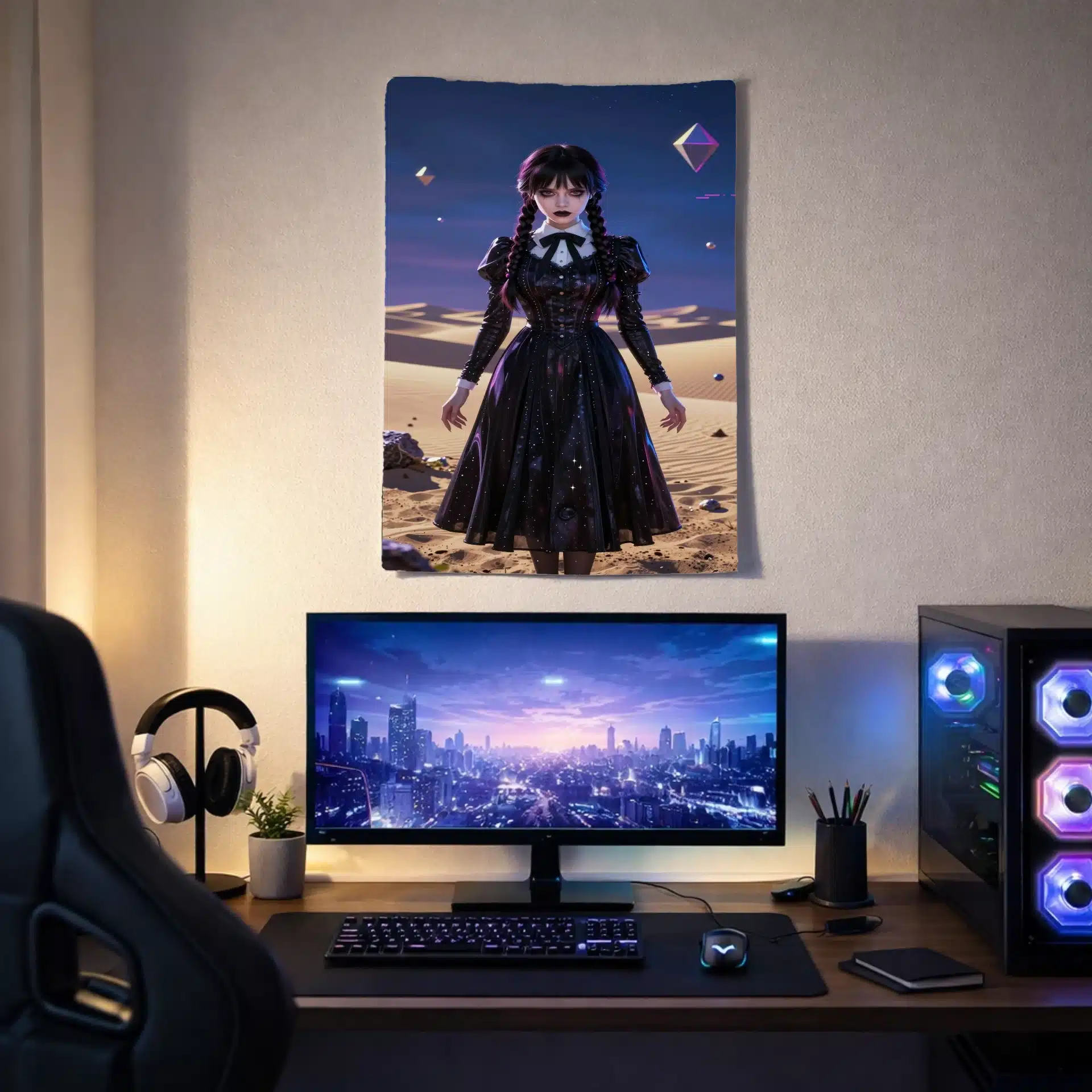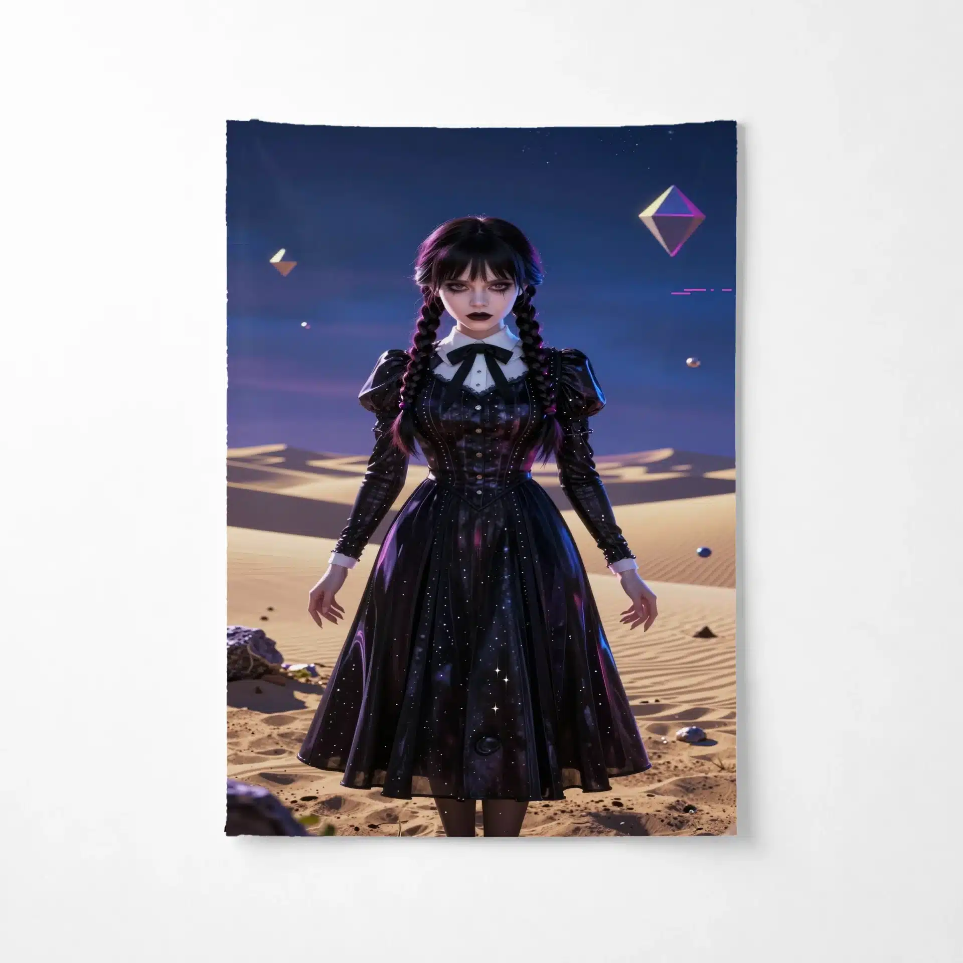 جزئیات بصری شامل رندر 8K با بافتهای دقیق روی پوست رنگپریده و لباس سیاه ونزدی است. نورهای نئونی اطراف او و عناصر سیبرپانک، جلوهای چشمگیر و پرطرفدار به این اثر بخشیدهاند.
