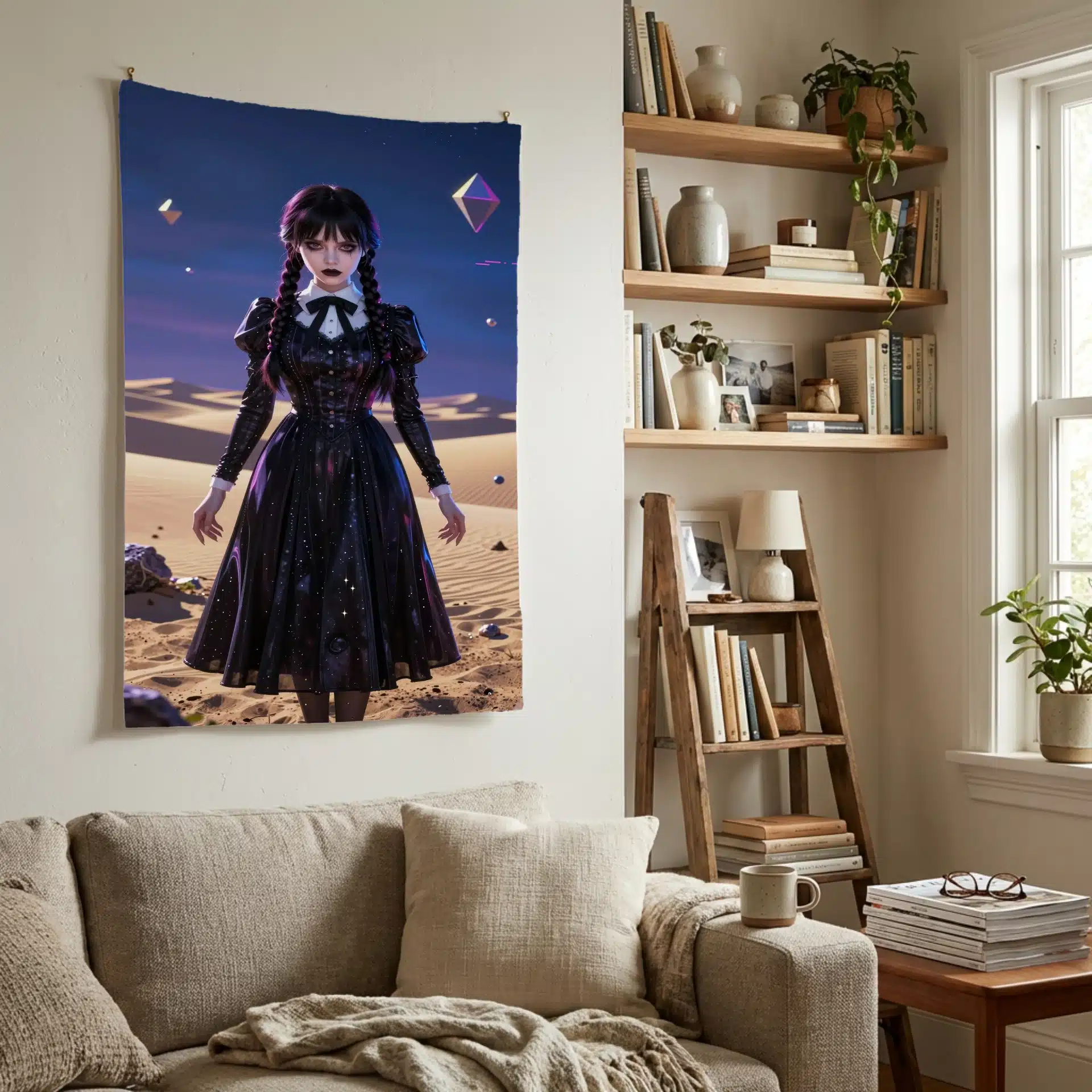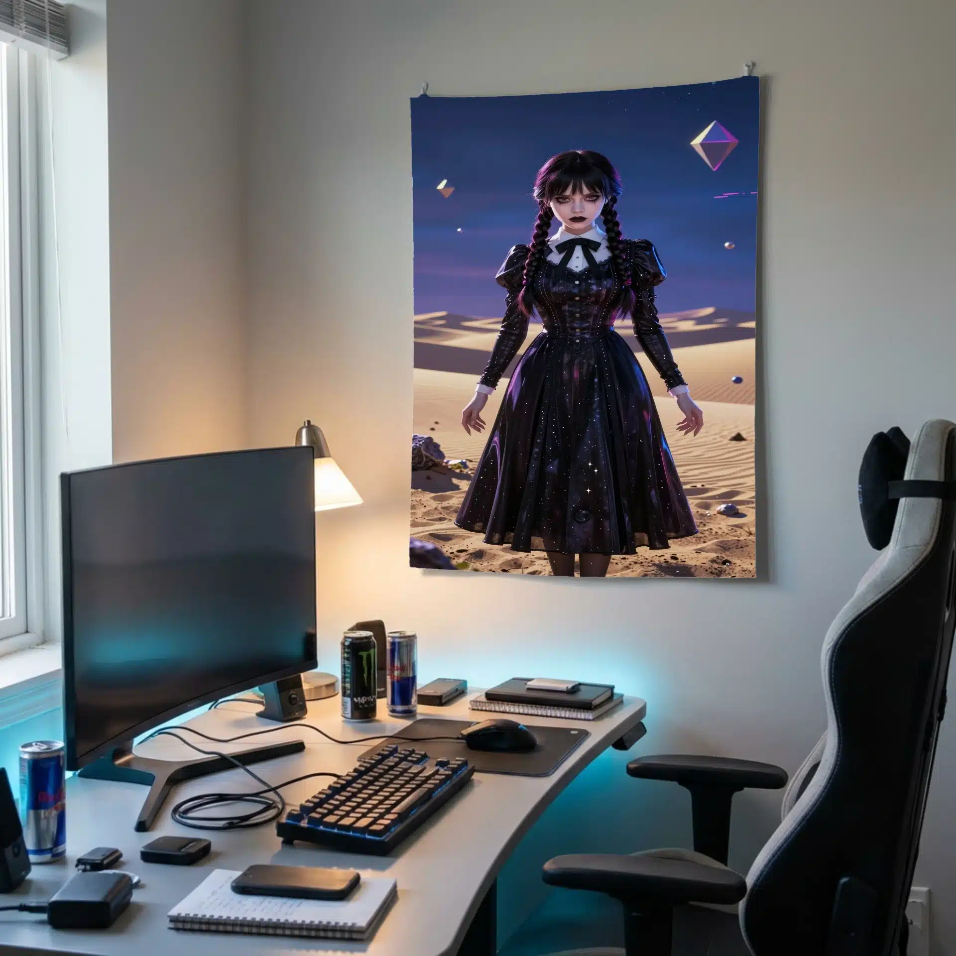 این بکدراپ پرچم از ونزدی آدامز در یک بیابان سورئال با نورپردازی نئونی خیرهکننده طراحی شده است. ترکیب رنگهای آبی تیره و طلایی در آسمان گرگومیش، حال و هوایی رؤیایی و مرموز به تصویر میبخشد. حضور ونزدی با نگاه نافذ و طرحهای هندسی شناور، حس یک فضای سیبرپانک مدرن را القا میکند.