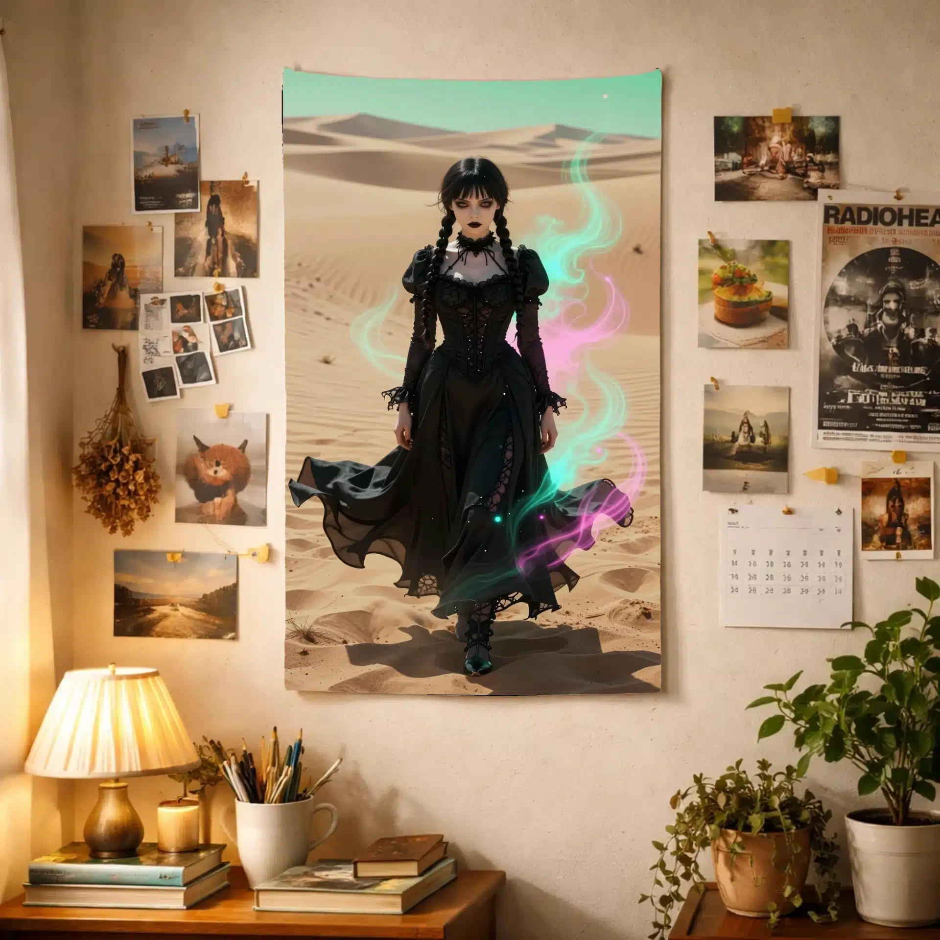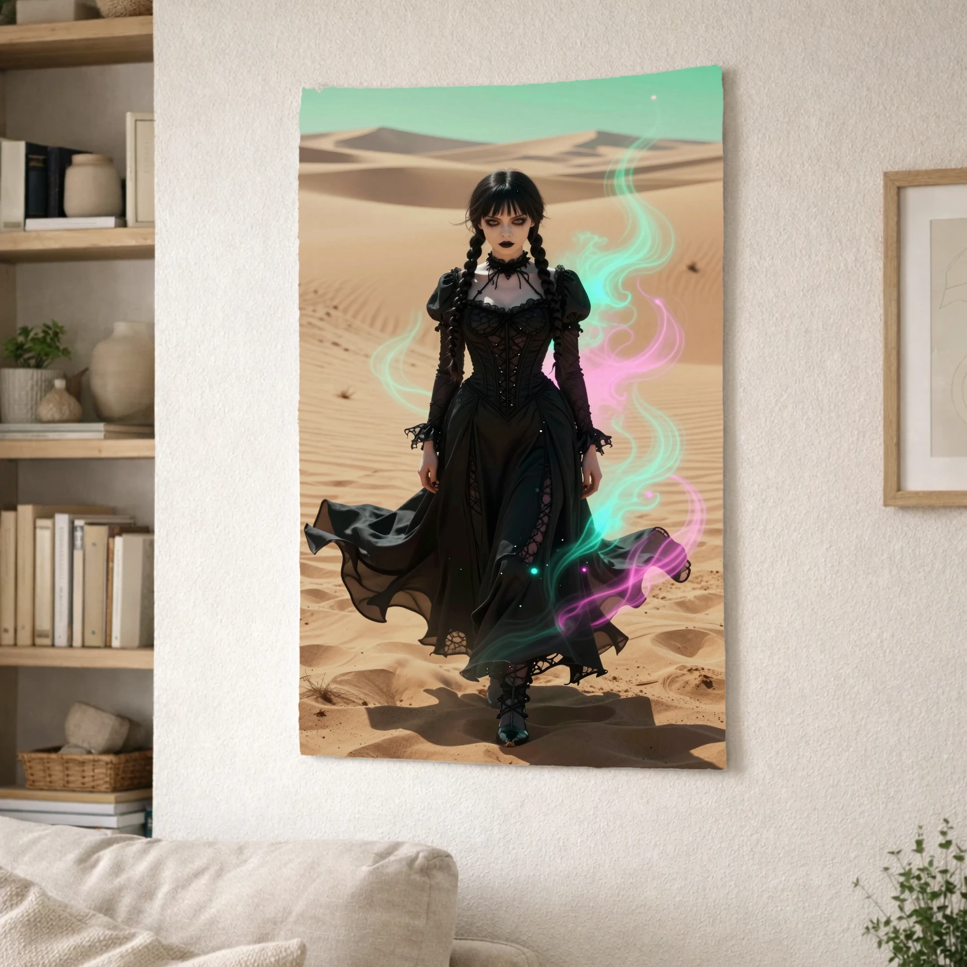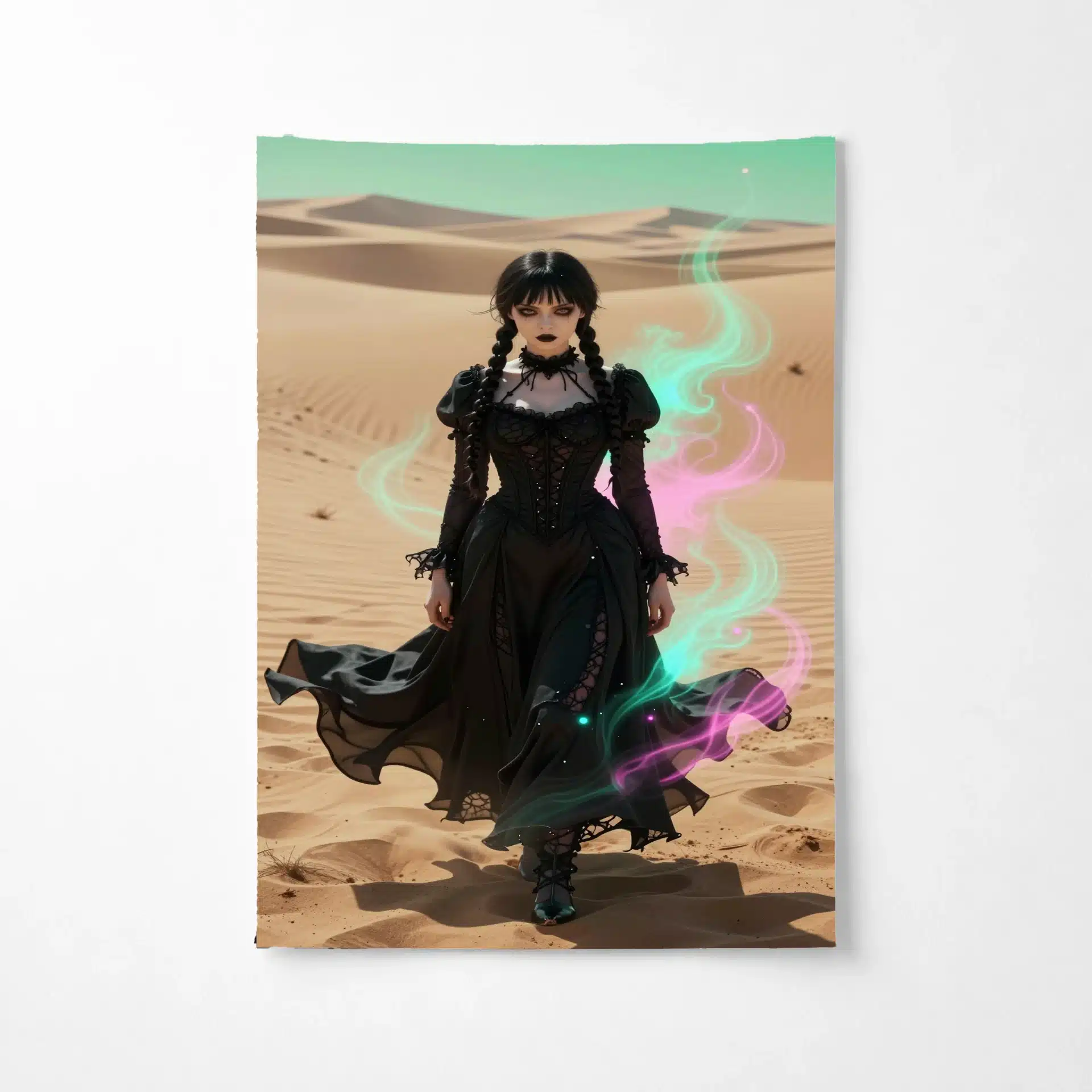 ونزدی آدامز در این تصویر خیرهکننده، با لباس سیاه نمادین خود در میان بیابانی بیپایان ایستاده است. نور شدید و جهتدار، چهرهی رنگپریده و نگاه نافذ او را برجسته میکند، در حالی که تزئینات نئونی صورتی و فیروزهای فضایی رویایی خلق کردهاند.