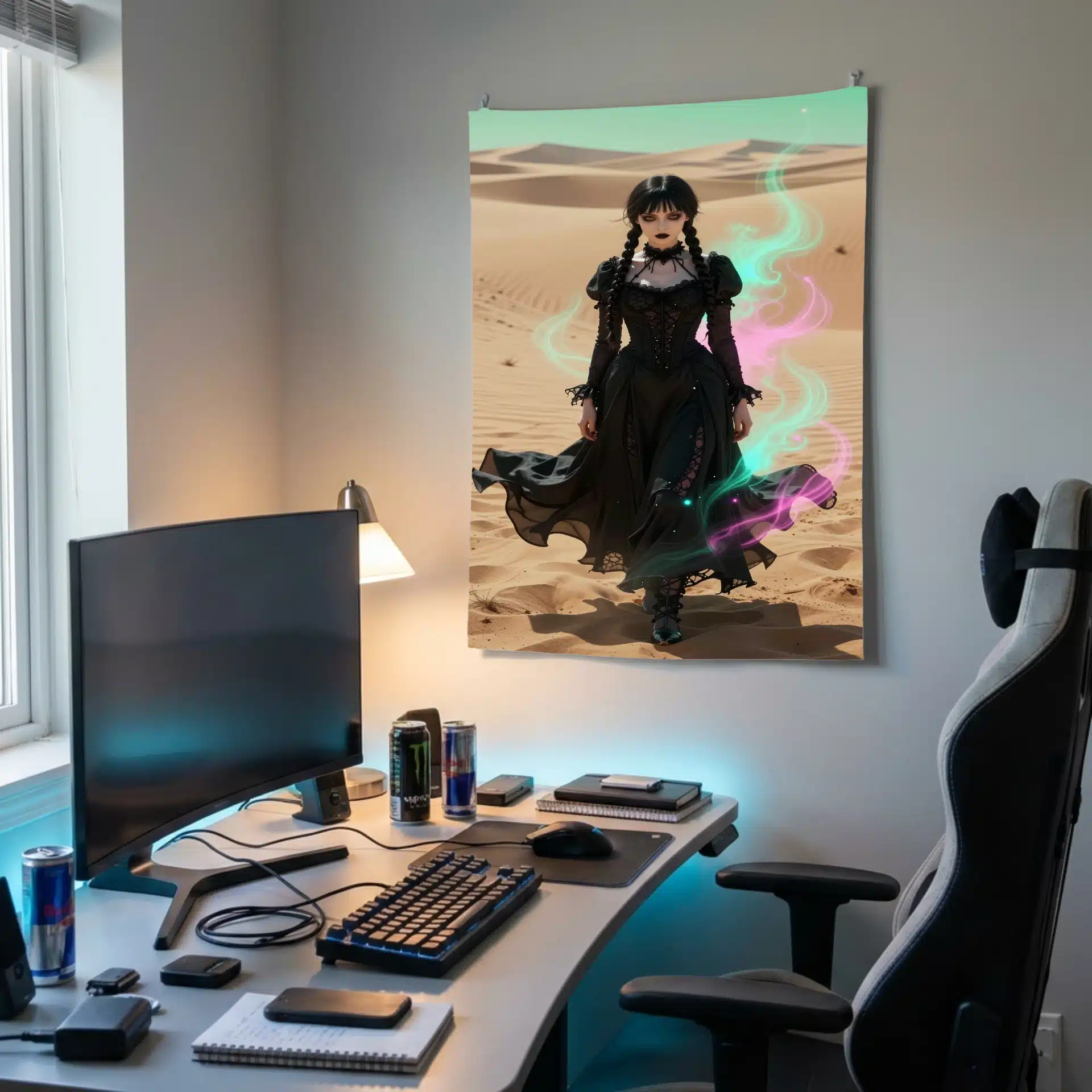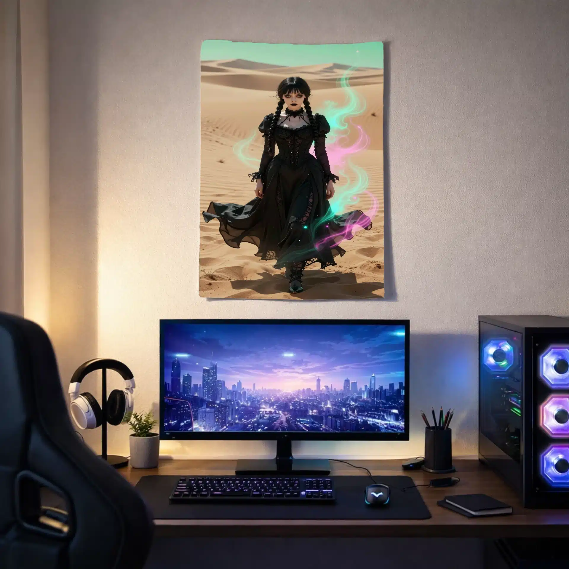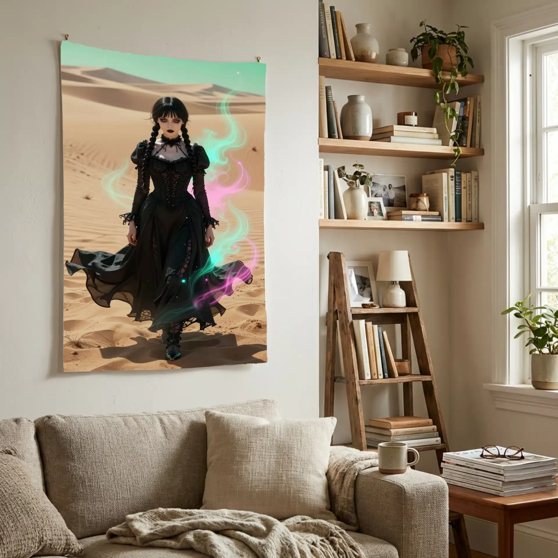 ونزدی آدامز در این تصویر خیرهکننده، با لباس سیاه نمادین خود در میان بیابانی بیپایان ایستاده است. نور شدید و جهتدار، چهرهی رنگپریده و نگاه نافذ او را برجسته میکند، در حالی که تزئینات نئونی صورتی و فیروزهای فضایی رویایی خلق کردهاند.