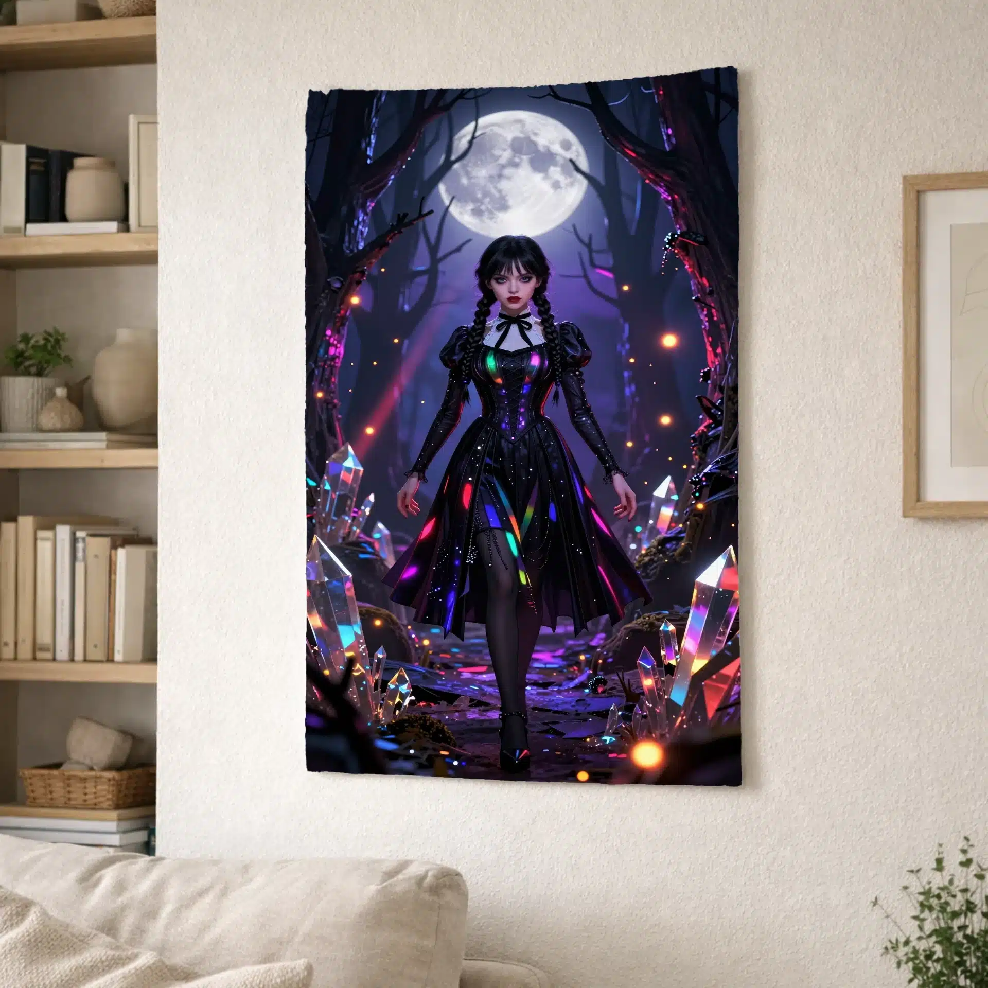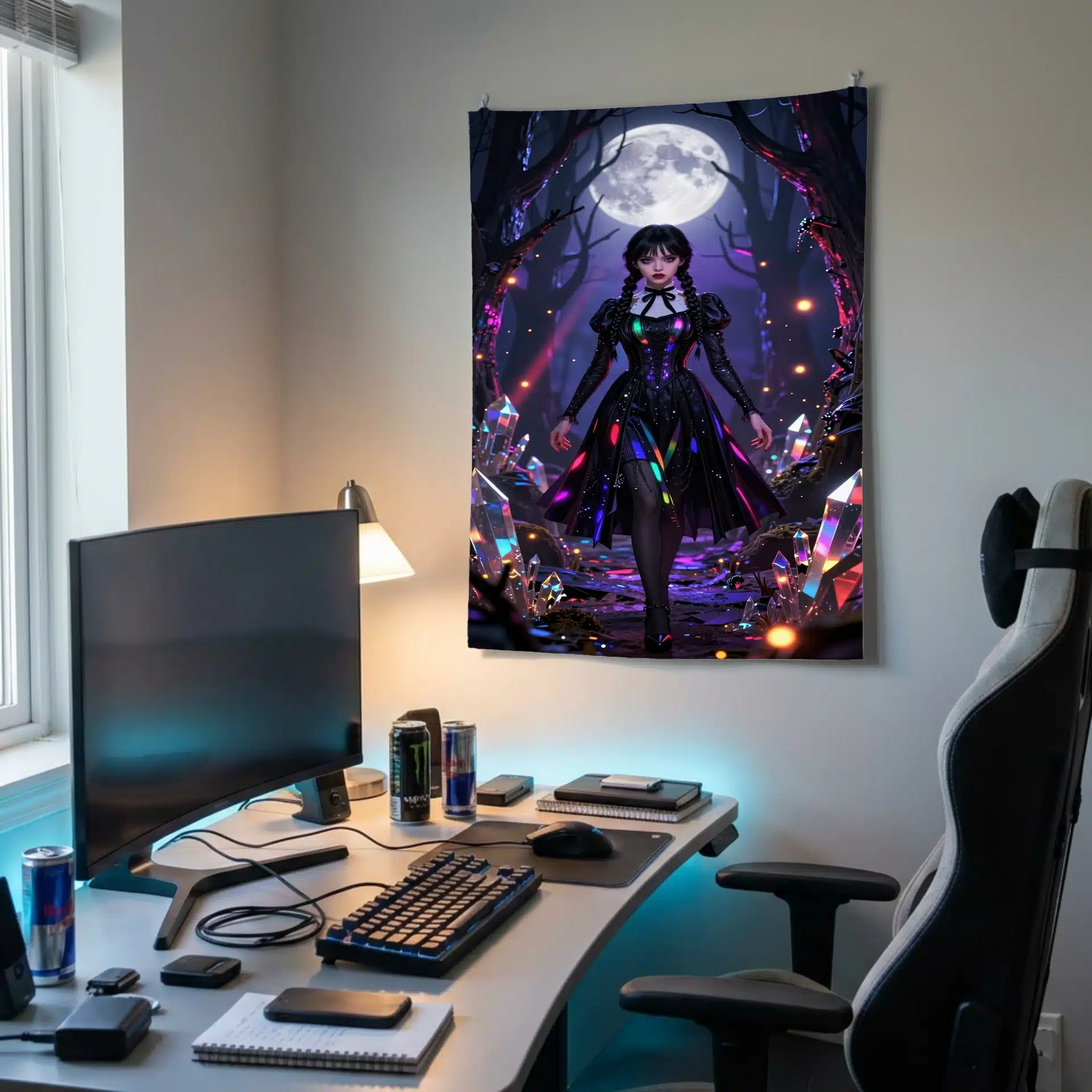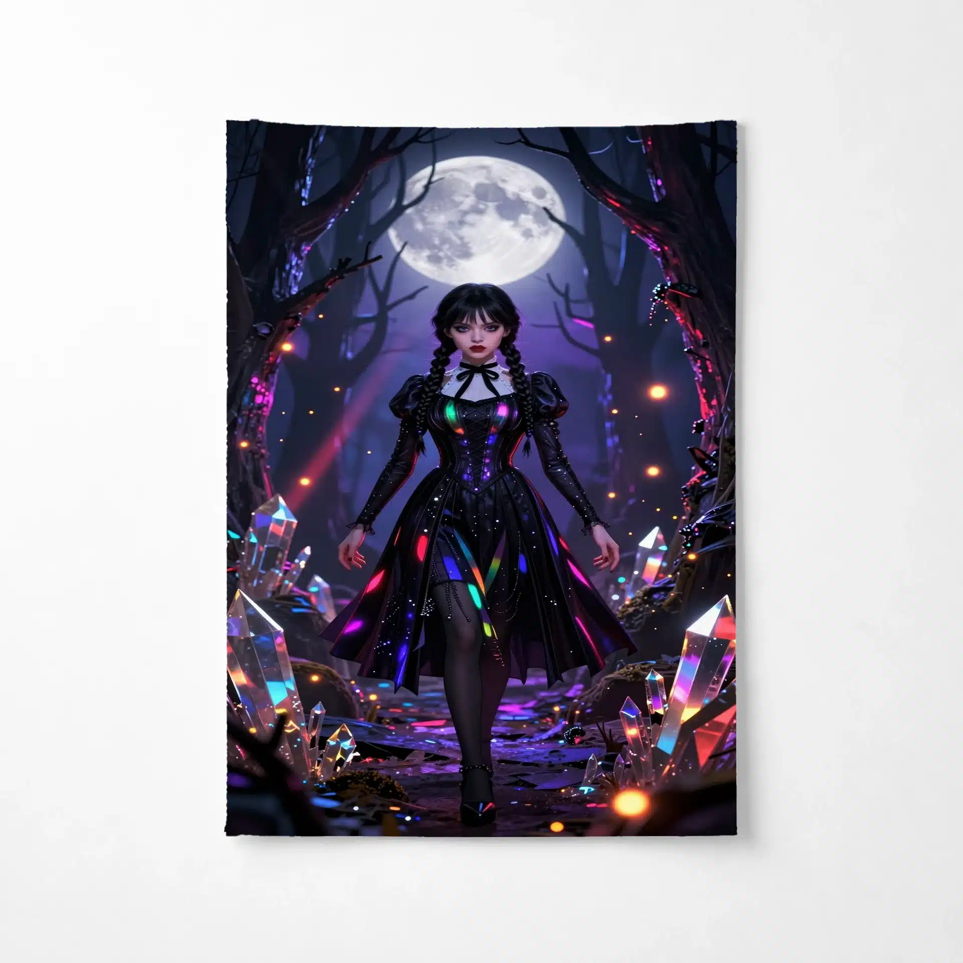 این بکدراپ خیرهکننده از ونزدی آدامز در یک جنگل جادویی با نورپردازی نئون طراحی شده است. تصویر او را با لباس سیاه نمادینش نشان میدهد که زیر نور ماه با هایلایتهای رنگینکمانی درخشان میدرخشد. این اثر با ترکیب زیبایی از فضای گوتیک نئون و جزئیات فوقالعاده، یک والپیپر جذاب و ویرال برای صفحه نمایش موبایل خلق کرده است.
