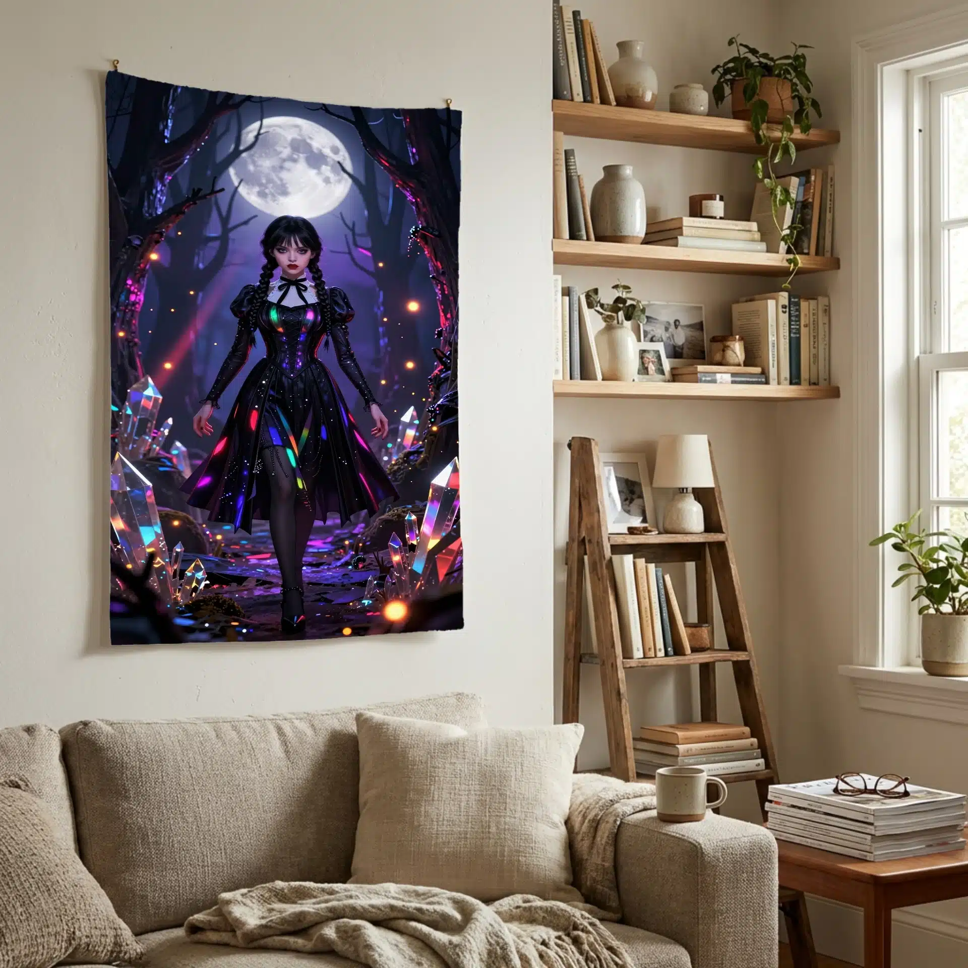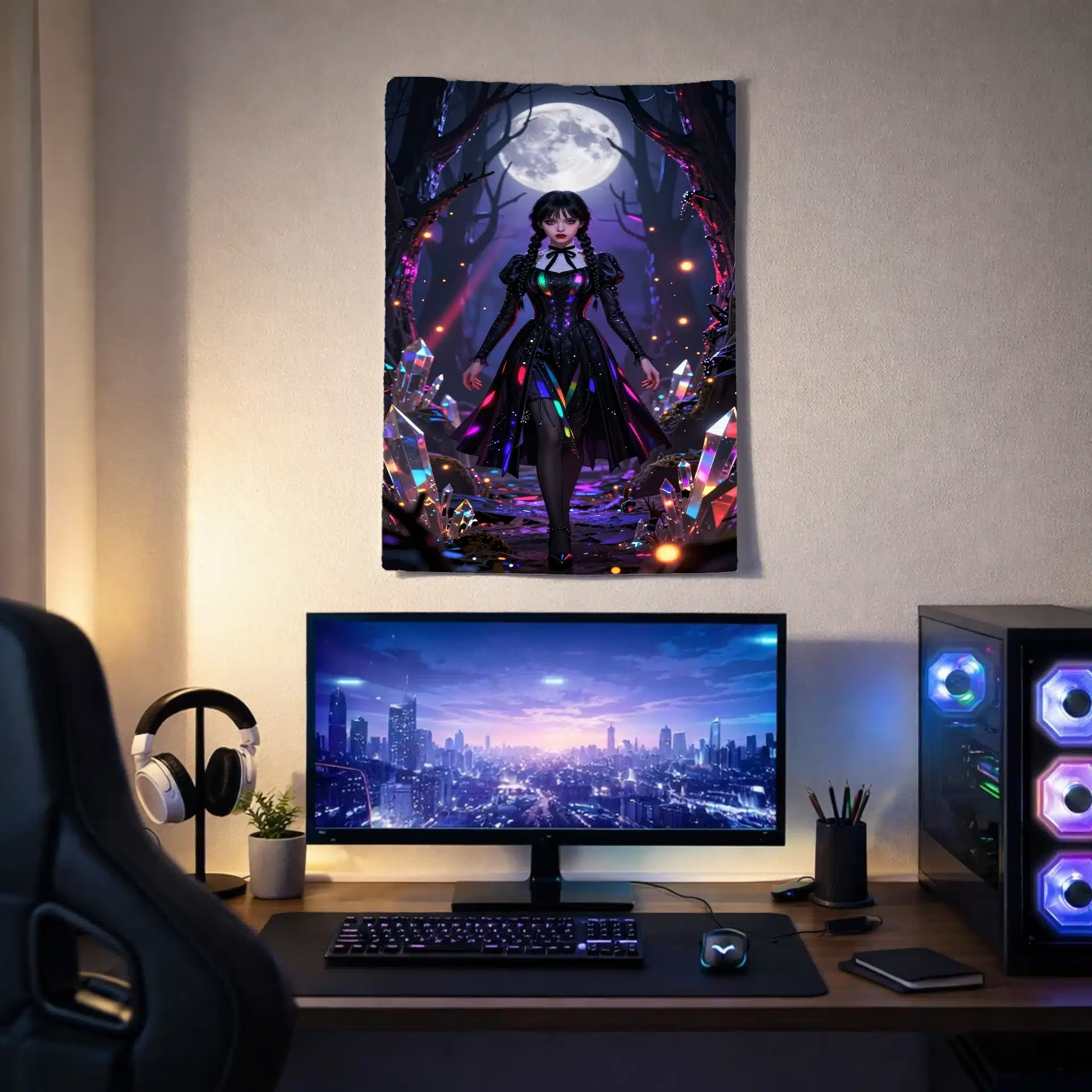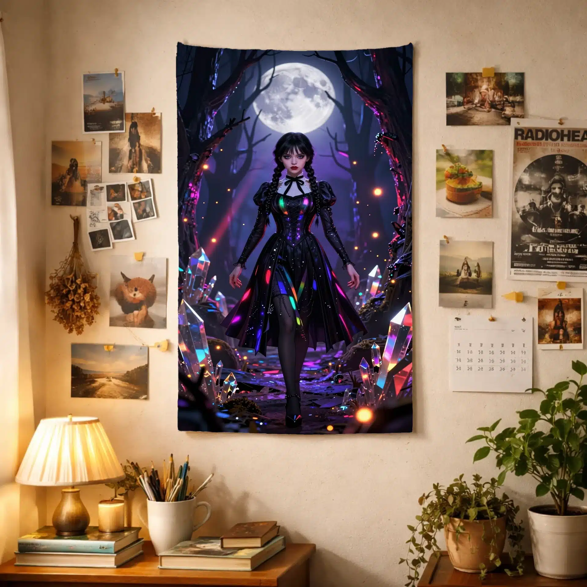 این بکدراپ خیرهکننده از ونزدی آدامز در یک جنگل جادویی با نورپردازی نئون طراحی شده است. تصویر او را با لباس سیاه نمادینش نشان میدهد که زیر نور ماه با هایلایتهای رنگینکمانی درخشان میدرخشد. این اثر با ترکیب زیبایی از فضای گوتیک نئون و جزئیات فوقالعاده، یک والپیپر جذاب و ویرال برای صفحه نمایش موبایل خلق کرده است.