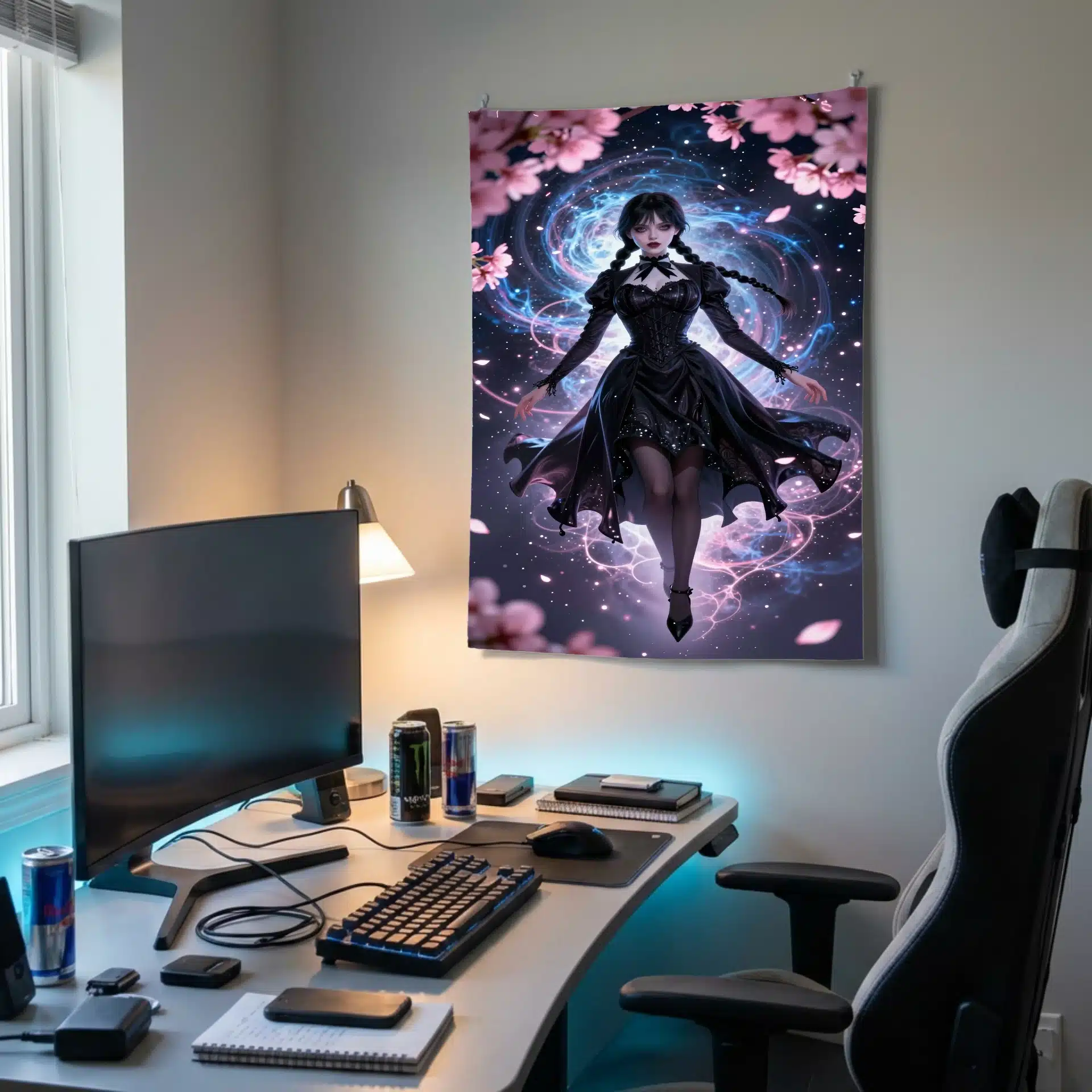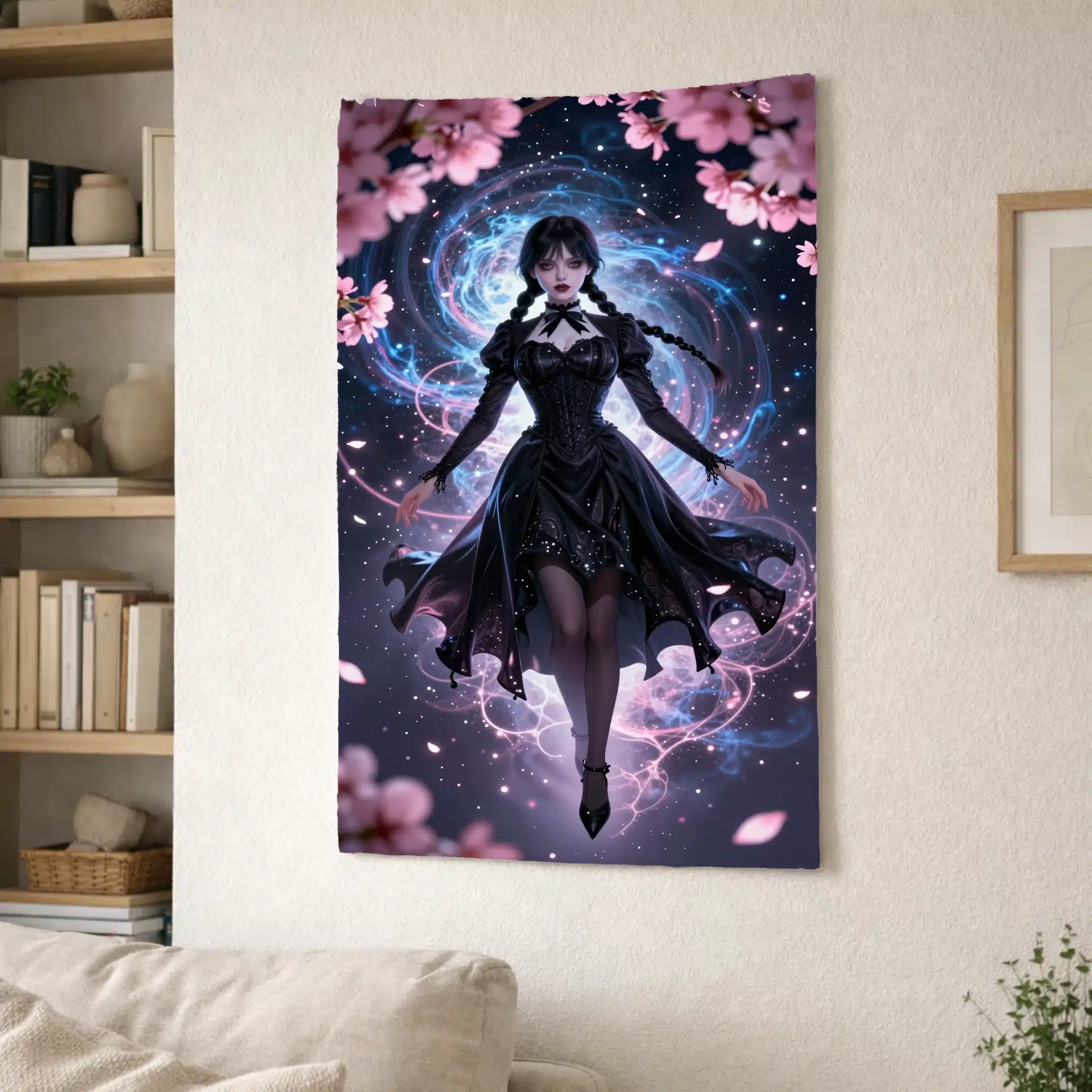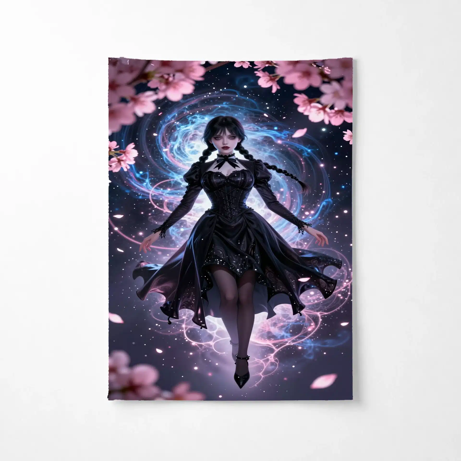 طرح شامل ونزدی با لباس سیاه روان است که در مقابل پسزمینهای کیهانی از سحابیهای آبی و گرد و غبار ستارهای نقرهای شناور است. نورپردازی سینمایی و زاویه دید دینامیک، ترکیبی جذاب از ظرافت گوتیک و مدرنیته را خلق میکند.