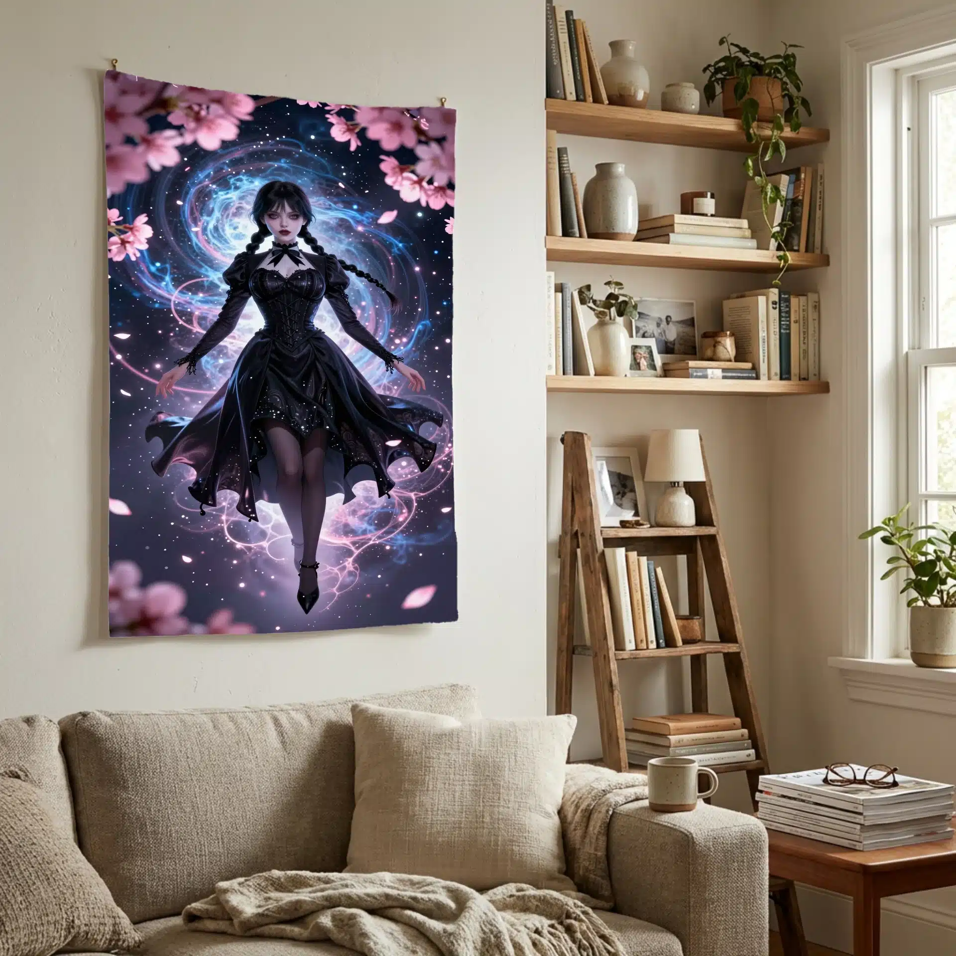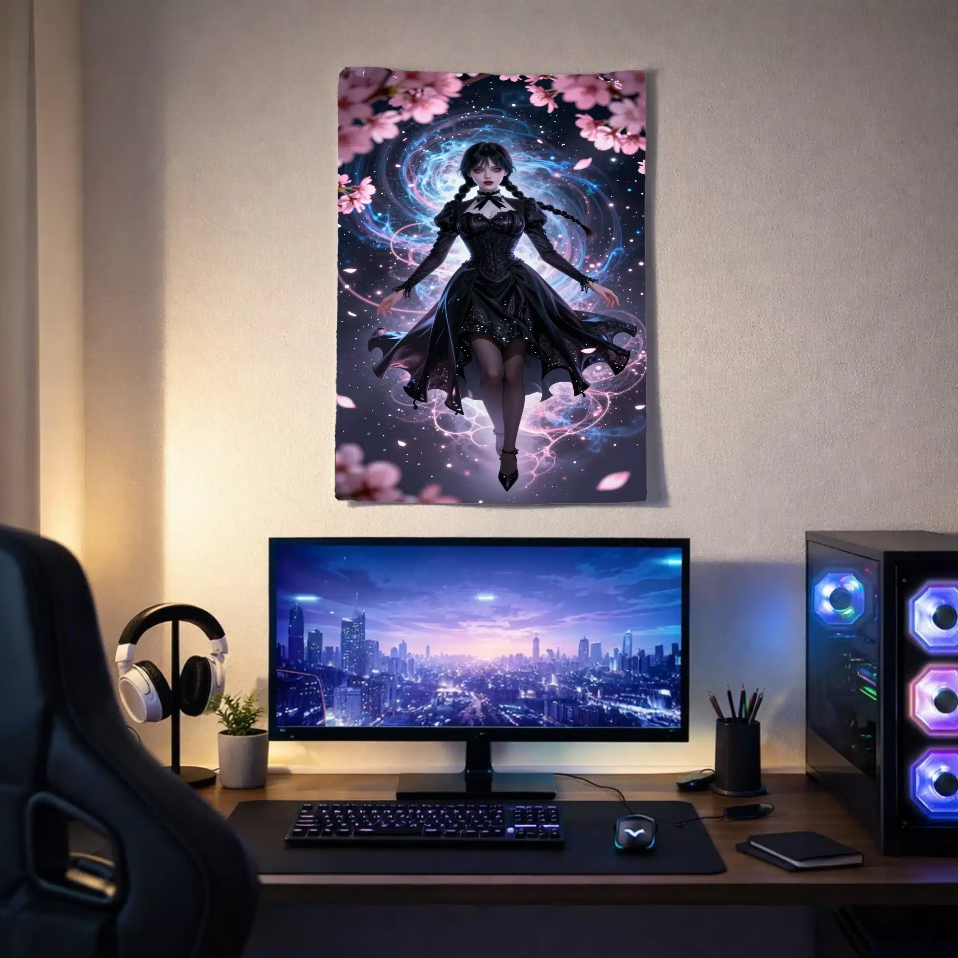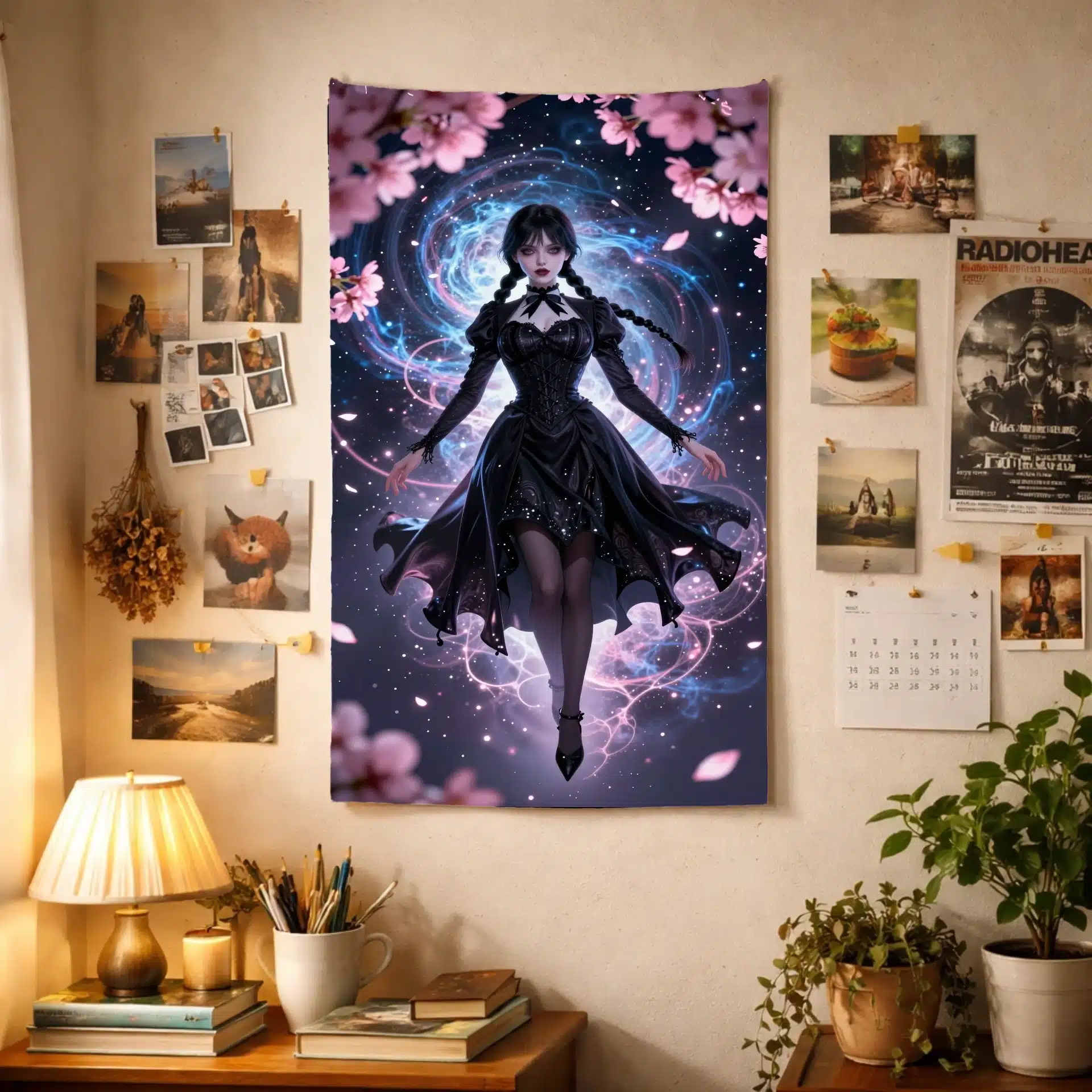 طرح شامل ونزدی با لباس سیاه روان است که در مقابل پسزمینهای کیهانی از سحابیهای آبی و گرد و غبار ستارهای نقرهای شناور است. نورپردازی سینمایی و زاویه دید دینامیک، ترکیبی جذاب از ظرافت گوتیک و مدرنیته را خلق میکند.