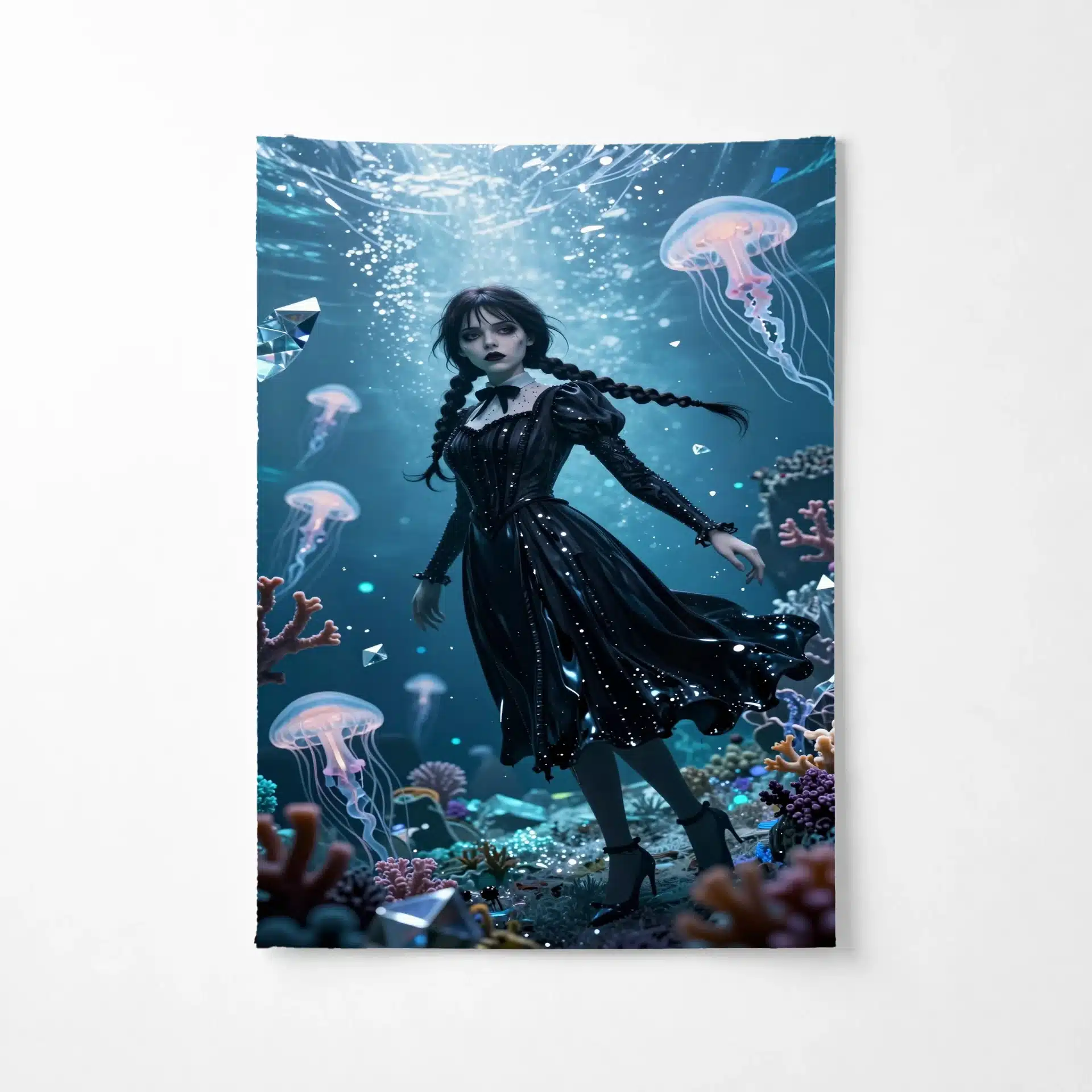 لباس سیاه ونزدی مانند جوهر مایع در جریانهای فیروزهای و نقرهای به نظر میرسد، در حالی که موهای او به صورت اتری در آب شناور است. کریستالهای یخ هندسی و نورهای فلورسنت آبی، ترکیبی جذاب از زیبایی گوتیک و دنیای دیگر را ایجاد میکنند.