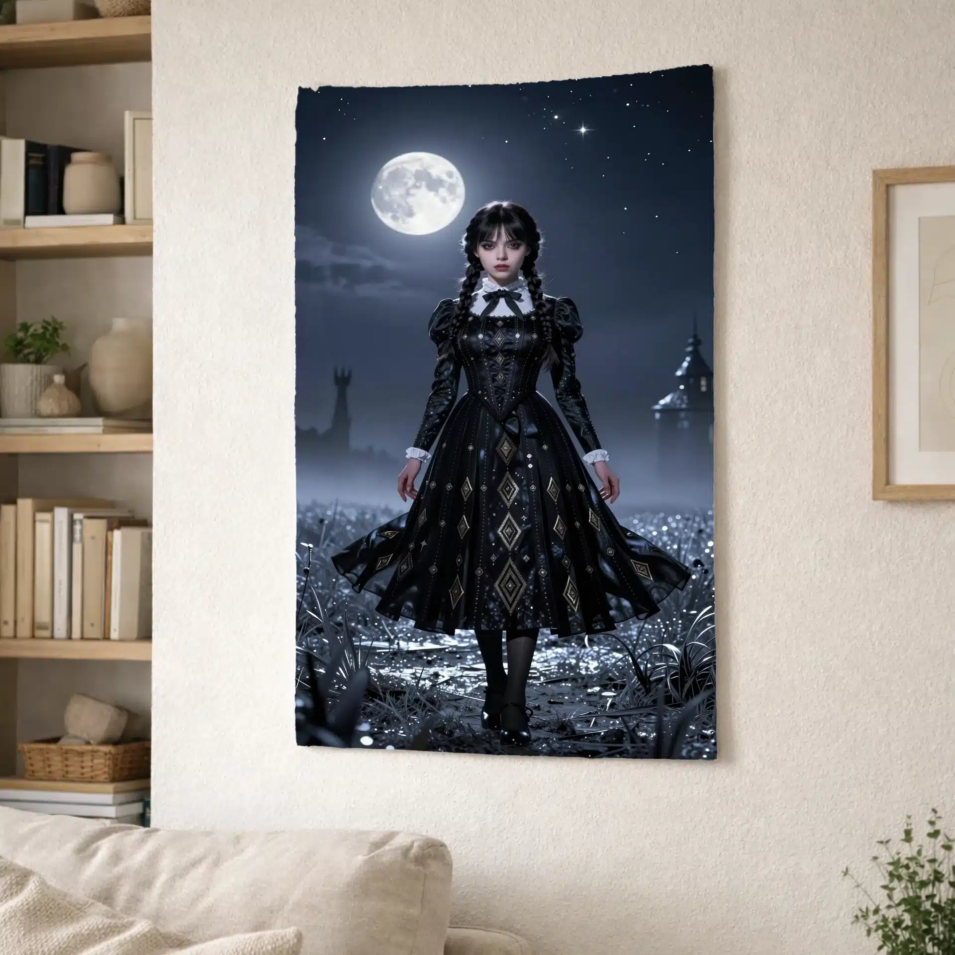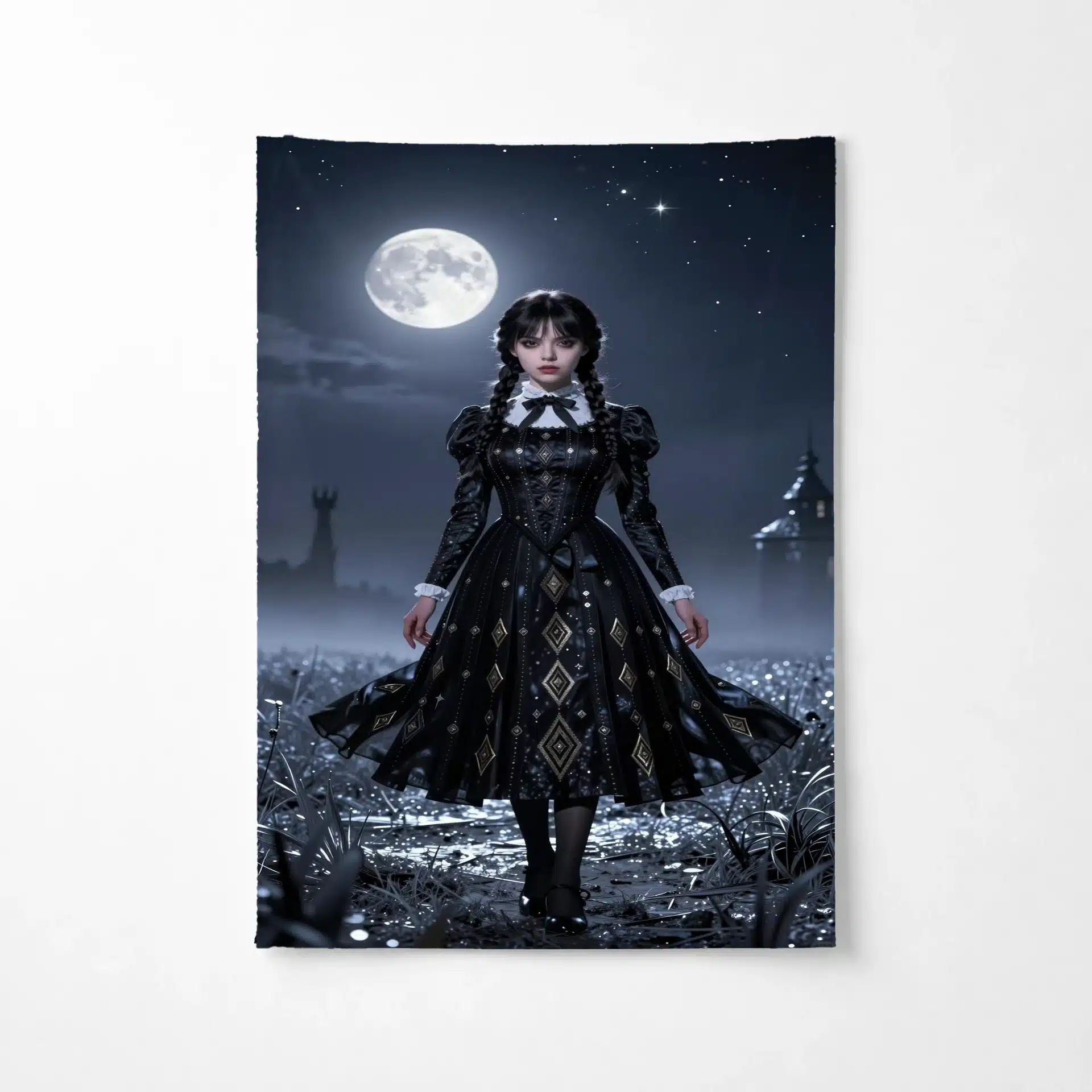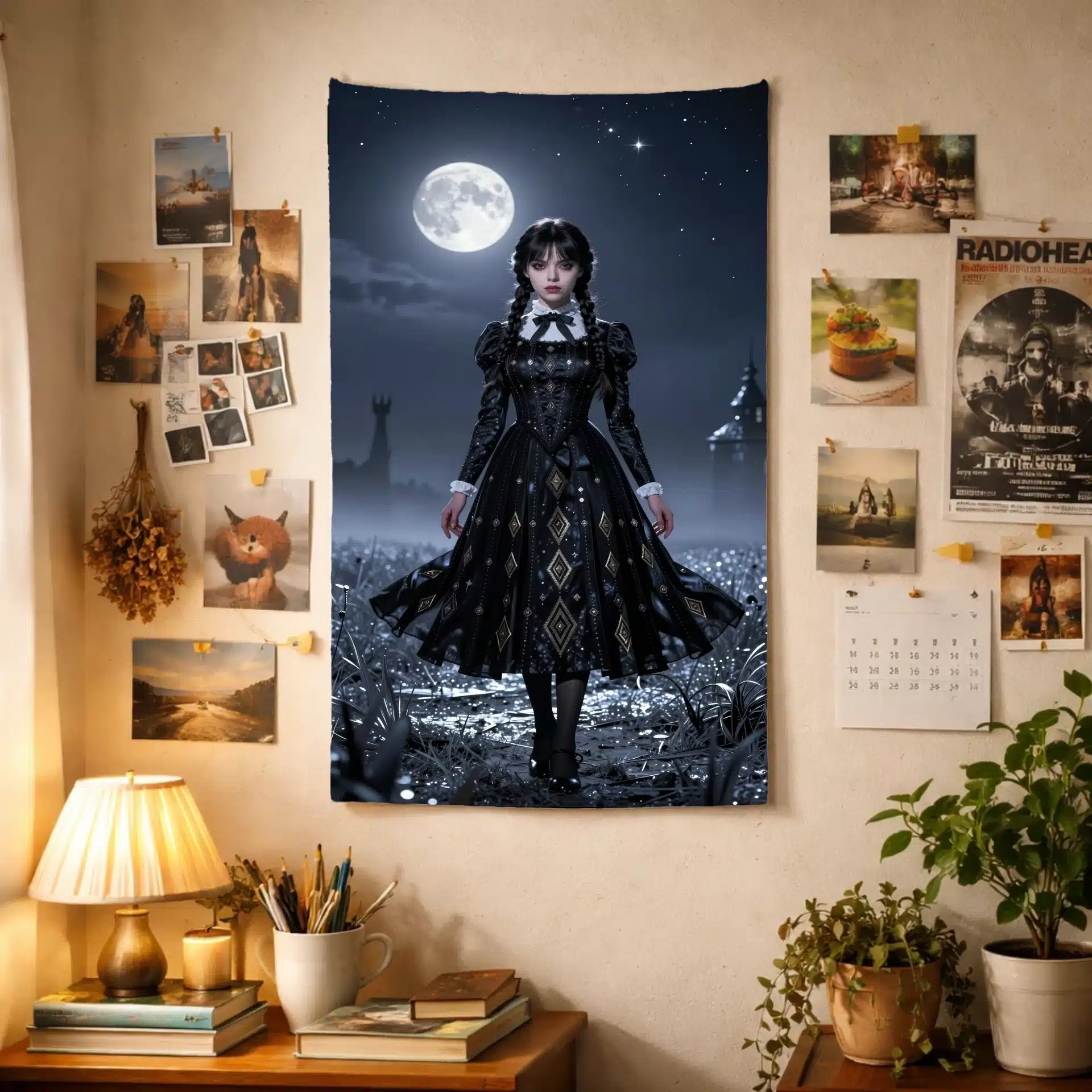 این بکدراپ خیرهکننده از ونزدی آدامز در یک منظره نقرهای مهگرفته و زیر نور ماه طراحی شده است. ترکیب لباس سیاه نمادین او با طرحهای هندسی پیچیده و پسزمینه ستارهای، فضایی سینمایی و رویایی خلق کرده است.