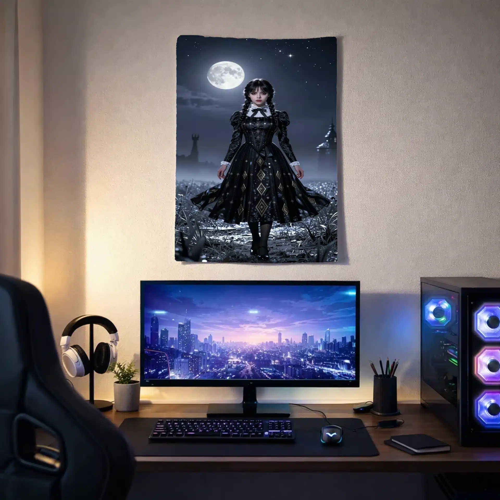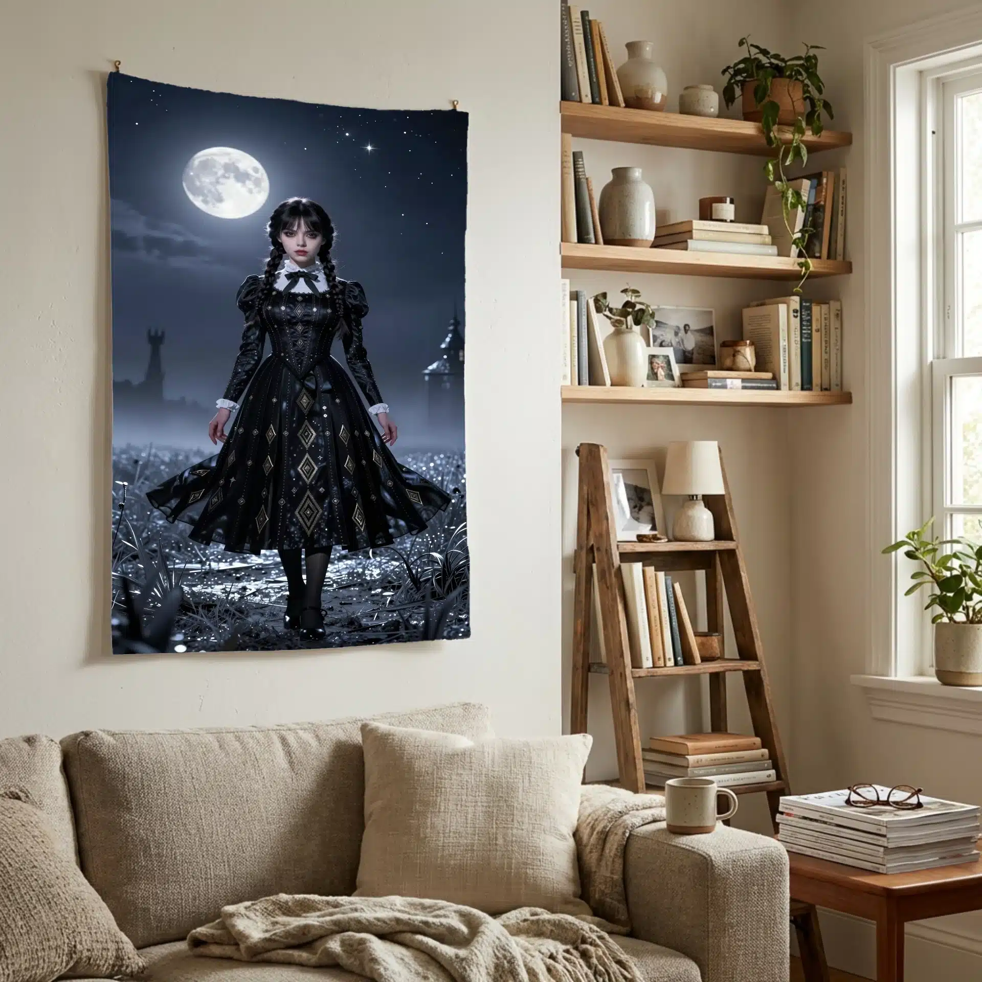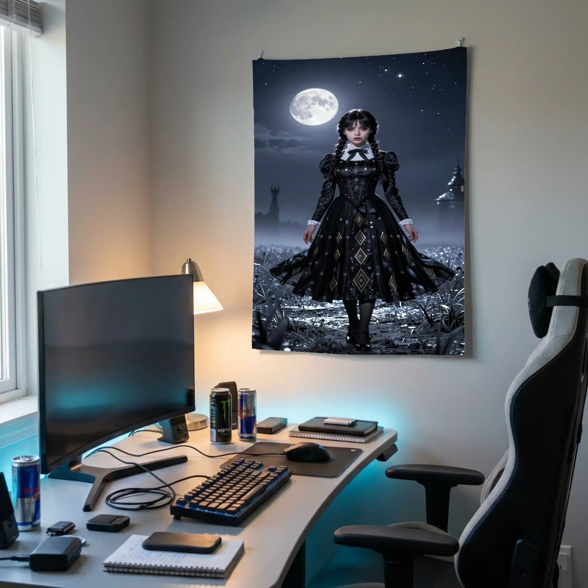 این بکدراپ خیرهکننده از ونزدی آدامز در یک منظره نقرهای مهگرفته و زیر نور ماه طراحی شده است. ترکیب لباس سیاه نمادین او با طرحهای هندسی پیچیده و پسزمینه ستارهای، فضایی سینمایی و رویایی خلق کرده است.