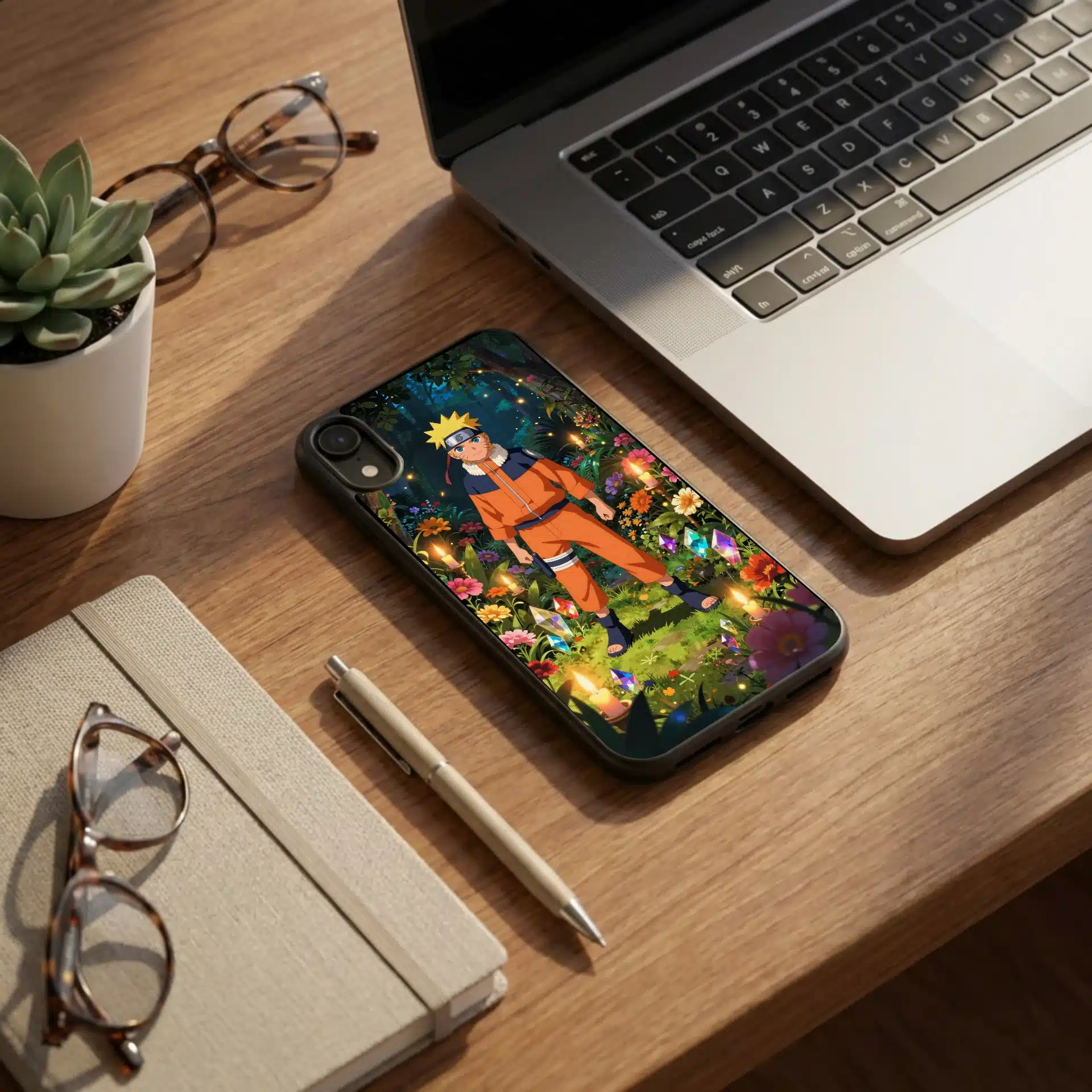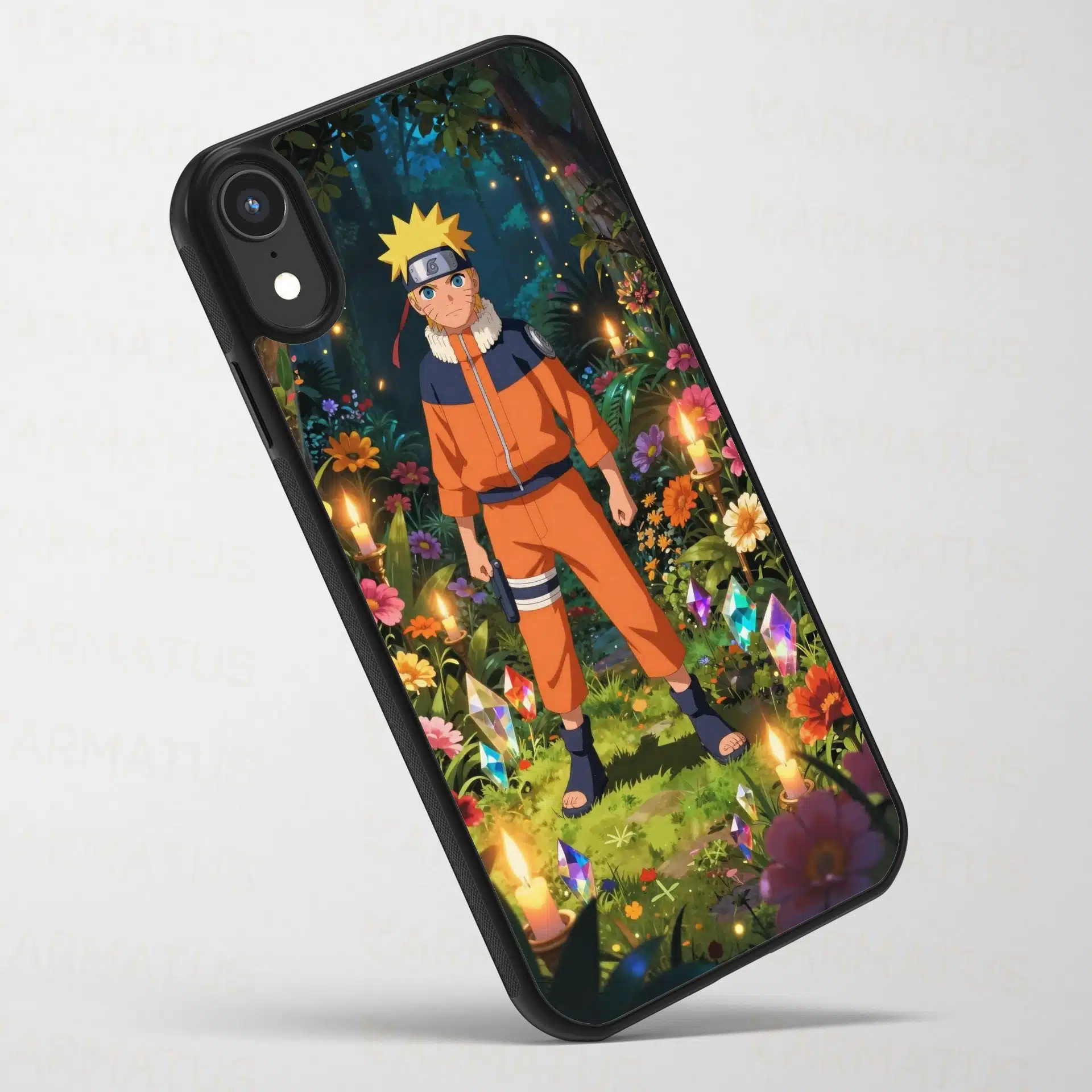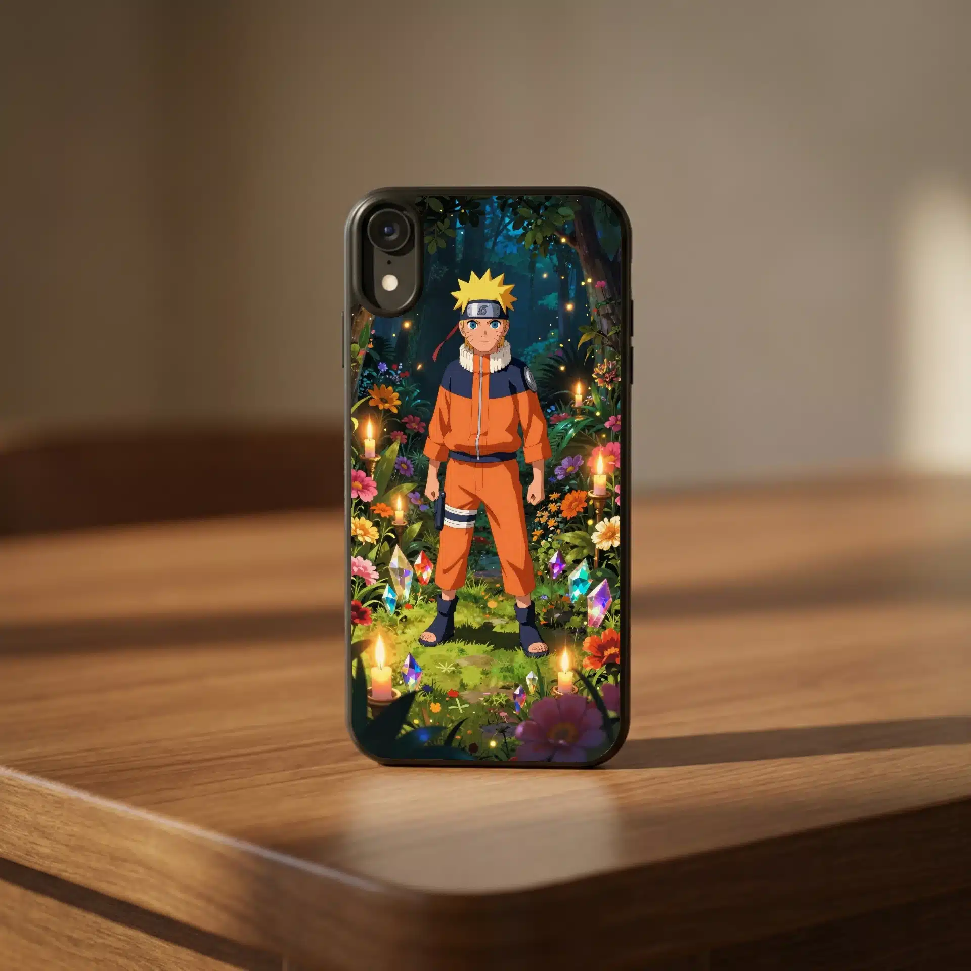 طرح این قاب موبایل شامل ناروتو در میان گلهای رنگارنگ و برگهای زمردین است که با نور شمعها و سنگهای درخشان احاطه شدهاند. استفاده از لنز fisheye و پراکندگی نور، فضایی پویا و جادویی خلق کرده است.