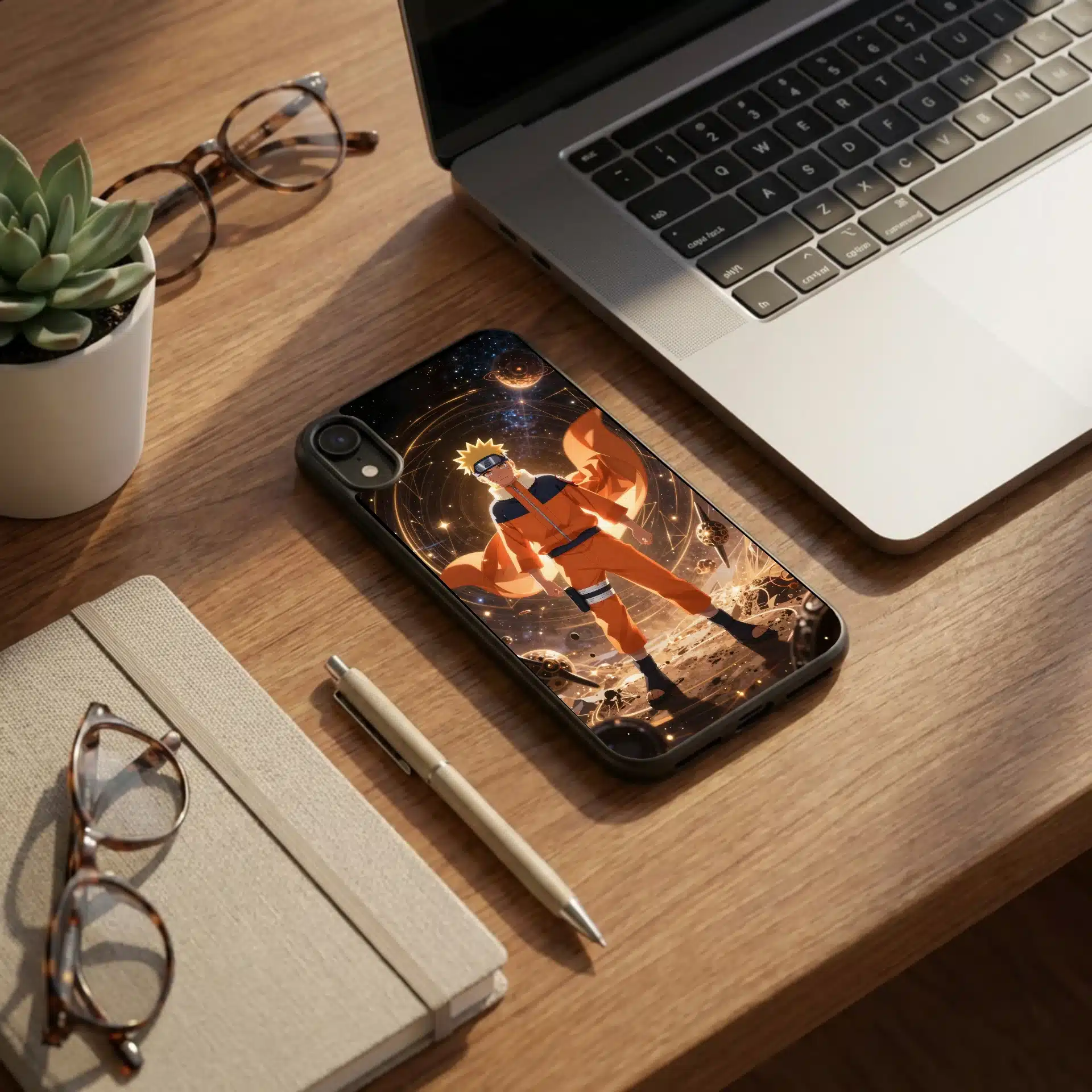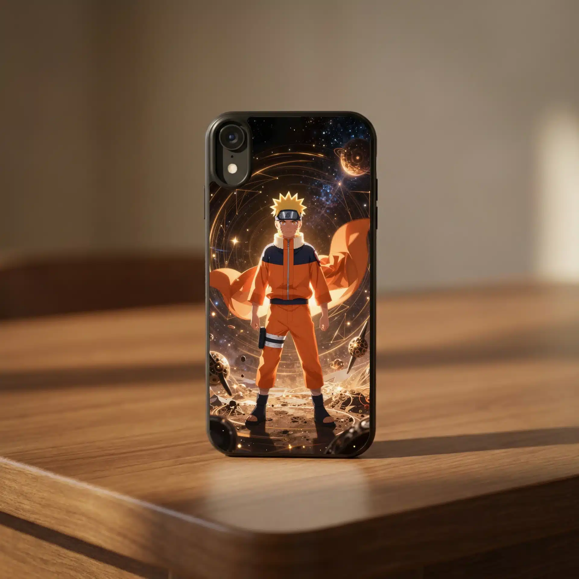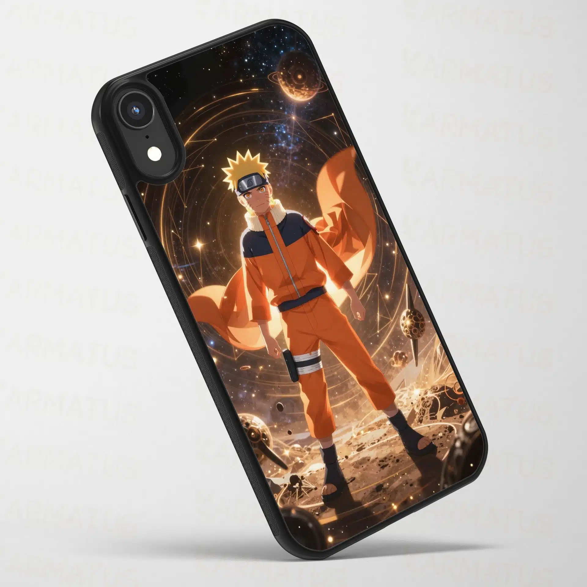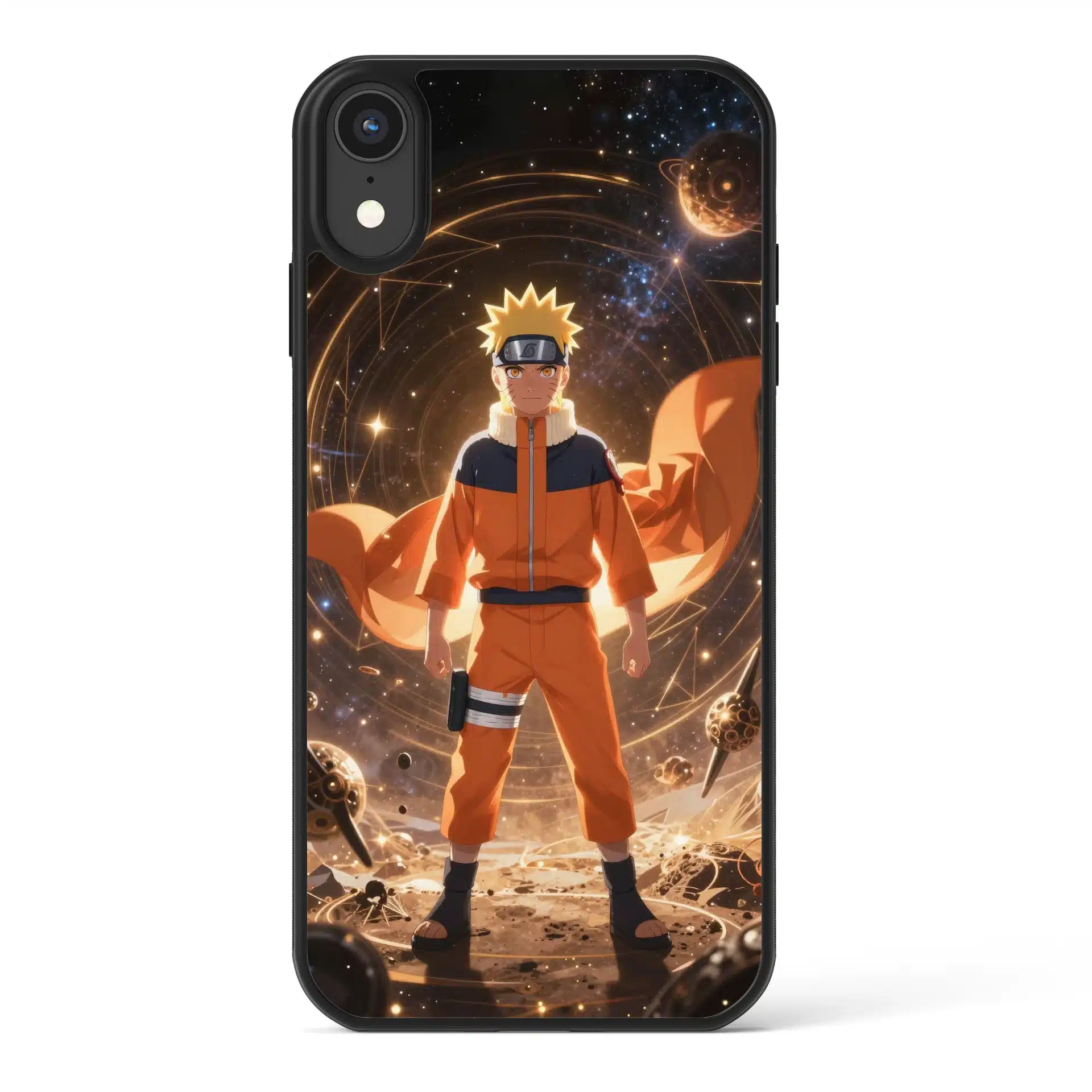 قاب موبایل ناروتو با طراحی خیرهکنندهای از ناروتو اوزوماکی در فضای بیکران ارائه شده است. او با نگاهی مصمم و پرانرژی در میان الگوهای هندسی درخشان و شفقمیدرخشد، گویی در حال کنترل انرژی کیهانی است.