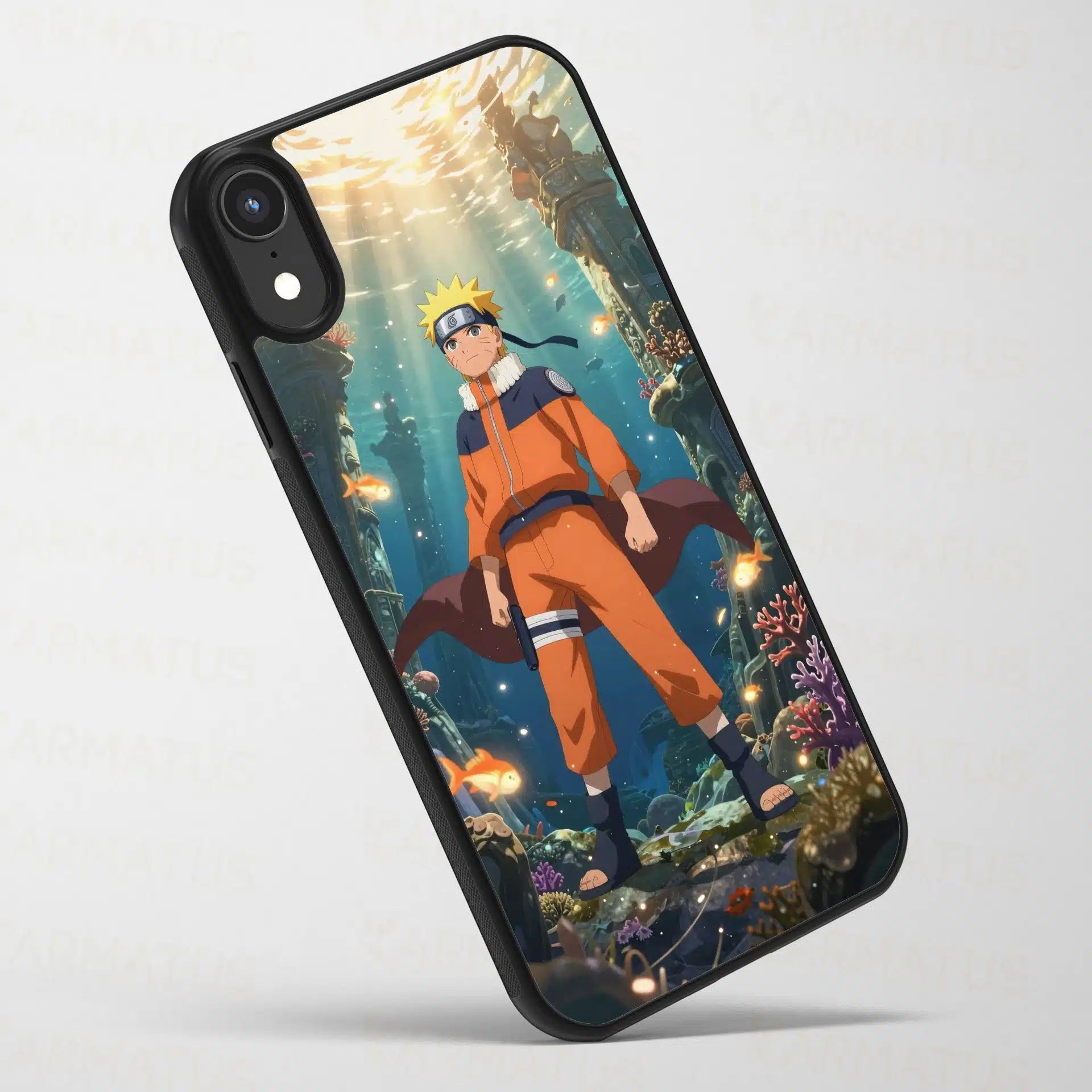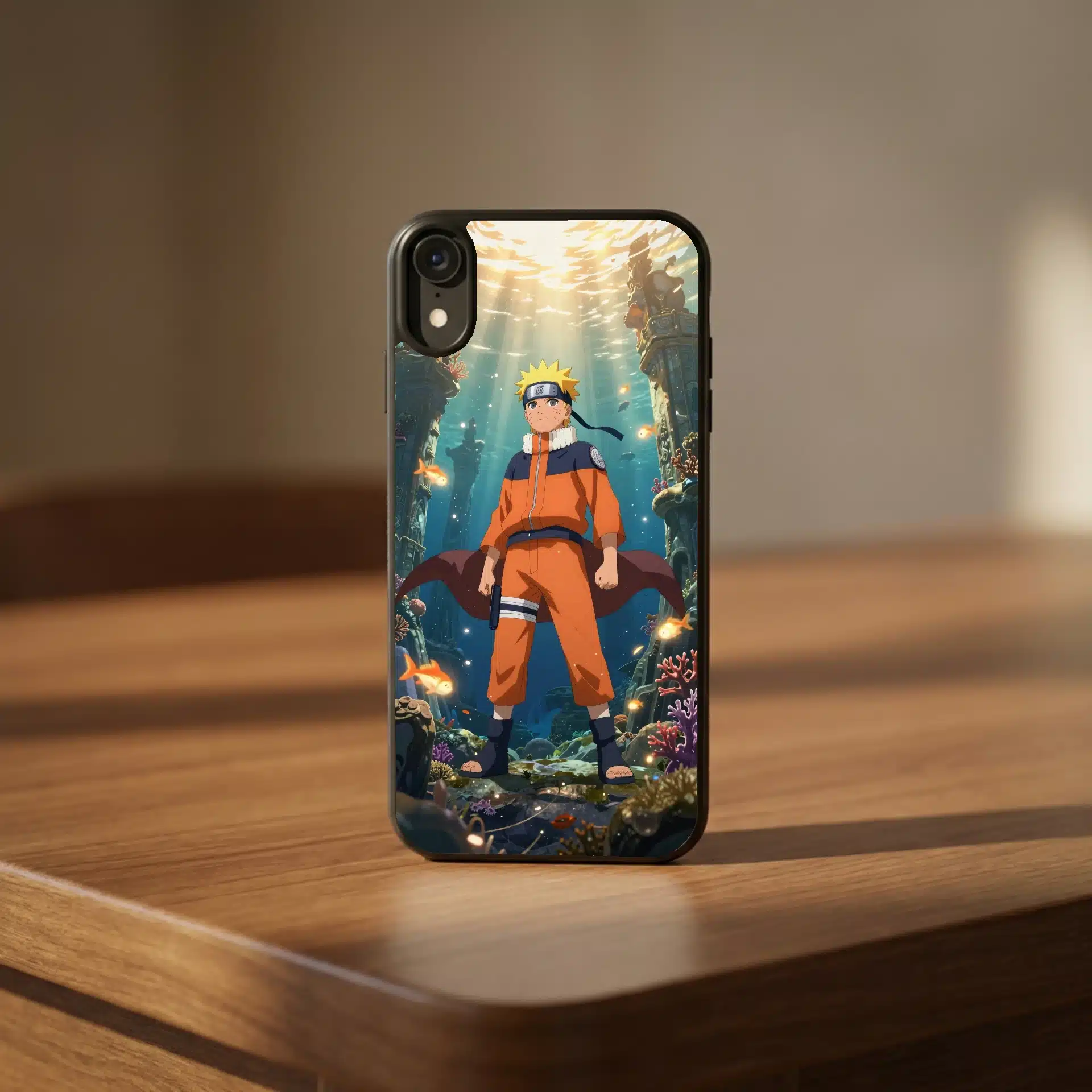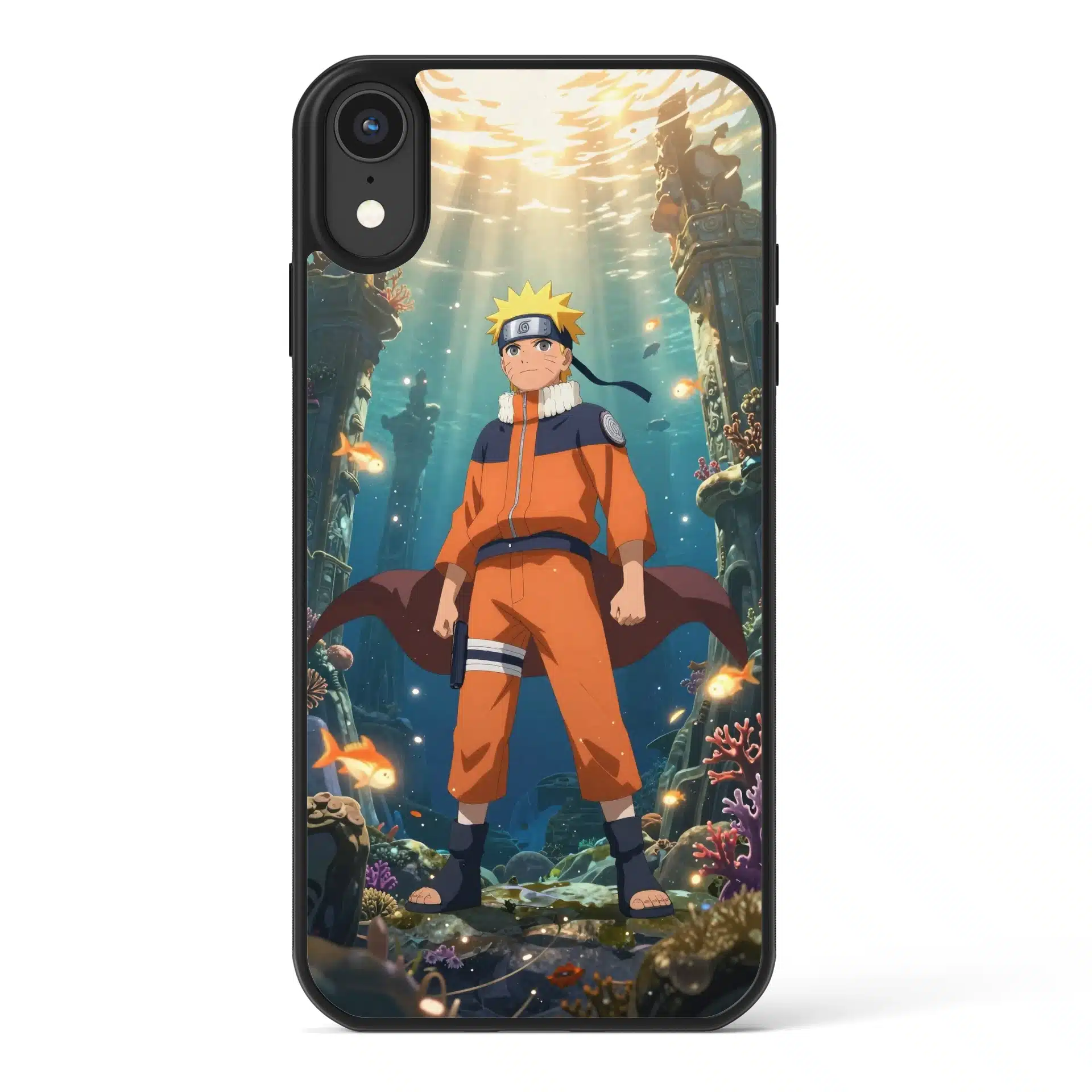 طرح این قاب موبایل با جزئیات دقیق، تضاد رنگ نارنجی لباس ناروتو با آبی آب و بافتهای باستانی اطراف را به زیبایی نشان میدهد. ماهیهای درخشان و نورهای رقصان روی ستونهای مرجانی، جلوهای پویا و آرامشبخش به تصویر بخشیدهاند.