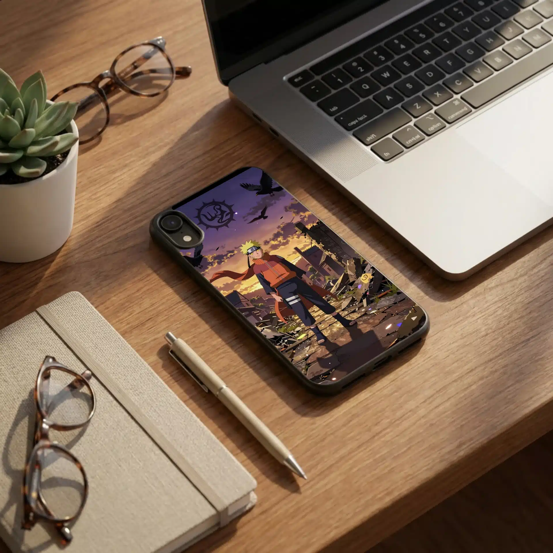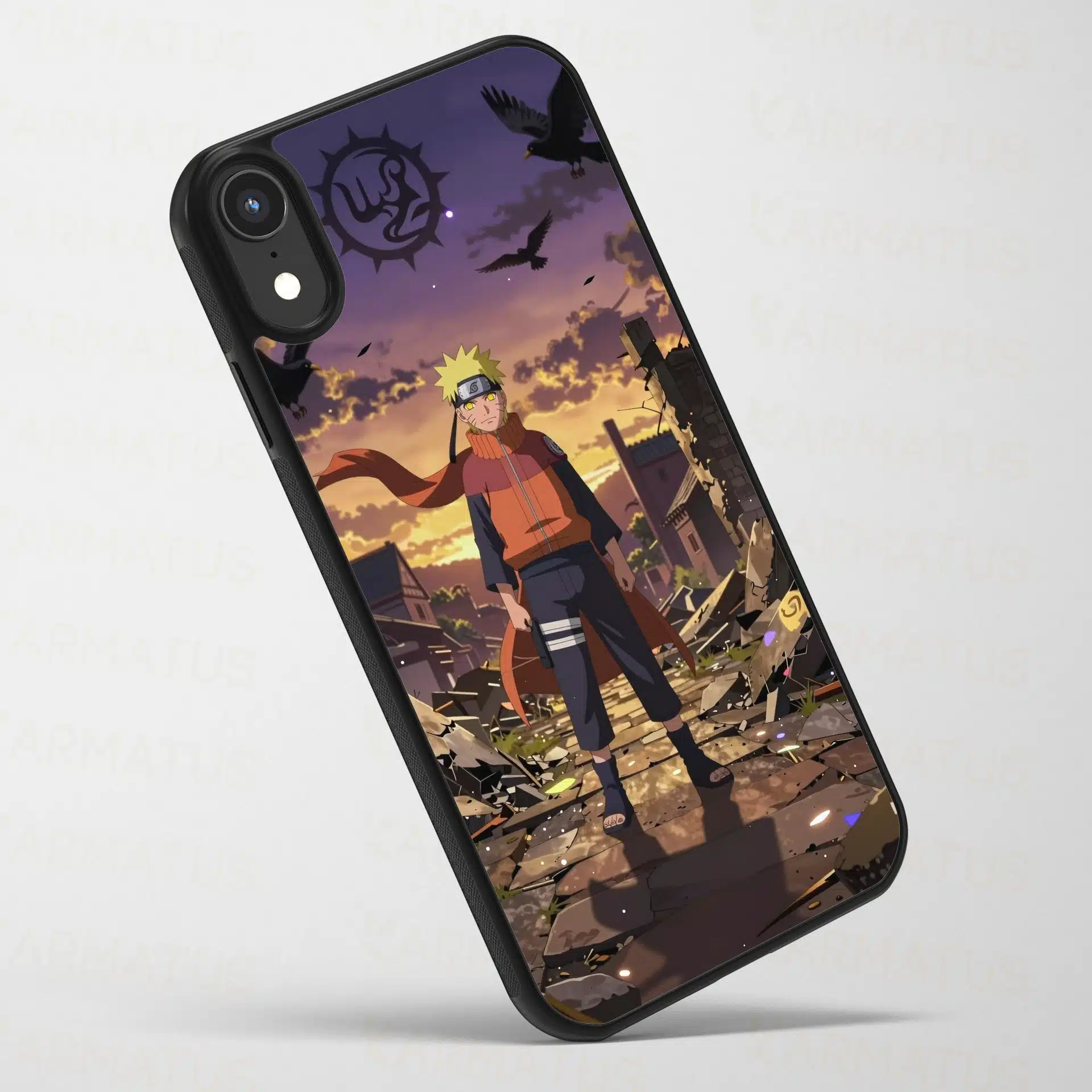 ناروتو تنها در میان ویرانههای دهکده برگ ایستاده است، سایهاش بر روی سنگفرشهای شکسته کشیده شده و دستمال نارنجی پارهای را محکم در دست گرفته است. این صحنه، نمادی از بلوغ و عزم راسخ او به عنوان هوکاگه است، نه خشم بیپروای گذشته.
