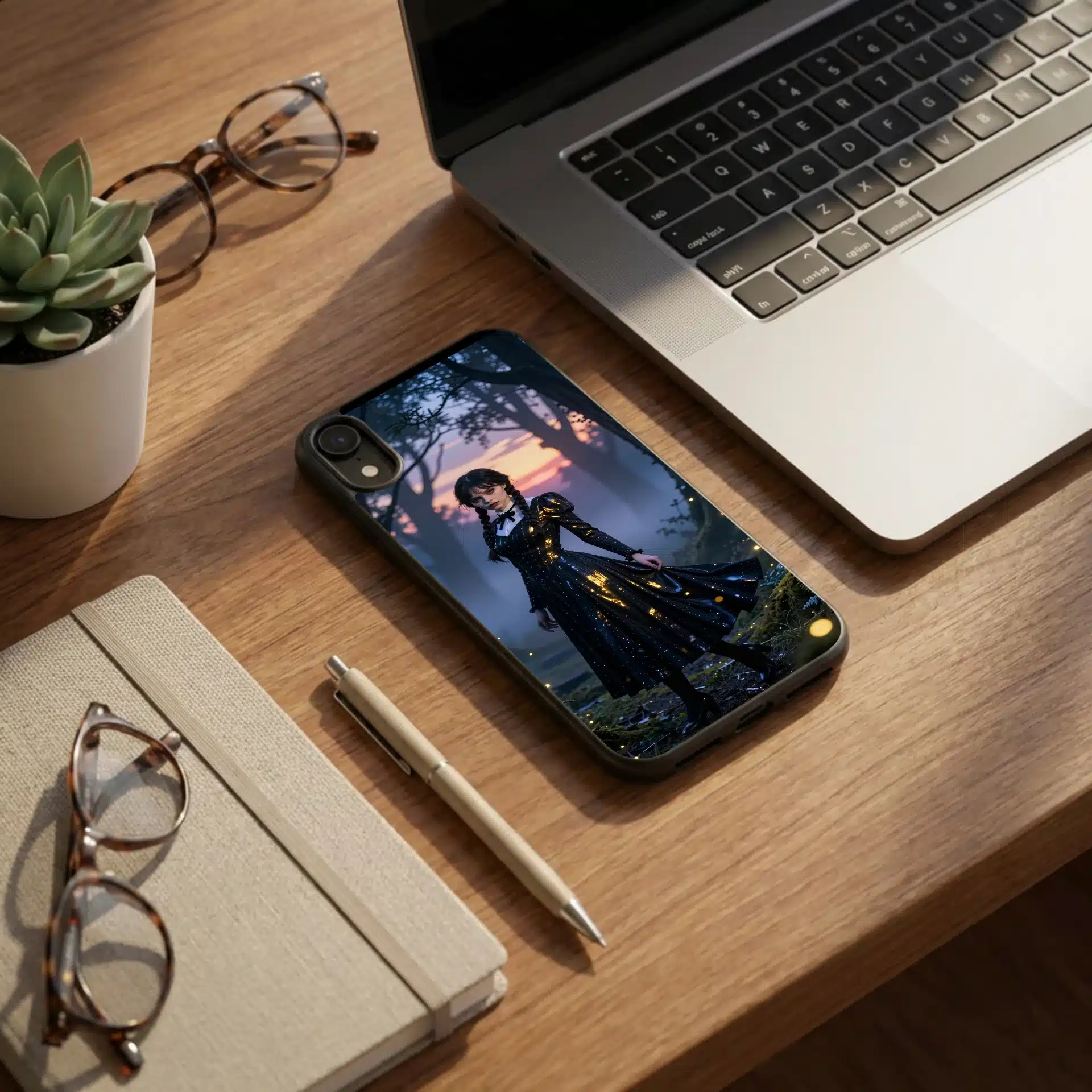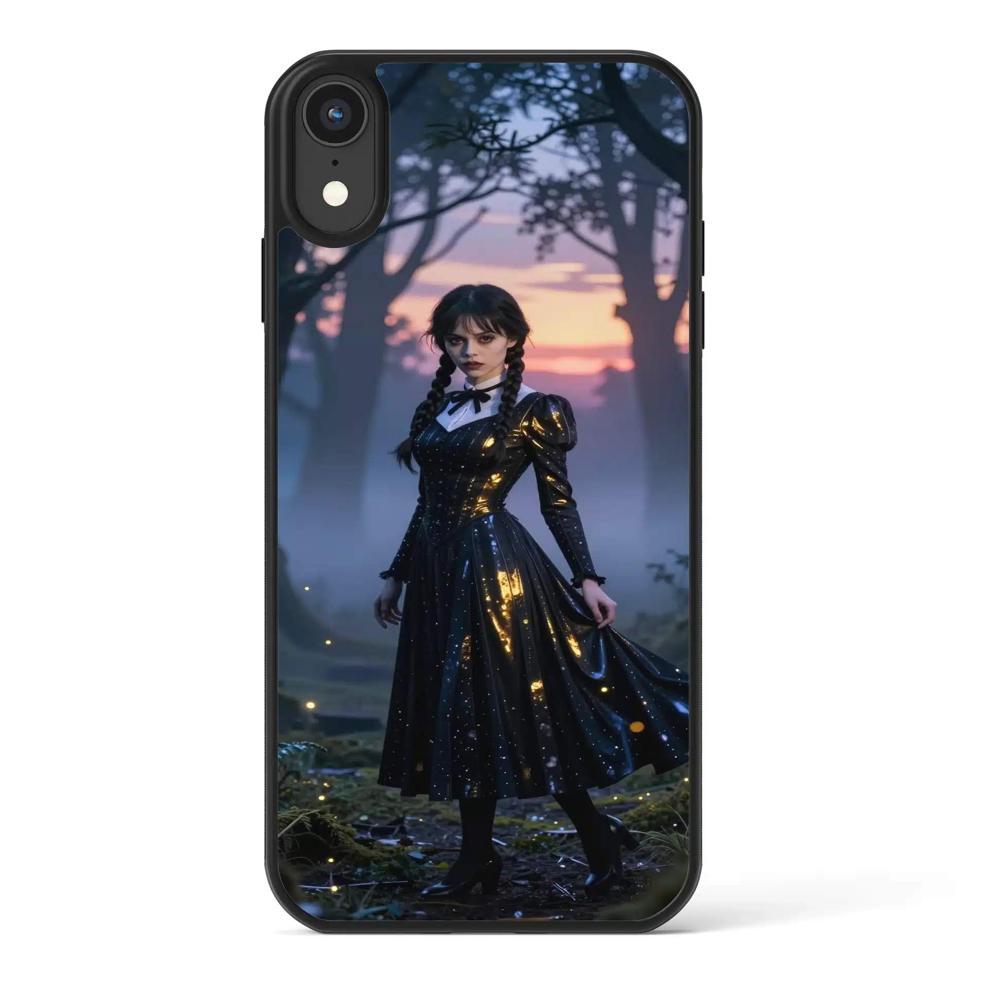 ونزدی آدامز در یک جنگل افسونشده و مهآلود در گرگومیش غروب، زیر نور سورئال غروب خورشید با هایلایتهای فلورسنت خنک ایستاده است. لباس سیاه نمادین او با ظرافت در حال حرکت است و انعکاس طلایی نور خورشید را به نمایش میگذارد، در حالی که نگاه نافذش با سایههای آبی عمیق درختان بلند تضاد زیبایی ایجاد میکند.
