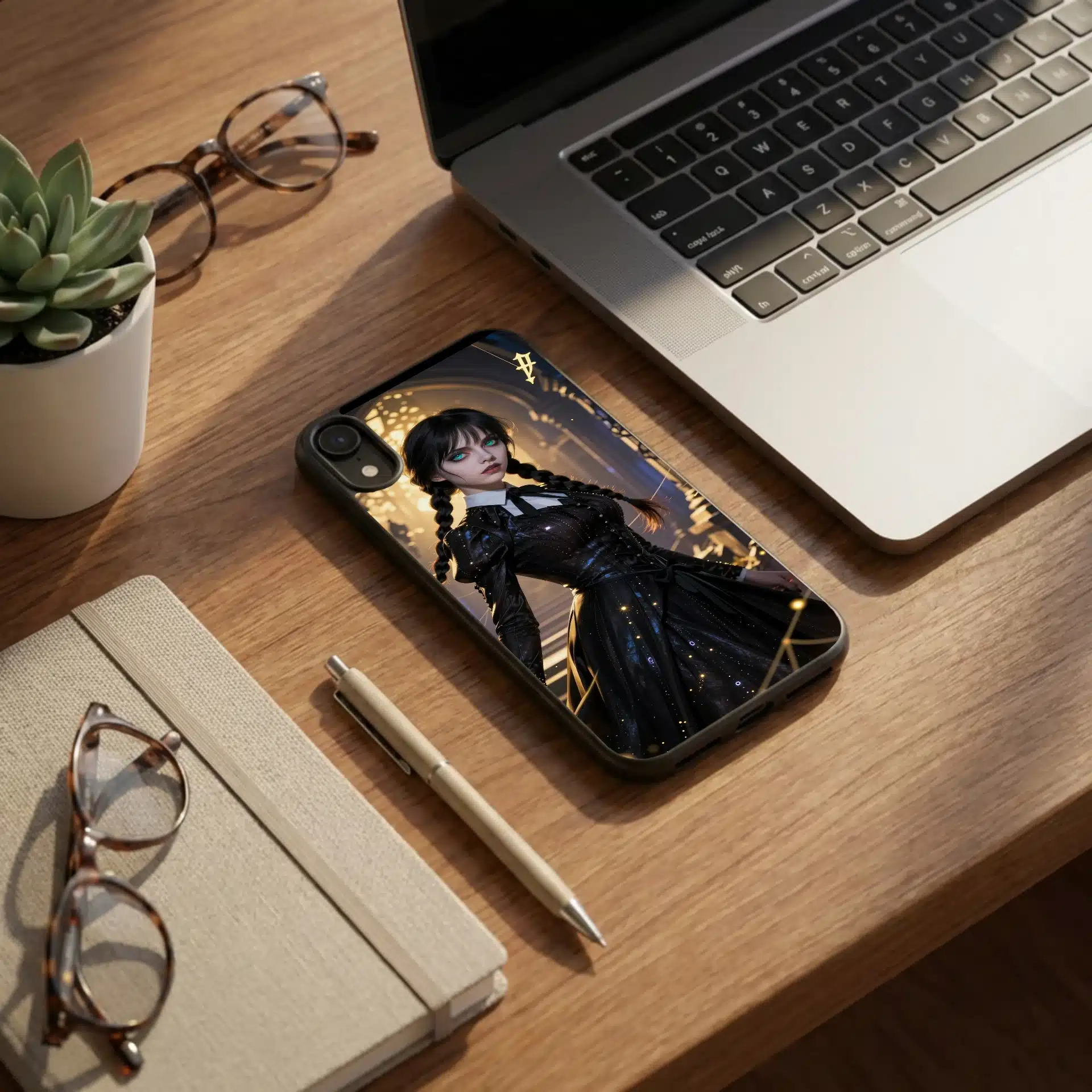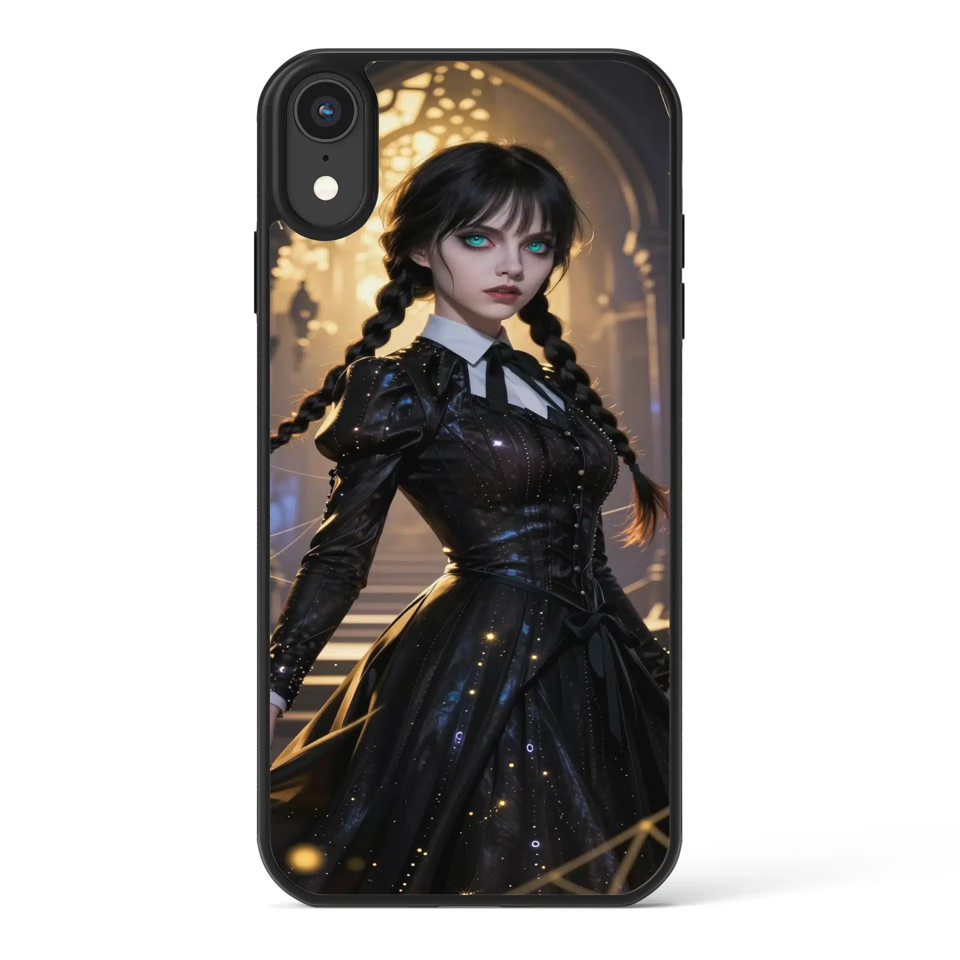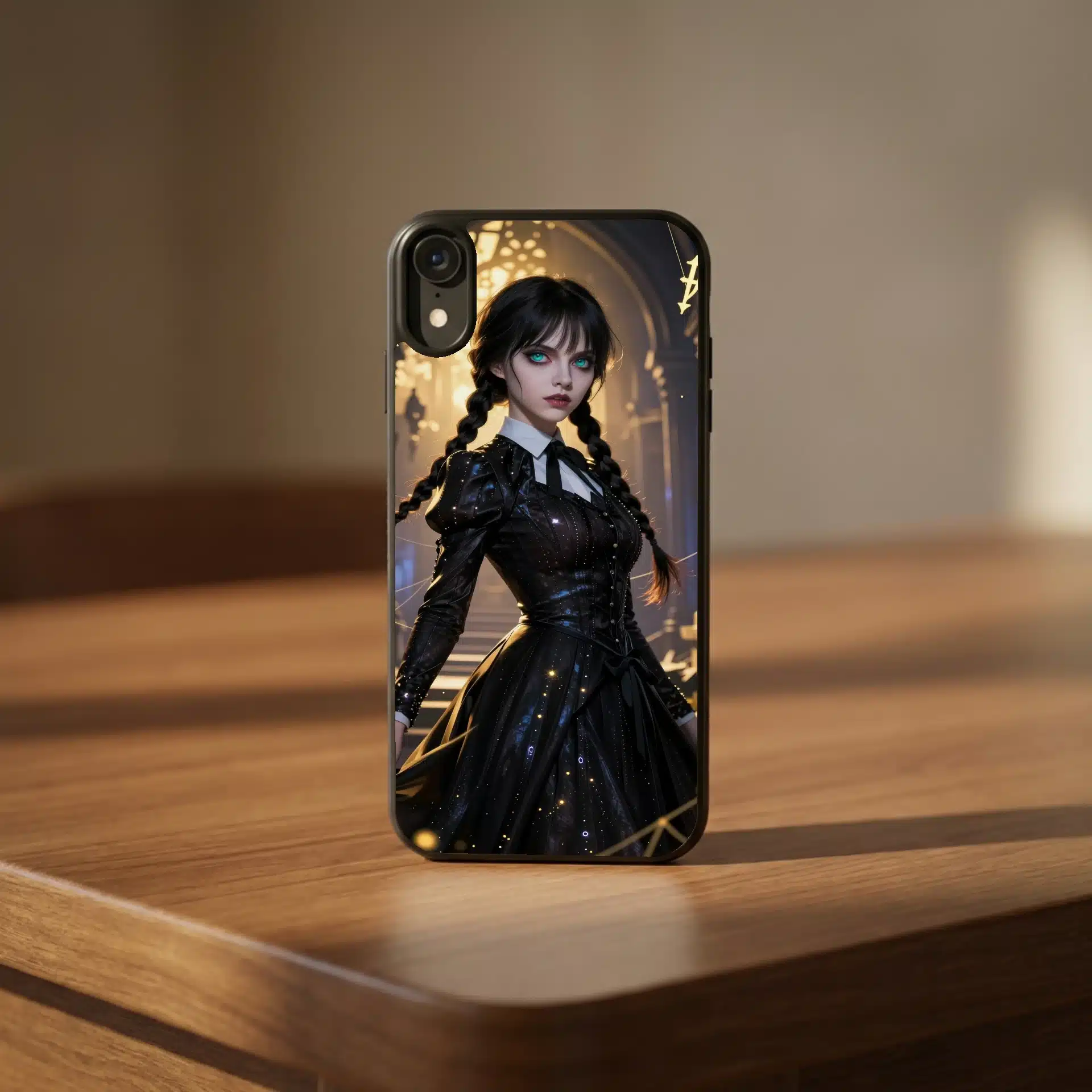 طراحی شامل جزئیات دقیق مانند لباس سیاه روان، اثرات ذرات طلایی، نمادهای گوتیک شناور و تارعنکبوتهای ظریف است که همگی در نور طلایی غروب میدرخشند. تضاد بین سایههای آبی تیره و هایلایتهای طلایی، پوست رنگپریده و بافتهای تیره موهای او را برجسته میکند.