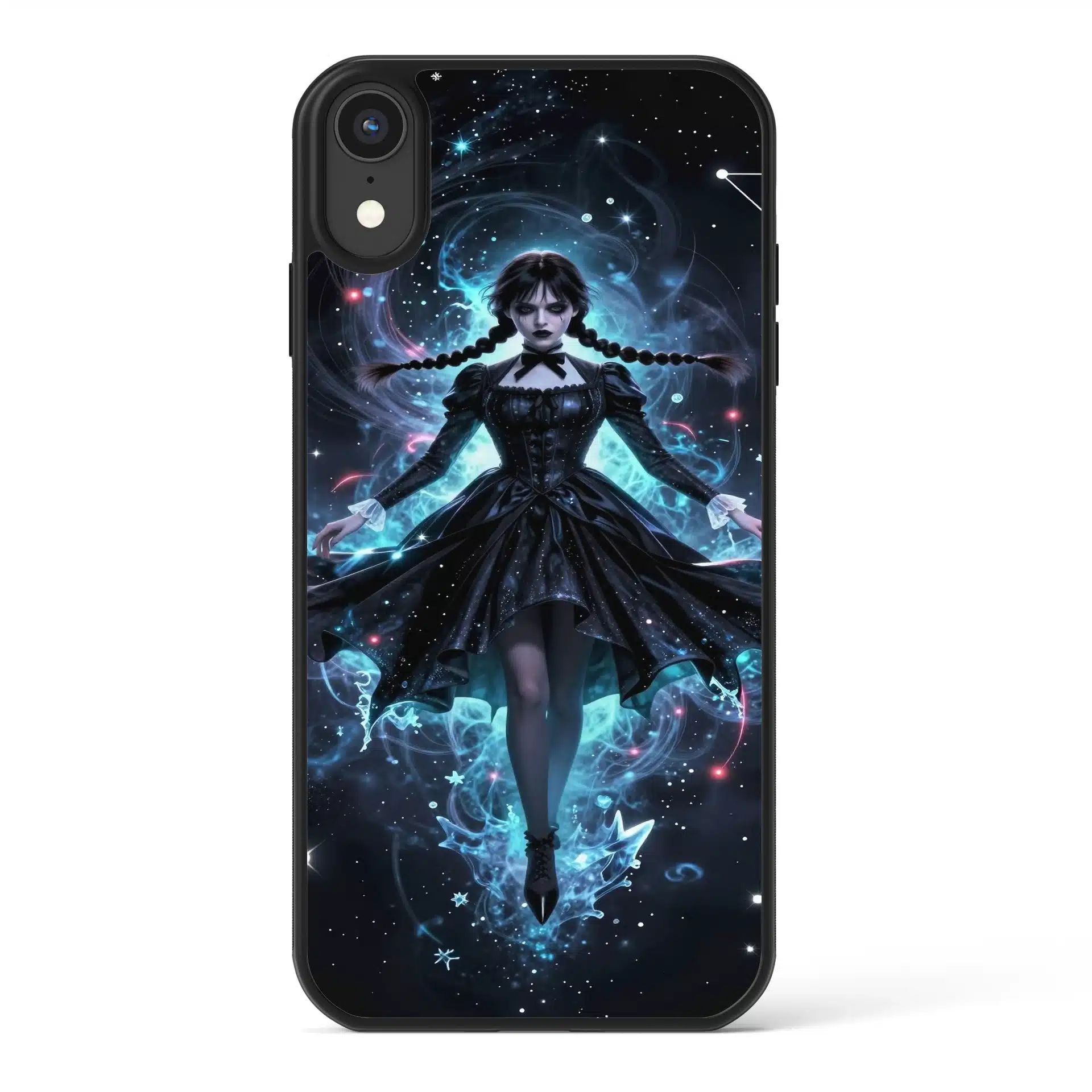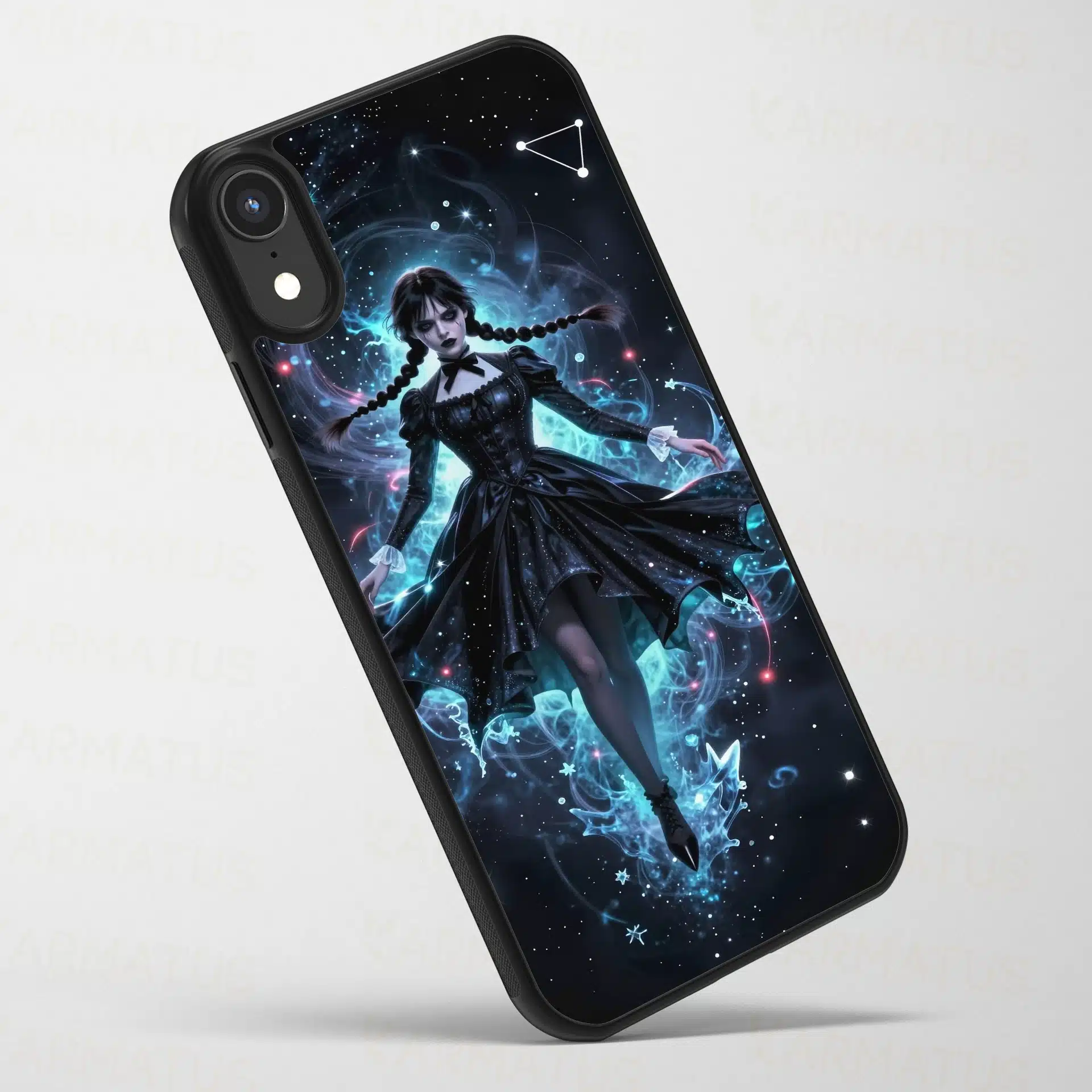 والپیپر انیمهای خیرهکننده از ونزدی آدامز که در فضای یخی شناور است. لباس سیاه نمادین او با بادهای کیهانی در حرکت است و نورهای فرازمینی فیروزهای و مرجانی او را روشن میکنند. ذرات یخی آبی مانند ستارههای یخزده دور او میچرخند و تضاد زیبایی با پسزمینه سیاه و صورتفلکی نقرهای ایجاد میکنند.