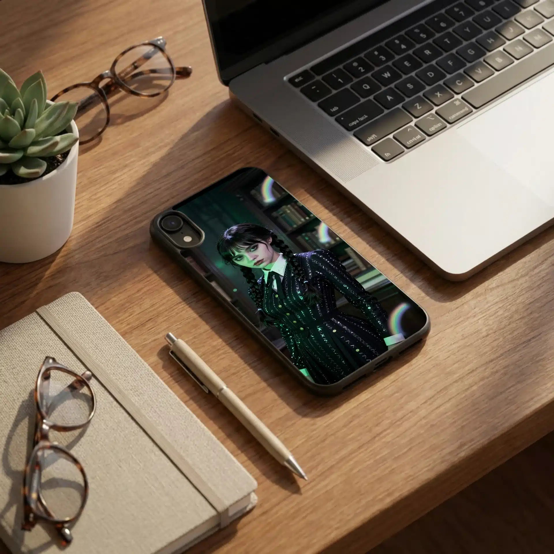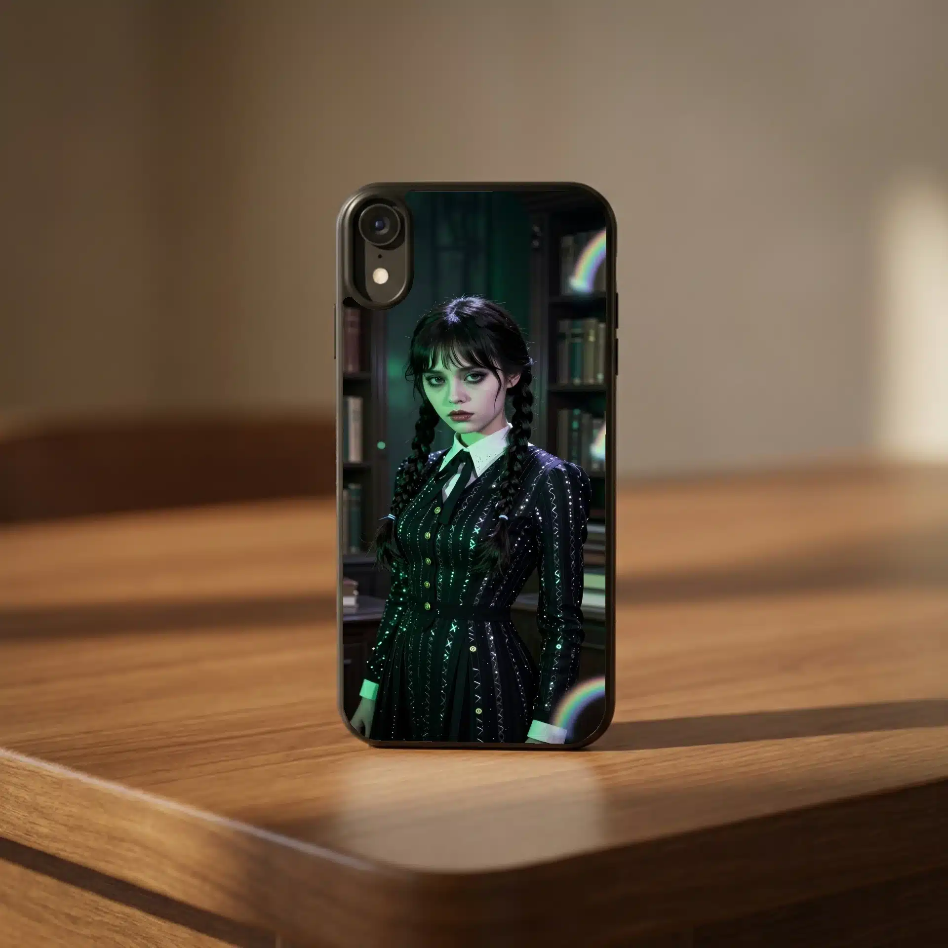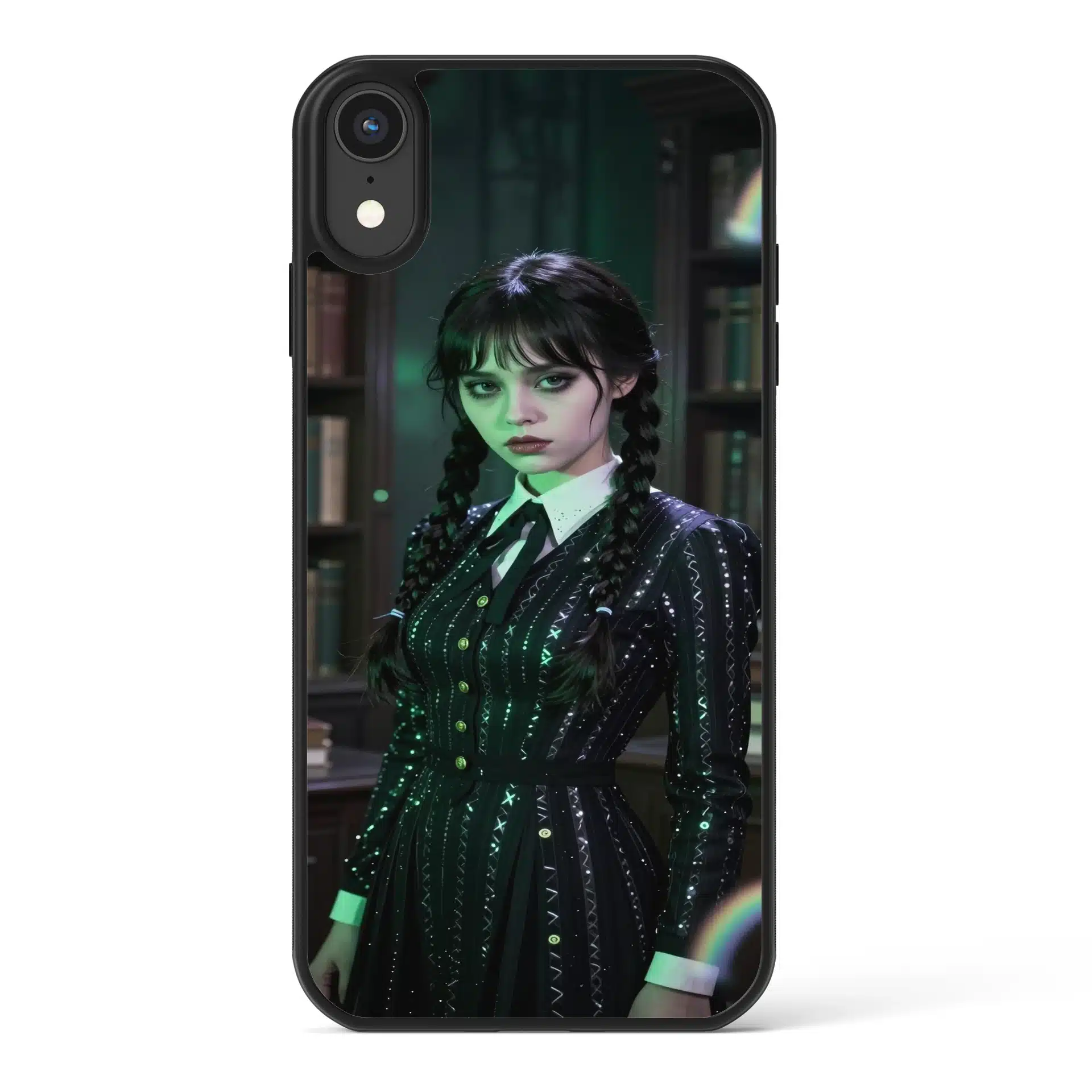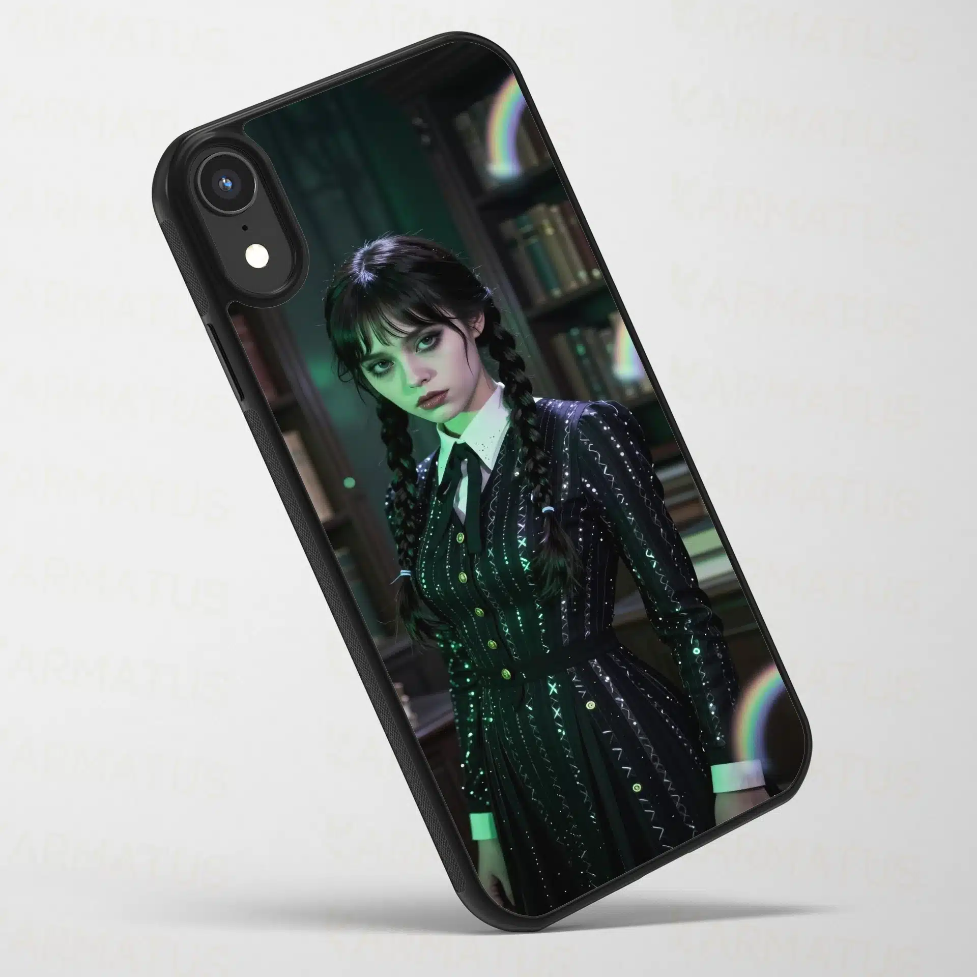ونزدی آدامز در یک پرتره انیمهای تاریک و خیالانگیز، در یک کتابخانه گوتیک با قفسههای بلند کتاب ایستاده است. نور سبز زمردی ملایم که با پوست رنگپریده و موهای بافتهی تیره او تضاد زیبایی ایجاد میکند، فضایی مرموز و جذاب خلق کرده است.