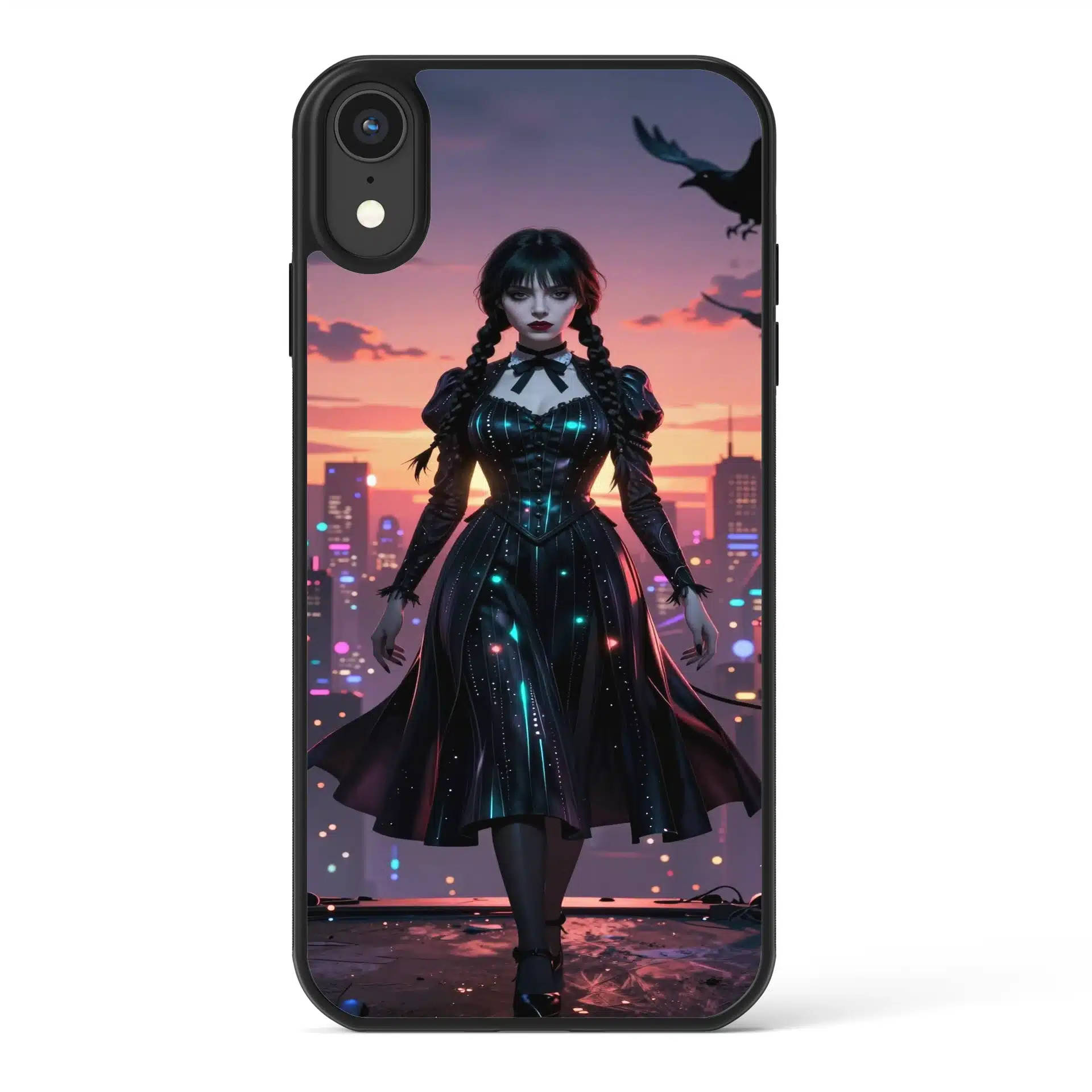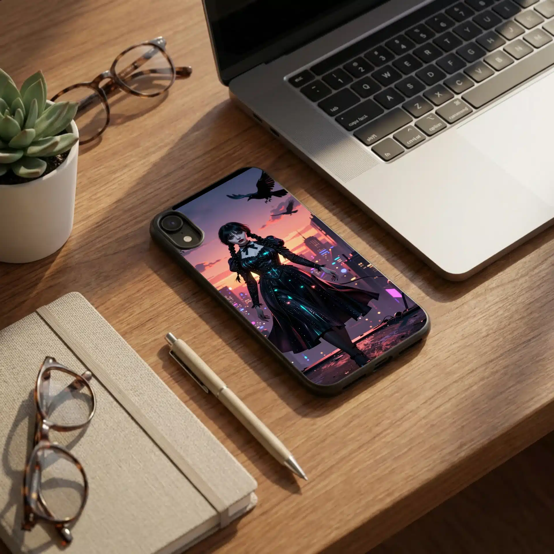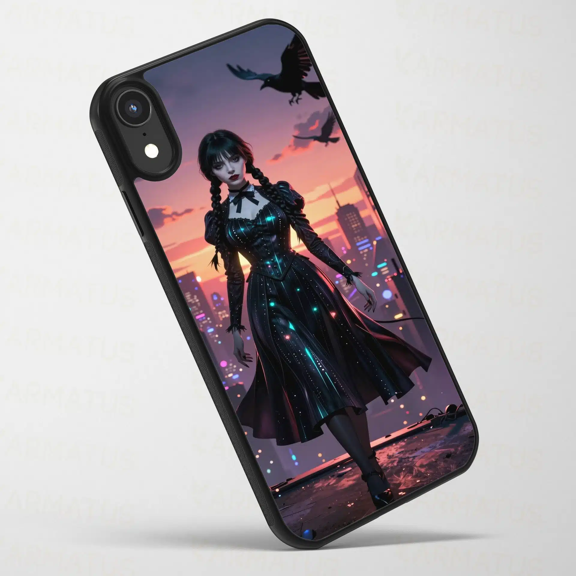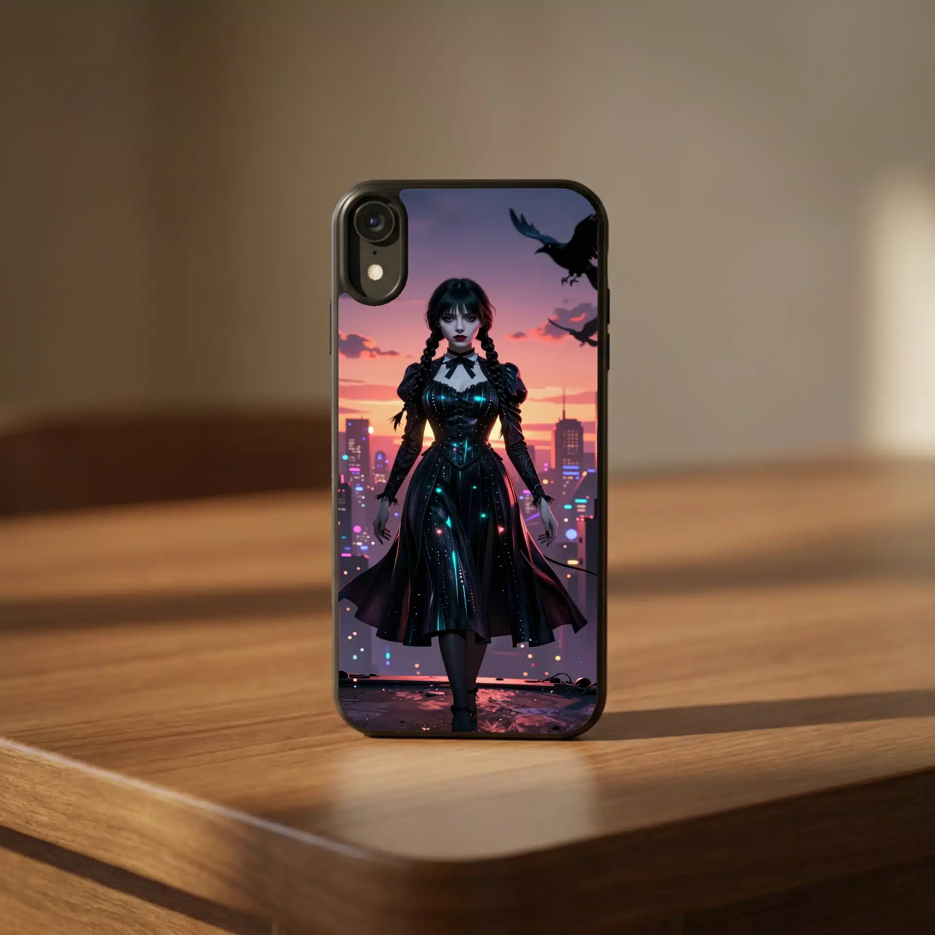 والپیپر انیمهای خیرهکننده از ونزدی آدامز که با اعتماد به نفس در یک شهر نئونی آیندهنگر در غروب آفتاب ایستاده است. لباس سیاه نمادین او با انعکاسهای فیروزهای و مرجانی از نورهای پرجنبوجوش شهر میدرخشد.