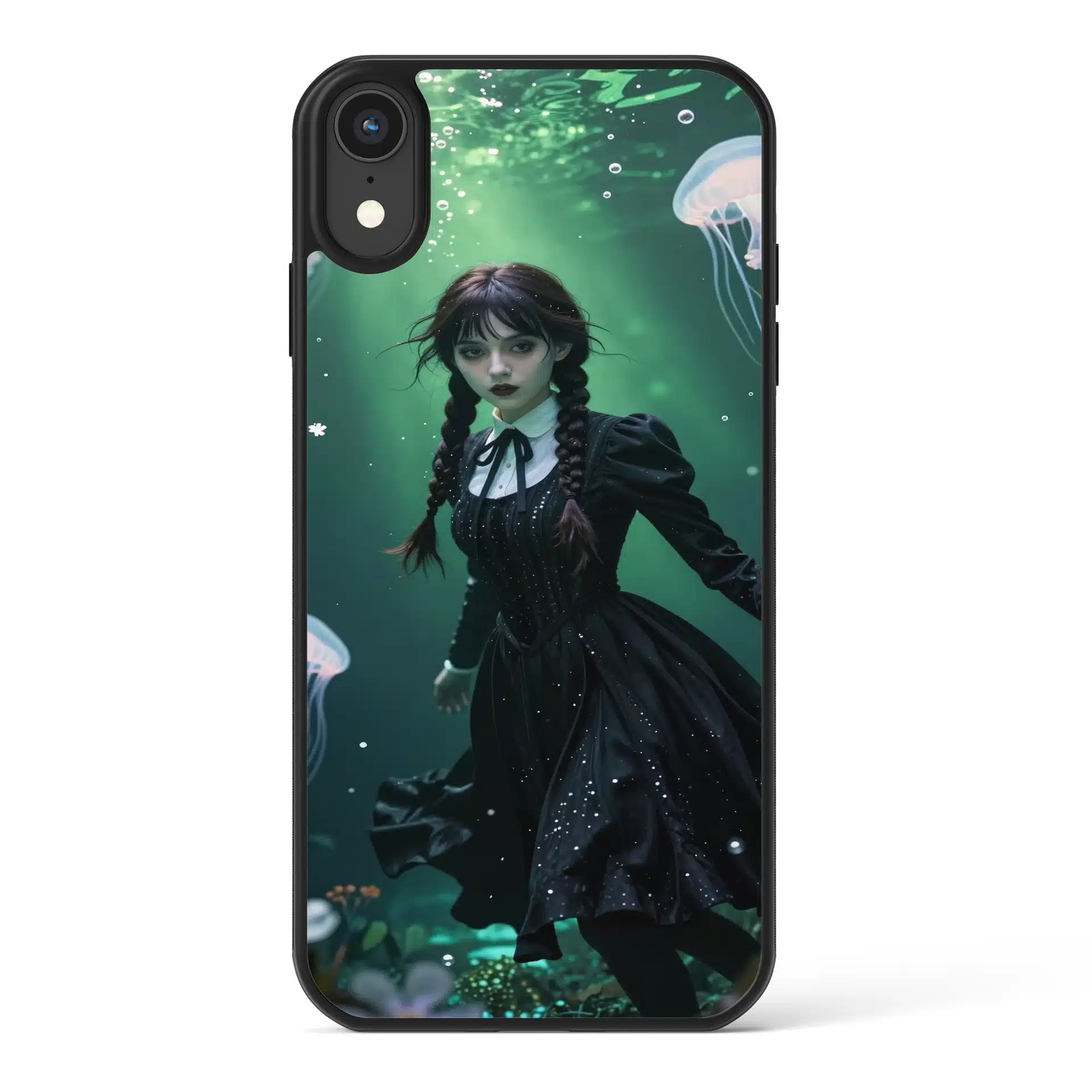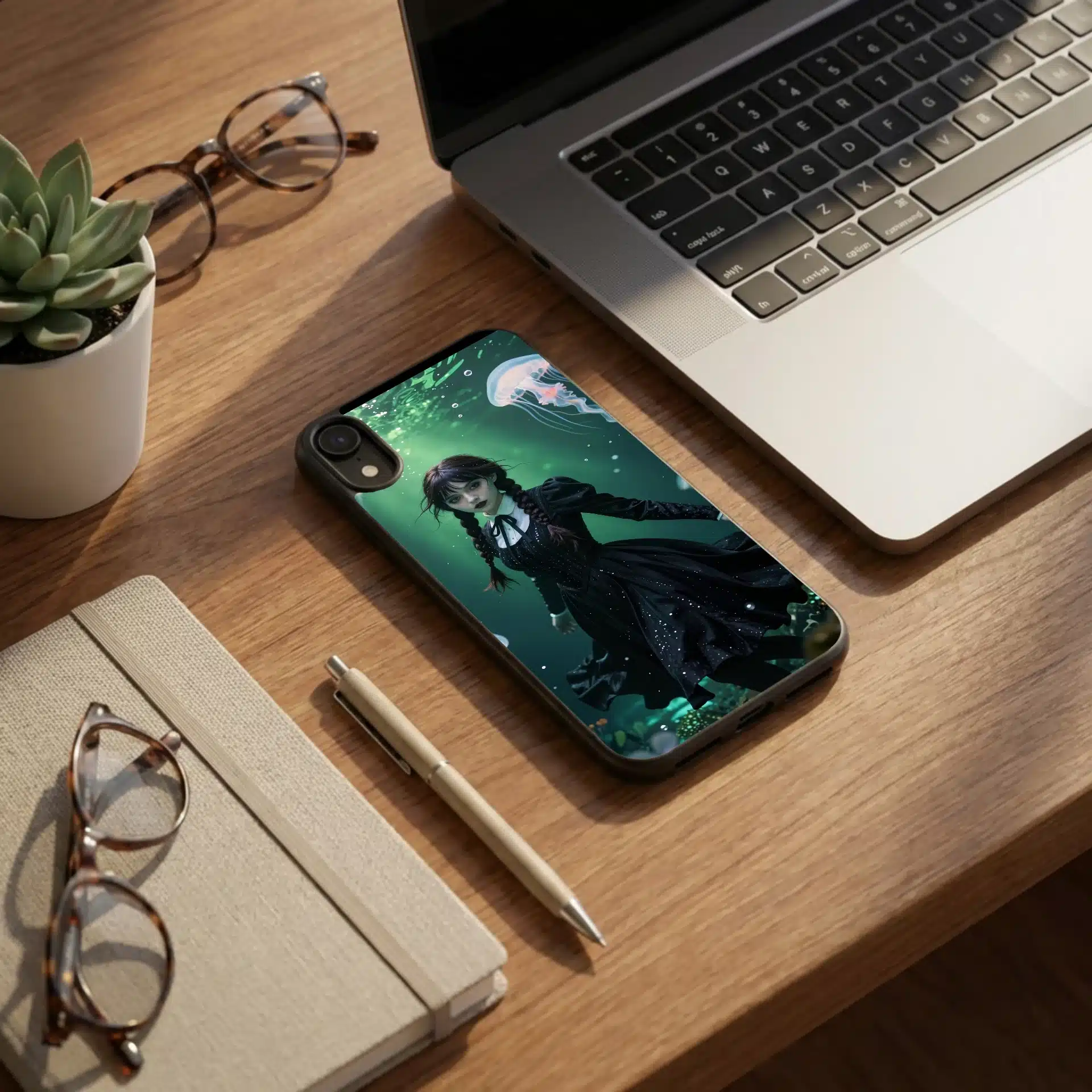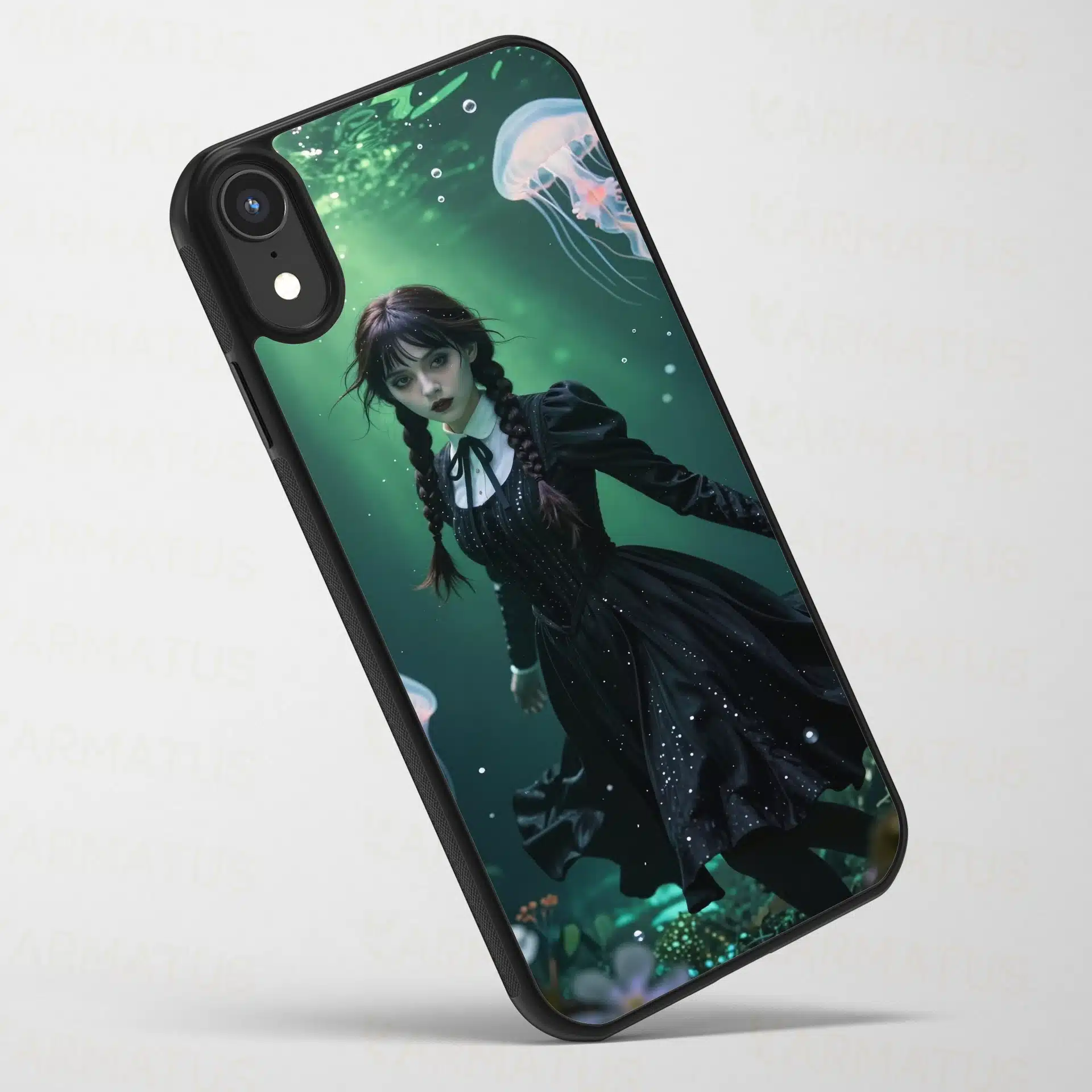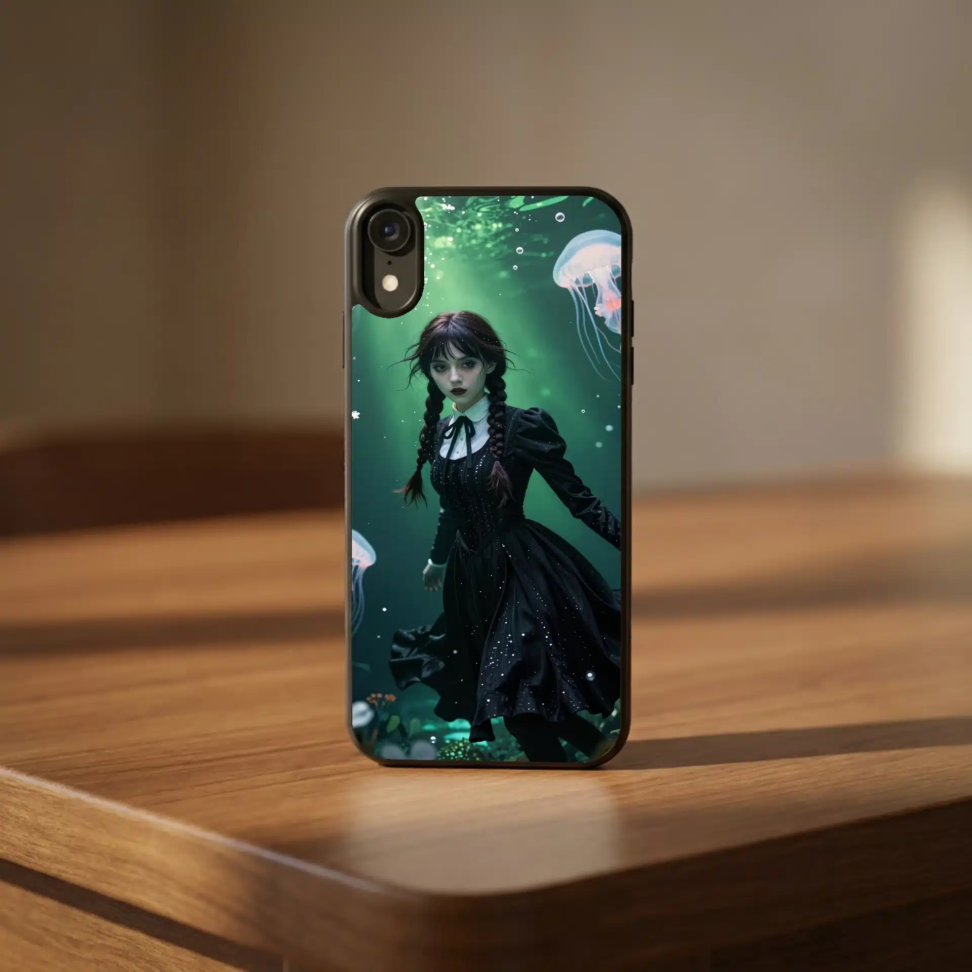 والپیپر انیمهای خیرهکننده از ونزدی آدامز در یک صحنه رویایی زیر آب، با لباس سیاه و یقه سفید معروفش که مانند ابریشم مایع در اعماق زمردی به آرامی موج میزند. نورپردازی سینمایی و عروسکهای دریایی زیستتاب، چهره رنگپریده او را در دنیایی کوچک و جادویی روشن میکنند.