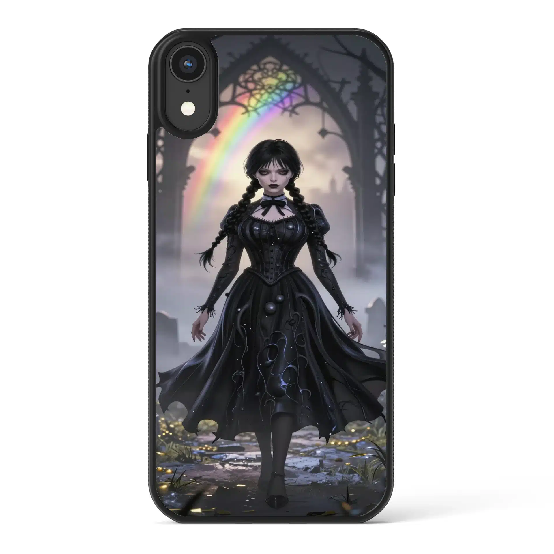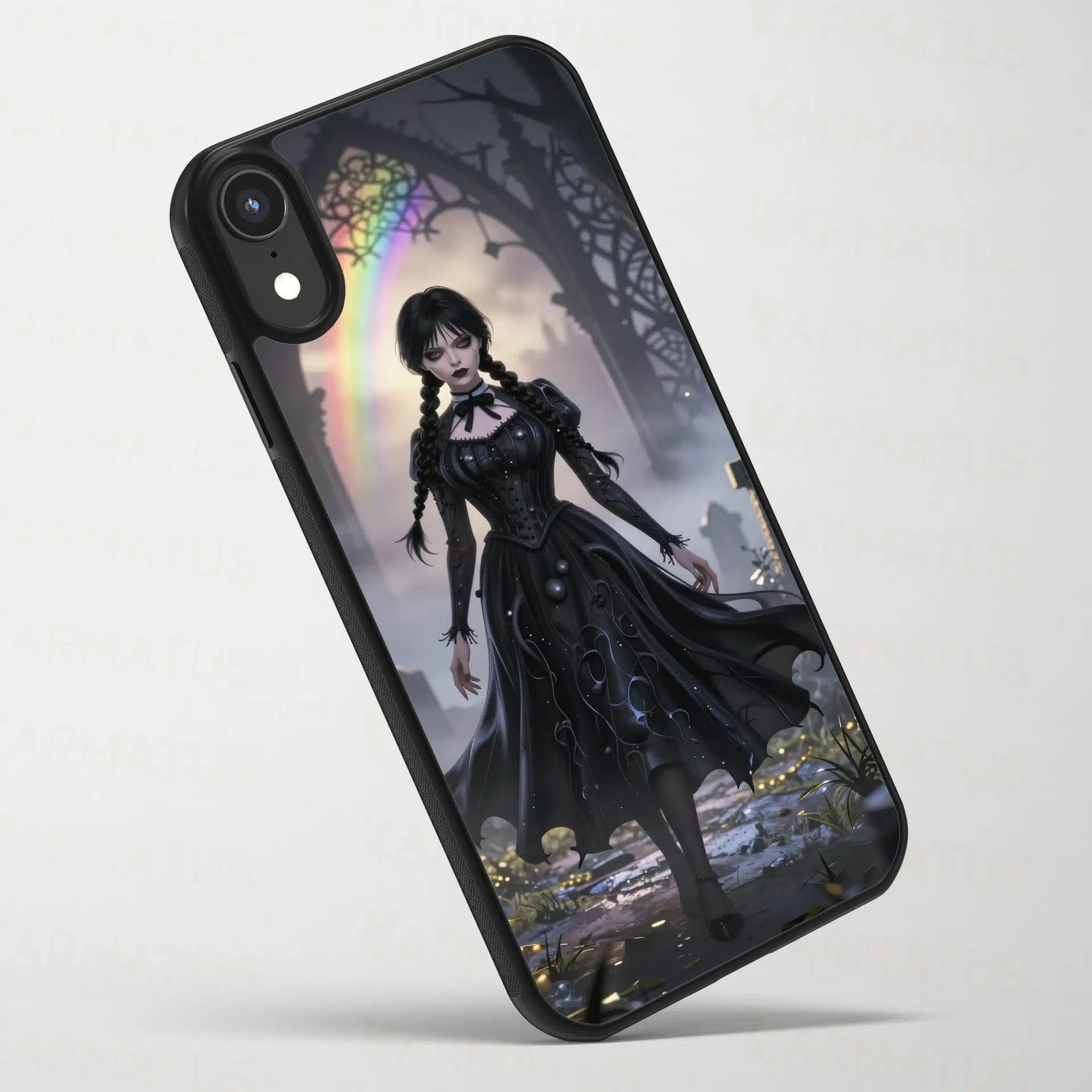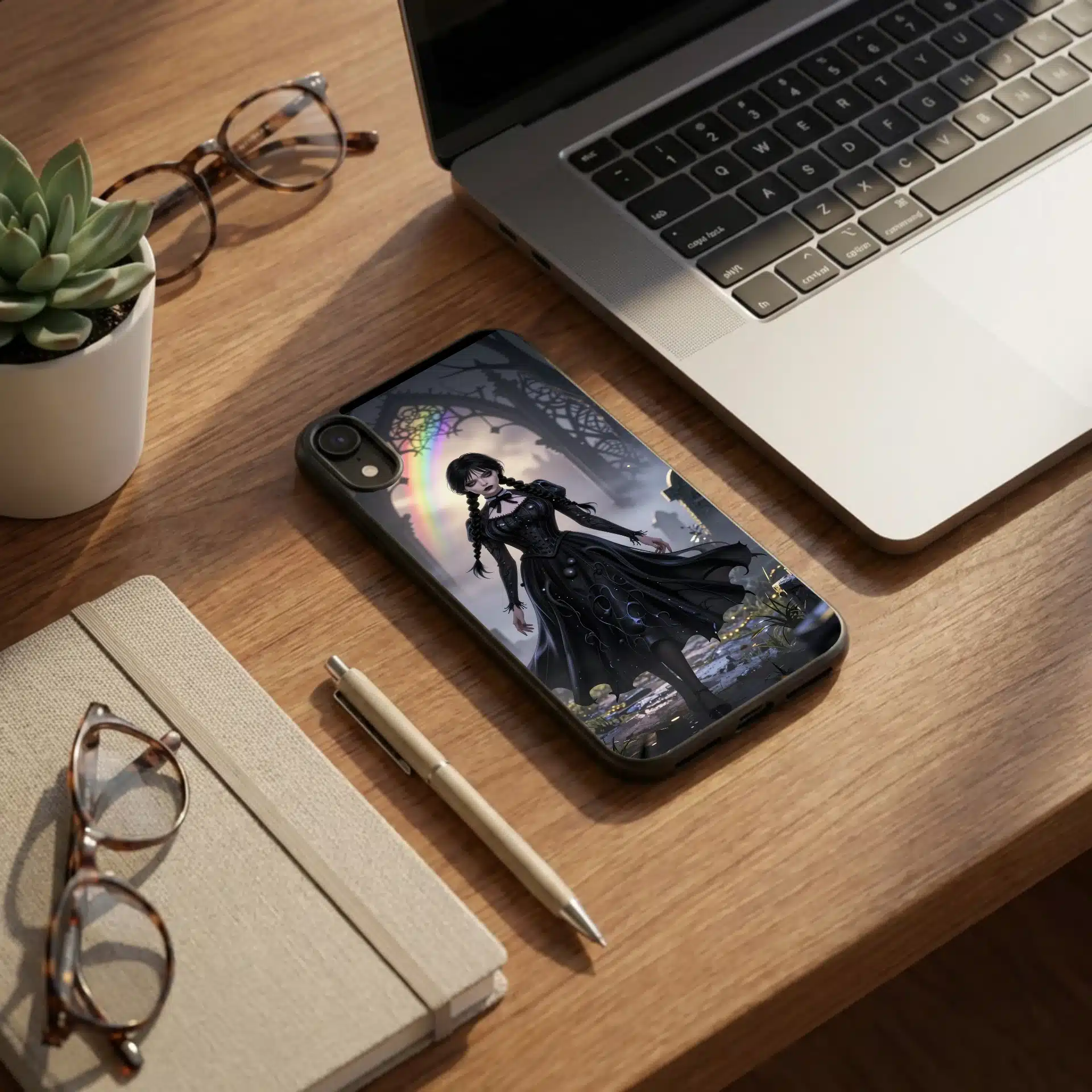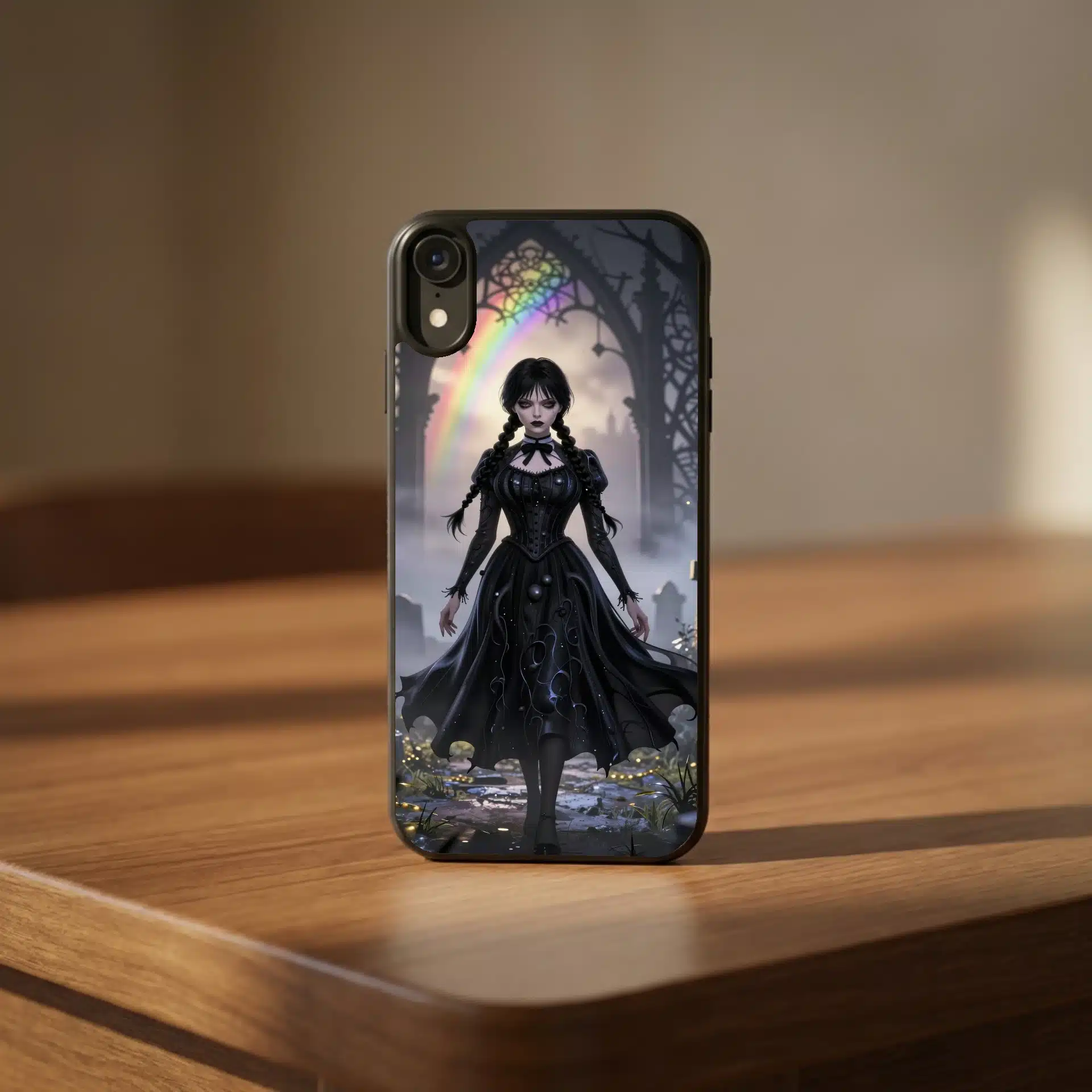 طرحی با جزئیات بالا شامل الگوهای گوتیک در پسزمینه و رنگآمیزی تاریک با سایههای آبی و طلایی که با جلوههای رنگینکمانی ظریف ترکیب شدهاند. چهره خونسرد و معروف ونزدی، این اثر را به یک والپیپر جذاب و منحصر به فرد تبدیل کرده است.