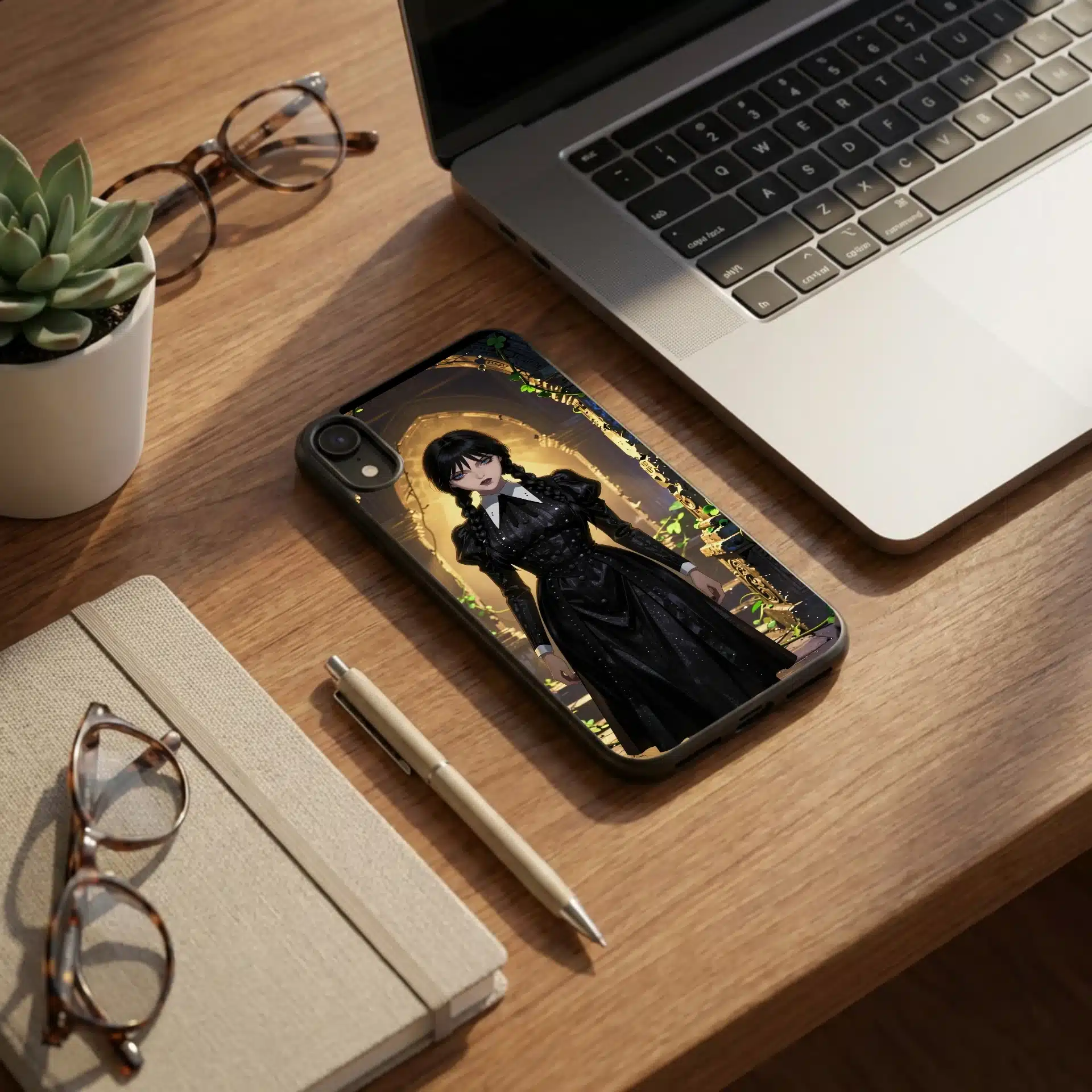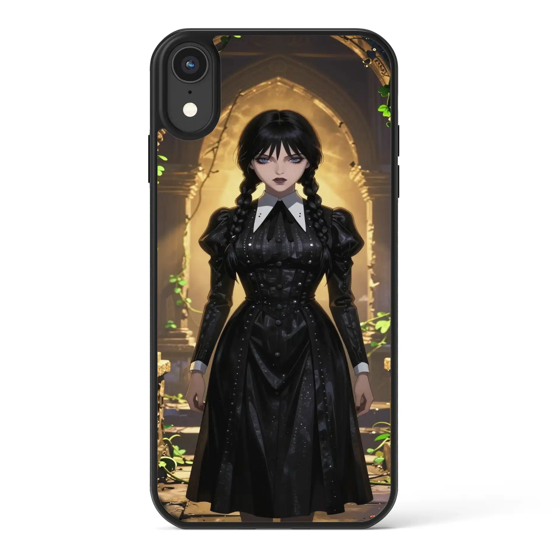 والپیپر انیمهای خیرهکننده با الهام از شخصیت ونزدی آدامز، در حالی که در میان ویرانههای باستانی با حکاکیهای پیچیده ایستاده است. این اثر با نور طلایی گرم و سایههای دراماتیک، حال و هوایی مرموز و جذاب ایجاد کرده است.