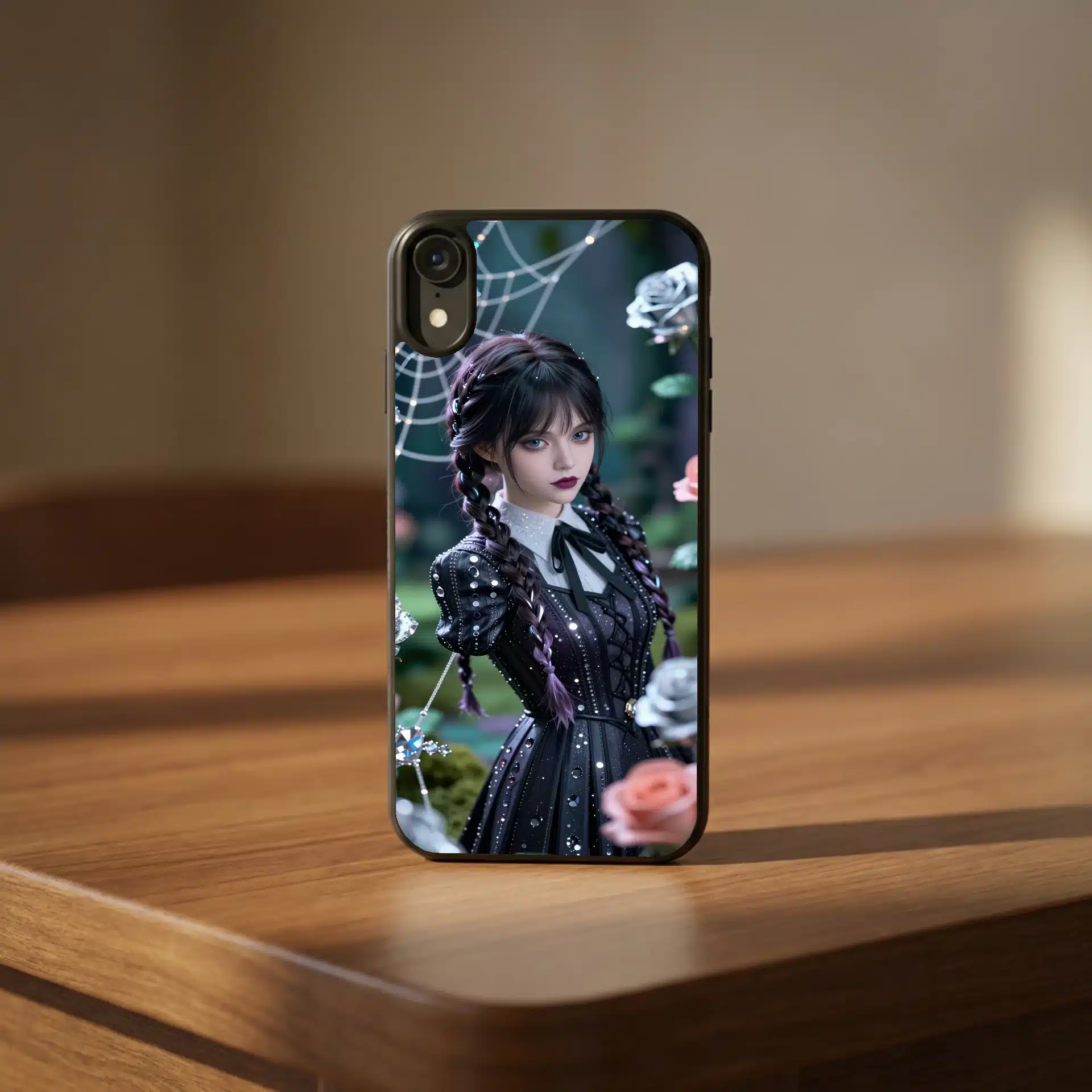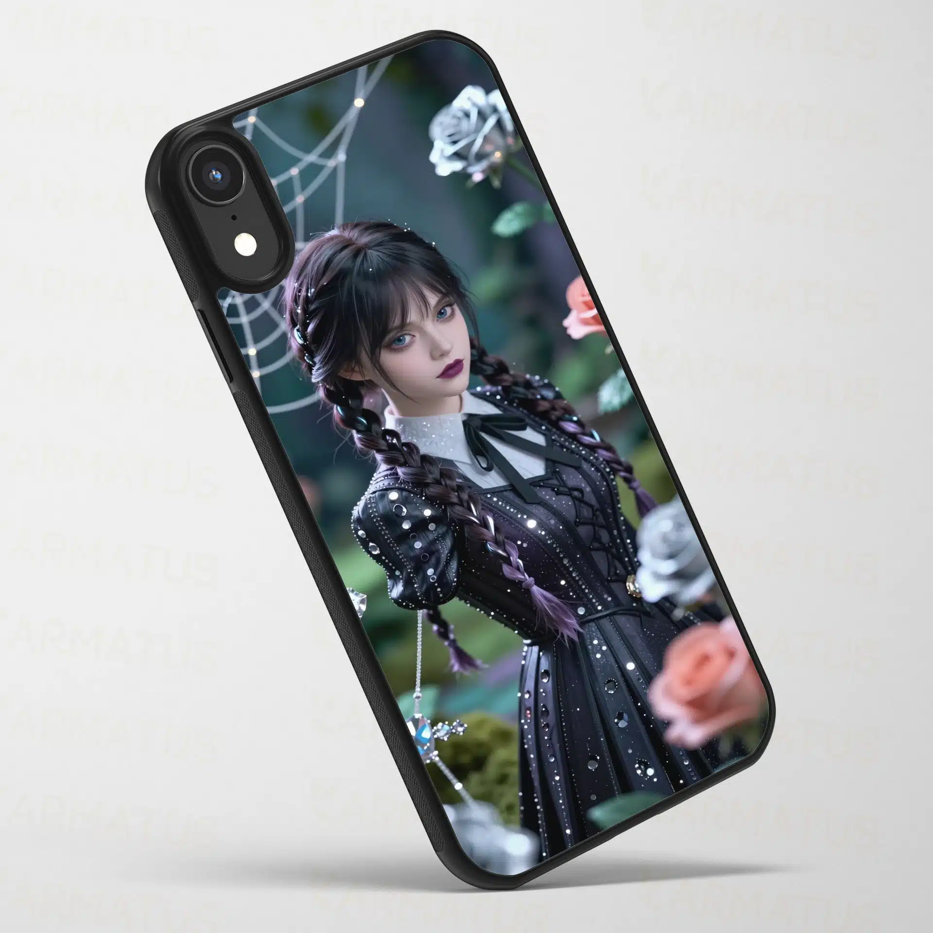 در این تصویر جادویی، ونزدی در باغی گوتیک و رویایی زیر نور ماه به تصویر کشیده شده است. با موهای بافتهی نمادین و چهرهای آرام، او در میان رزهای نقرهای و تارعنکبوتهای الماسگونه میدرخشد.